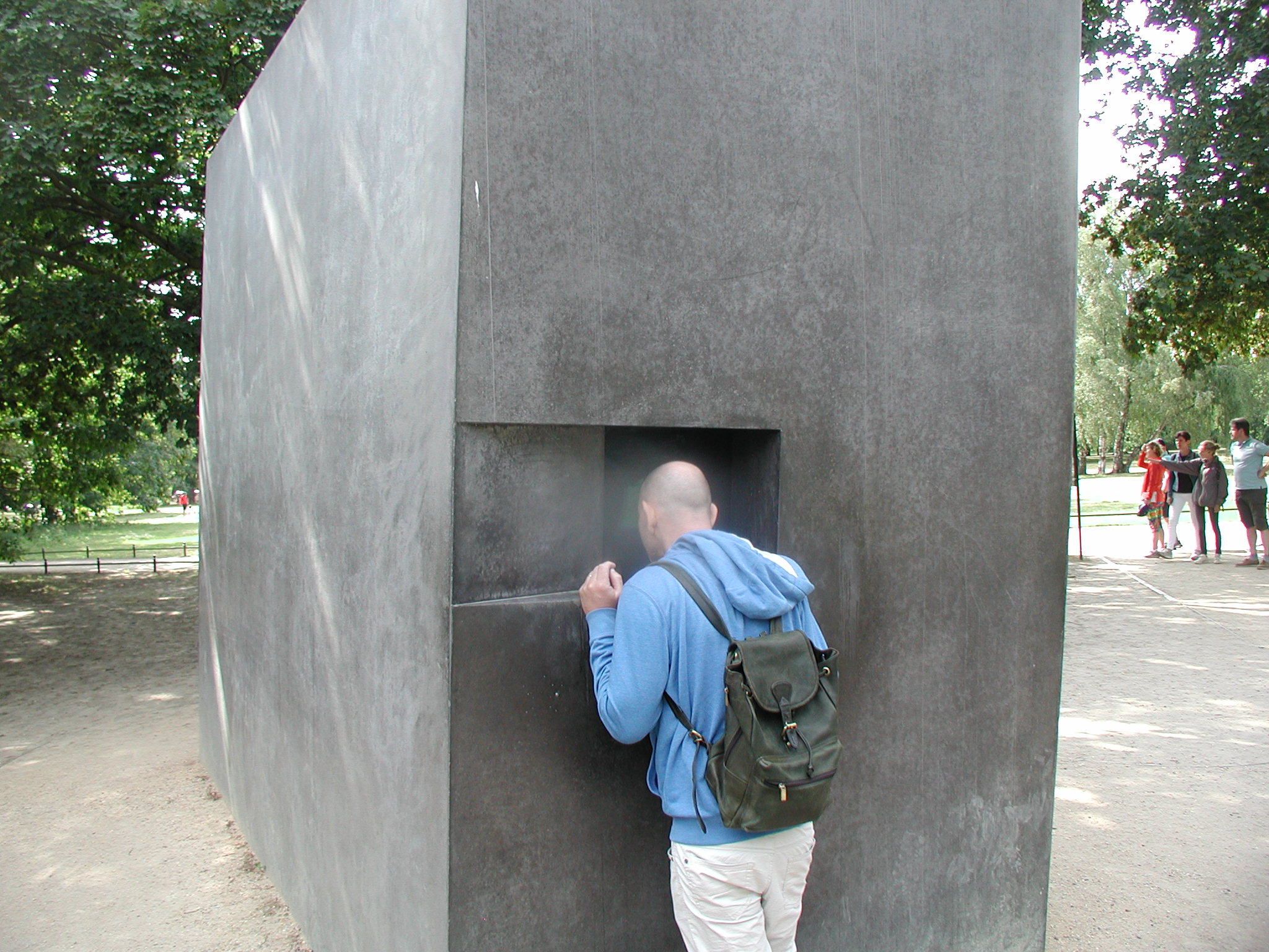 Asymmetrischer großer Feinbetonblock mit Glasfenster zu einem nicht begehbaren Innenraum, vor dessen Rückwand in Dauerschleife eine Filmprojektion zu sehen ist. Am Beginn des Weges von der Promenade an der Friedrich-Ebert-Straße zum Denkmal steht ein Pultlock mit Inschriftentafel.