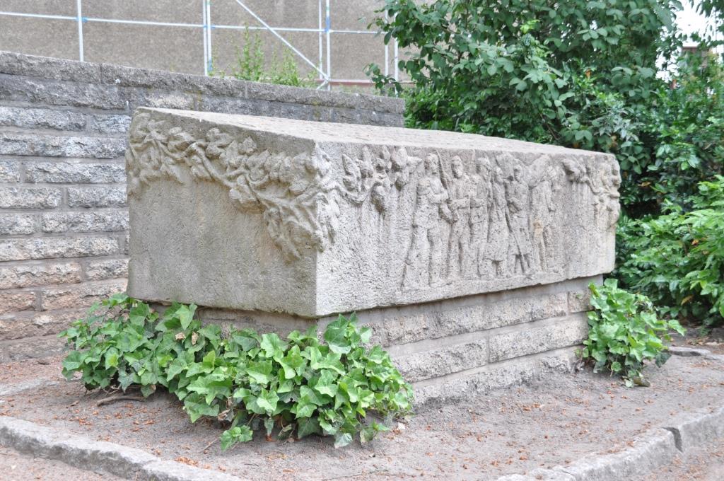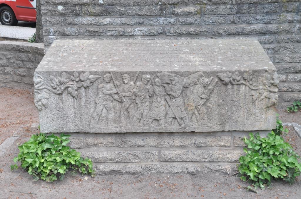 Der pultförmige Sandsteinblock erhöht sich durch die Platzierung auf einem gemauerten Kunststeinsockel, deren Verblendsteine dezent in Natursteinoptik gemauert wurden und dem Sandsteinblock somit seinen Raum lassen. Auf der Oberfläche ist eine zentrierte Inschrift mit 15 Namen gefallener / ermordeter Männer, die beim Kapp-Putsch ihr Leben lassen mussten. Mittig auf der Front sind 6 männliche und bekleidete Ganzfiguren erkennbar. Rechts und links der Reliefdarstellung befinden sich oberhalb Efeuzweige, welche über die Seiten hinausragen und sich um den Sandsteinblock zu schlängeln scheinen. Die rechte, als auch die linke Seite ist sehr zurückhaltend verziert. Hier befinden sich jeweils oberhalb der Fläche die sich weiter schlängelnden Efeuzweige. Auf der Rückseite sind drei Efeubäume dargestellt.Diese sind alle oberhalb des Reliefs miteinander verbunden und verschlungen. Aus diesen Verbindungen lösen sich jeweils vereinzelte Äste und formen sich zu einzelnen Vignetten, welche Gesichter enthalten. Die Gesichter sind leider nicht mehr vollständig zu identifizieren, so dass sie nur schwer einzelnen Personen zugeordnet werden können (Dominique Mißbach).