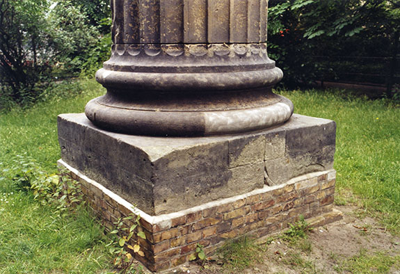 Vor den beiden gartenseitigen Ausgängen des Gebäudes stehen jeweils zwei Paar dorische Sandsteinsäulen der 1857 nach Entwurf von August Stüler an der Charlottenburger Brücke errichteten und 1908 abgerissenen Steuerhäuser. Zusätzlich als Architektur zu erwähnen sind die Reste der ehemaligen, 1886 abgerissenen, Borsigschen Fabrik von Johann Heinrich Strack (Bückeburg 6.7.1805 – 13.6.1880 Berlin) aus dem Jahr 1857, die auf dem TU-Campus aufgestellt worden sind, bestehend aus Ziegelmauerwerk, Gewölbe mit glasierten gelblichen Ziegeln, Putten als Konsolfiguren und Terrakottareliefs (Susanne Kähler, Jörg Kuhn).