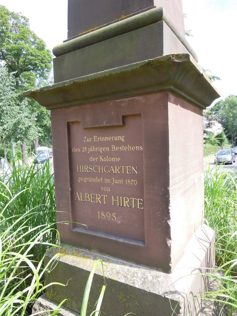 »Zur Erinnerung / des 25 jährigen Bestehens / der Kolonie / HIRSCHGARTEN / gegründet im Juni 1870 / von ALBERT HIRTE / 1895«