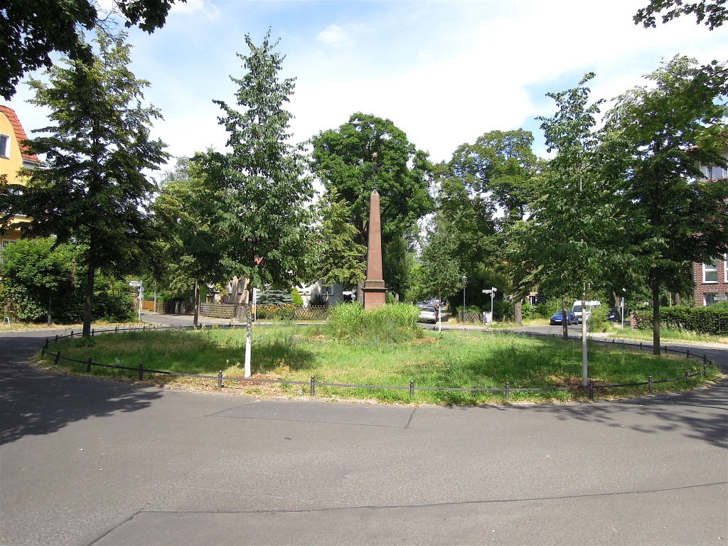 Aufgestellt 1895 anläßlich des 25. Jubiläums der Villenkolonie Hischgarten zu Ehren ihres Gründers, des Bankiers Friedrich Wilhelm Albert Hirte (1833-1898, beigesetzt auf dem Alten Luisenstädtischen Friedhof am Südstern in Berlin-Kreuzberg). Der damalig Sternplatz genannte Platz wurde 1920 in Hirteplatz umbenannt. Die Restaurierung des völlig verwahrlosten Obelisken fand 2001 statt. Aus diesem Anlass fertigte der Kunstschmied Hans-Joachim Kunsch eine Nachbildung der durch historische Photografien in dieser Form belegten Spitze und der Steinmetz Nobert Lahr erneuerte die Sockelinschrift. Der Bezirk Treptow-Köpenick ließ die für 1895 belegten Linden wieder anpflanzen und ein Urenkel von Hirte, Dr. Schwartz, initiierte 2007 die Aufstellung von vier so genannten Schinkelleuchten (Jörg Kuhn auf der Grundlage des Textes von Monika Hemmer "Der Obelisk in Hirschgarten", vgl. httpp://www.friedrichshagen.net/historisches/zeit-fenster/der-obelisk-in-hirschgarten/ , abgerufen 29.07.2019). Der Neorenaissancebrunnen auf der Terrasse des Märkischen Museums am Köllnischen Park hatte ursprünglich seinen Standort auch in der Kolonie Hirschgarten (Jörg Kuhn).