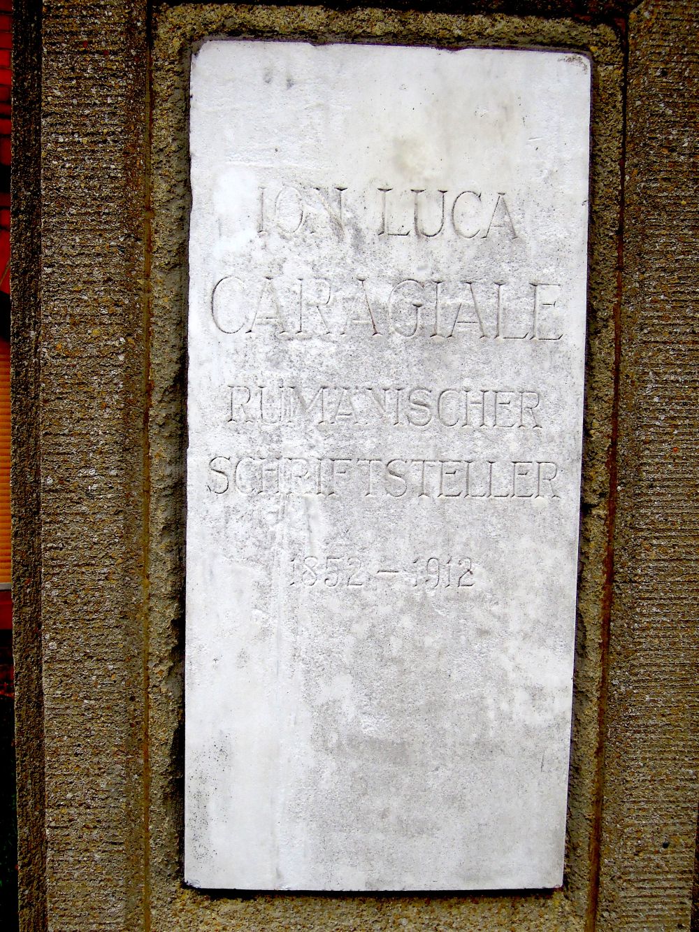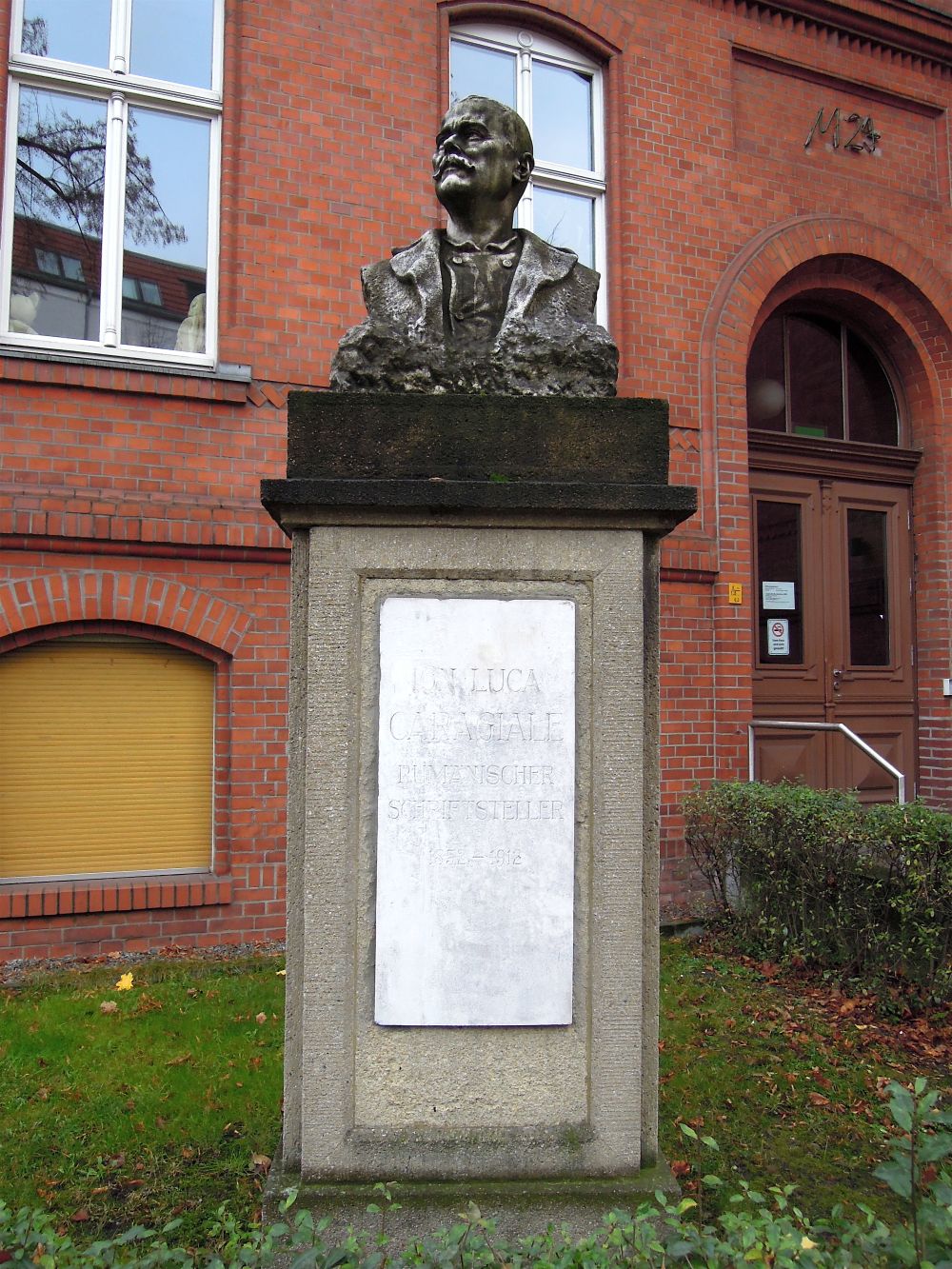 Das Denkmal steht vor dem 1896 errichteten ehemaligen jüdischen Lehrlingsheim. Ende 1939 räumten die Nationalsozialisten das Haus und vertrieben die Lehrlinge und Erzieher, von denen viele später in den NS-Vernichtungslagern ermordet wurden. Nach dem Zweiten Weltkrieg wurde das Gebäude umgebaut und als Stadtbezirksbibliothek Pankow betrieben. 1954 wurde der Bibliothek der Name des rumänischen Schriftstellers Ion Luca Caragiale verliehen. Zur Erinnerung an Caragiales Berlinaufenthalt und sein Wirken schenkte die damalige rumänische Botschaft 1955 dem Ostberliner Magistrat von Groß-Berlin die Stele mit der Büste des Schriftstellers, ein Werk des rumänischen Bildhauers Constantin Baraschi, die vor der Bibliothek ihre Aufstellung fand (s.: "Caragiale-Büste in Pankow eingeweiht", in: Neues Deutschland vom 04.08.1955). 2001 zog die Ion-Luca-Caragiale-Bibliothek in das ehemalige jüdische Waisenhaus in der Berliner Straße 120/121 und erhielt den neuen Namen Janusz Korczak. Aus Anlass des 100. Todestages wurde 2012 die Stele gereinigt (vom Hausmeister mit Wasserdampf!; vgl.: Langfeldt, Gisela: "Caragiale-Denkmal in neuem Glanz", in: Mitteilungsblatt Freundeskreis der Chronik Pankow (2012) Heft 4, S.14-15; "Büste des Dramatikers Ion Luca Caragiale wurde gereinigt", in: Berliner Woche vom 14.03.2013). Das Denkmal für den größten rumänischen Dramatiker und Novellisten Ion Luca Caragiale (1852-1912) ist das einzige Erinnerungsmal für ihn außerhalb Rumäniens. Der in Rumänien angefeindete Caragiale emigrierte 1904 nach Berlin und lebte dort bis zu seinem Tod. Caragiales Meisterwerk „O scrisoare pierduta“ (1884, Der verlorene Brief) stellt eine scharfe Kritik des politischen Lebens in Rumänien dar. Zielscheibe ist hier vor allem das neue Bürgertum Bukarests, das sich nur schwer den neuen Zivilisationsformen anzupassen vermochte. Ebenso richtet sich die Kritik gegen den Verwaltungsapparat, das Erziehungssystem und den scheindemokratischen Charakter des politischen Lebens (Jürgen Tomisch).