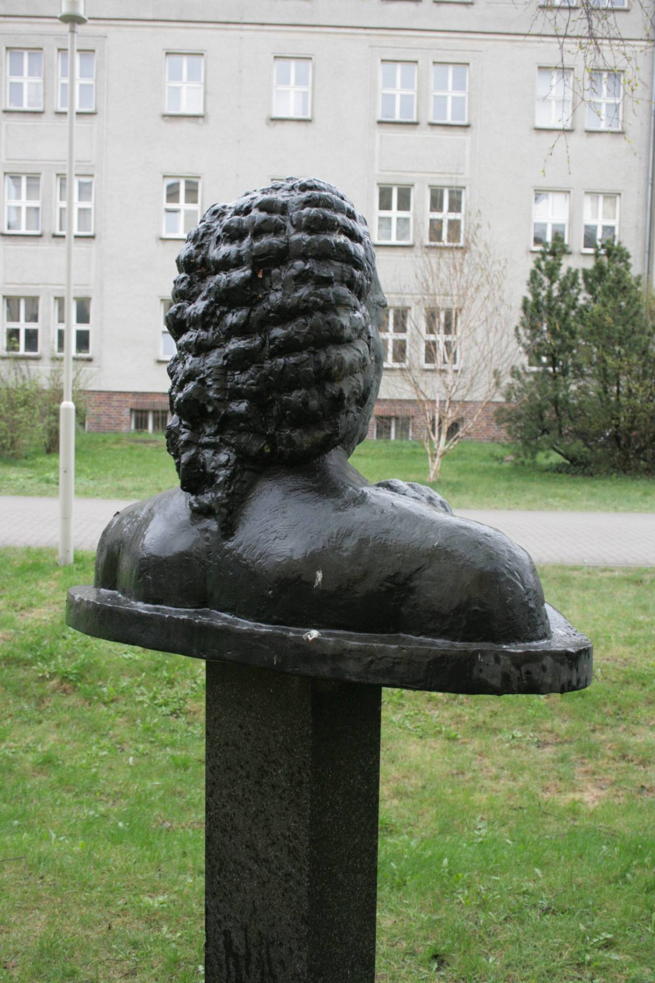 Auf einem oktogonalen Granitpfeiler mit Sockel -vermutlich Zweitverwendung eines Grabsteinelements – steht auf flacher, breitgelagerter Plinthe die Bronzebüste und Armansätzen mit Händen von Johann Sebastian Bach. Der Barockkomponist ist in zeitgenössischer Kleidung und mit Allongeperücke dargestellt. Er hat die Augen geschlossen – gemeint ist ein Zustand der Konzentration -, die Hände sind wie zum Dirigieren erhoben. Die Oberfläche der Bronze ist impressionistisch bewegt formuliert. Auf dem Pfeiler rechts ist eine vertiefte Inschrift zu finden (Jörg Kuhn, Susanne Kähler).