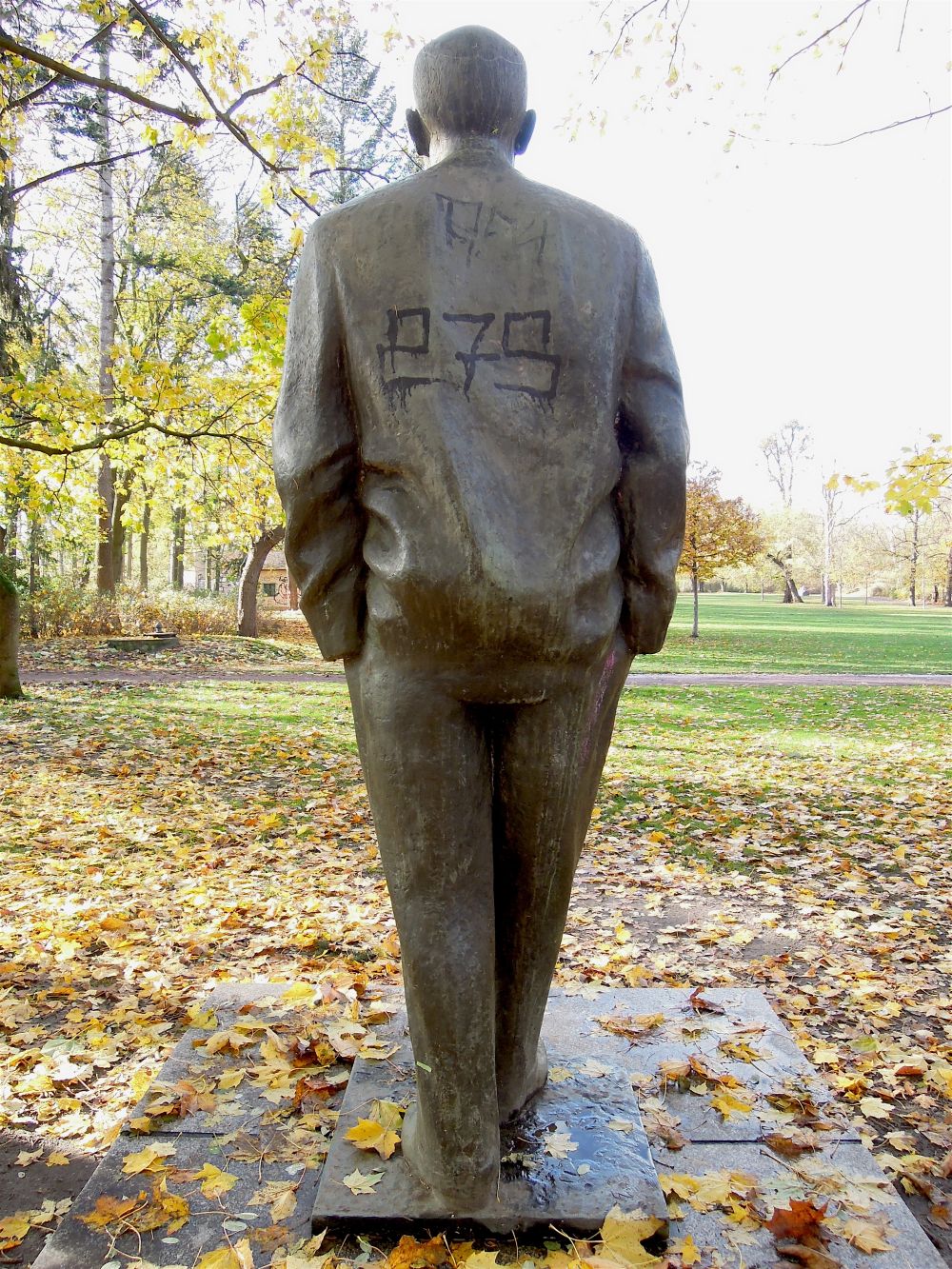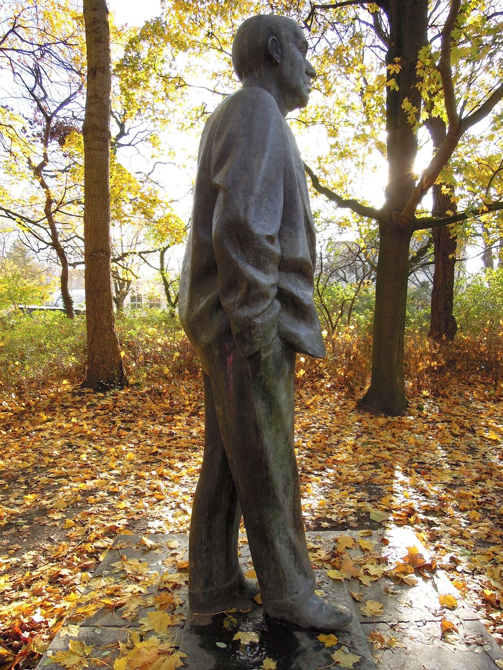 Nach dem Tode von Johann R. Becher 1958 wurde Fritz Cremer vom Ministerium für Kultur der DDR mit der Schaffung eines Denkmals zu Ehren Bechers beauftragt. 1960 modellierte Cremer, der den Dichter persönlich kannte, zunächst eine ganzfigurige Bronzestatuette. Die Kleinplastik zeigt den Dichter, wie in der späteren großen Fassung, als lässig dahinschreitenden Passanten, so wie Cremer ihn häufig begegnete, „denn beide hatten nur wenige Straßen voneinander entfernt in Berlin-Niederschönhausen gewohnt“ (s.: "Warum Becher in den Bürgerpark kam": http://www.mythenpflege.de/content/warum-becher-den-bürgerpark-kam", abgerufen 12/2018). Allerdings bleibt in dieser ersten Fassung Bechers Blick hinter dicken Brillengläsern verborgen, die Sonnenbrillengläser anklingen lassen. Vermutlich 1964 folgte die Umsetzung in eine überlebensgroße Bronzeskulptur, die Becher jetzt ohne Brille zeigt. Die Staue bekam dadurch ein wenig Pathos verliehen. Ihre Aufstellung war am Molkenmarkt im Bereich des ehemaligen Arbeitssitzes von Becher als erstem DDR-Kulturminister gedacht, der Sockel blieb aber verwaist. „Ein sozialistischer Minister mit den Händen in den Hosentaschen! Eine solche Provokation konnte nicht geduldet werden. Die Aufstellung der Plastik vor dem Ministerium wurde untersagt“ (s.: "Warum Becher in den Bürgerpark kam": http://www.mythenpflege.de/content/warum-becher-den-bürgerpark-kam, abgerufen 12/2018). Stattdessen wurde 1964 ein Abguss der Becher-Statue anlässlich des 73. Geburtstag des Dichters (enthüllt 22. Mai) in Bad Saarow aufgestellt, dort, wo Becher bis zu seinem Tode in seinem Sommersitz am Friedrich-Engels-Damm gelebt hatte (s.: "Zum 73. Geburtstag Johannes R. Becher", in: Berliner Zeitung vom 22. Mai 1964). Die für Berlin geplante Statue war lange eingelagert und fand erst 1976 im Pankower Bürgerpark ihren Platz. Johannes R. Becher (1891-1958) wohnte von 1945 bis 1958 nicht weit vom Bürgerpark entfernt am Majakowskiring 34 im Pankower Ortsteil Niederschönhausen. In seinem Haus wurde das Johannes-R.-Becher-Archiv 1964 eingerichtet. Becher wirkte einflussreich als Dichter und Kulturpolitiker während der ersten Jahre der DDR. Er gehörte seit 1923 der KPD an und emigrierte 1935 in die UdSSR. Von 1945 bis 1958 war er Präsident des Kulturbundes zur demokratischen Erneuerung Deutschlands, zunächst in der sowjetischen Besatzungszone, später ab 1954 Minister für Kultur der DDR und von 1953 bis 1956 Präsident der Akademie der Künste der DDR. Becher war Verfasser des Textes der Nationalhymne der DDR. Der Bürgerpark Pankow gehört neben den Schlossparks Niederschönhausen und Buch und dem Brosepark zu den grünen Wahrzeichen Pankows. Er wurde 1854 auf einem ehemaligen Mühlengrundstück angelegt. Die heutige Parkstruktur mit dem Wegesystem geht im Wesentlichen auf eine Umgestaltung in den Jahren 1965-1968 zurück. Im Parkgelände sind ab den 1950er Jahren eine Vielzahl von Kunstwerken aufgestellt worden, die einen anschaulichen Überblick über die DDR-Bildhauerkunst vermitteln. Zu diesem Verständnis trägt auch die Plastik von Fritz Cremer bei (Jürgen Tomisch).