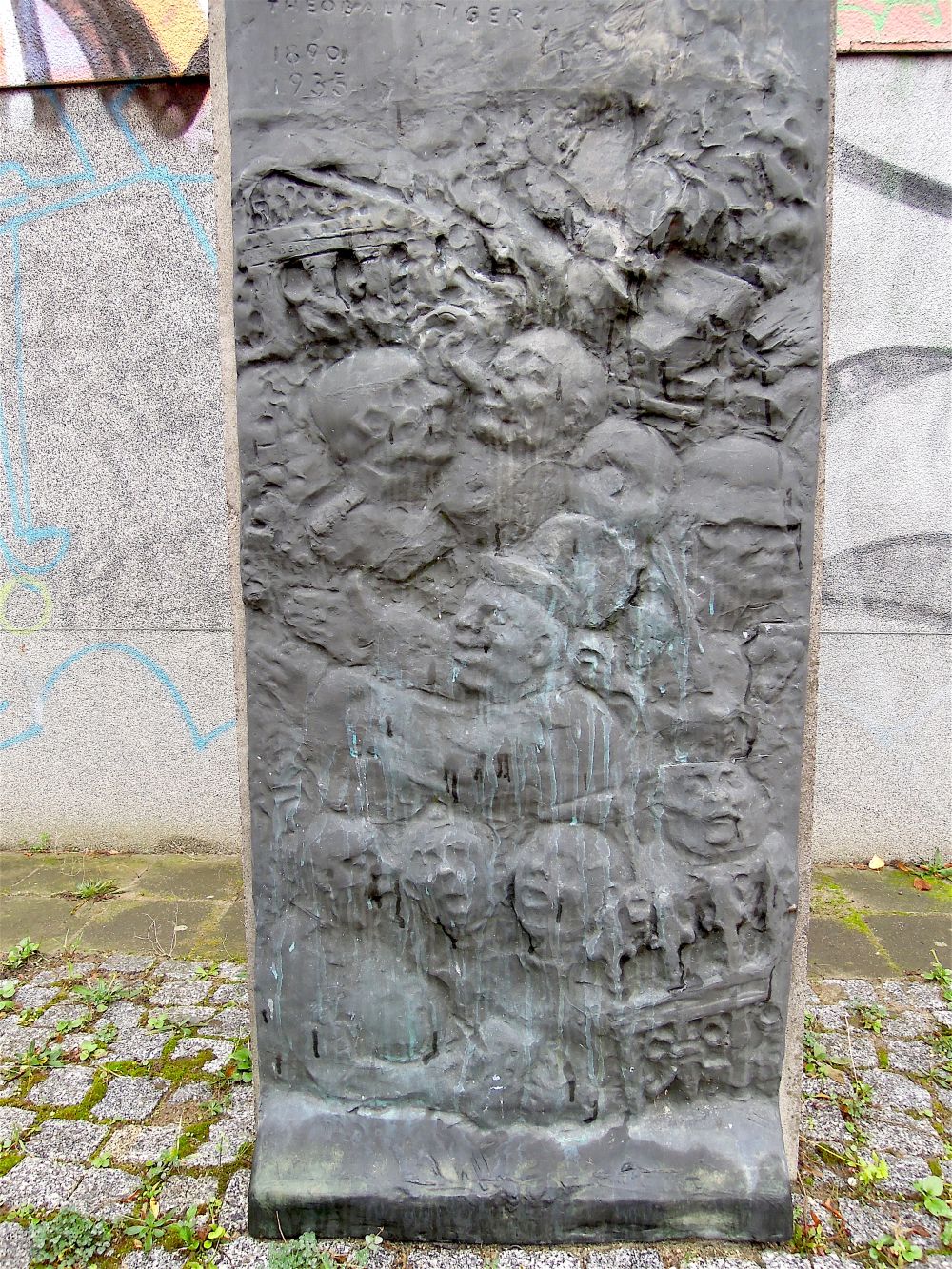 Die neue Installation setzt sich zusammen aus der originalen Bronze-Reliefstele (1987) und neuen Elementen. Es sind zwei Terrakotta-Porträtbüsten auf unterschiedlich hohen Betonstelen und sieben in die Pflasterung eingelassene rote Steine mit den Namen der Urheber (Schülernamen sowie Aron Rauschhardt und Marion Krüger) sowie Aphorismen von Tucholsky. Die Reliefstele von Skoddow zeigt im unteren Bereich plastisch herausgearbeitete Geschichtsbilder zum NS-Staat: oben der brennende Reichstag und ein brennendes Buch, darunter Stützen des NS-Staates: General mit Uniform, Kapitalist mit Zigarre, Richter mit Baret. Unterhalb sind die Verfolgten abgebildet, todesstarre Gesichter und ein Gitter, das an ein Friedhofsgitter erinnert. Der obere Bereich der Stele mit Inschriften mit einer Gedichtzeile aus „Zuckerbrot und Peitsche“ von Tucholsky (Jürgen Tomisch).