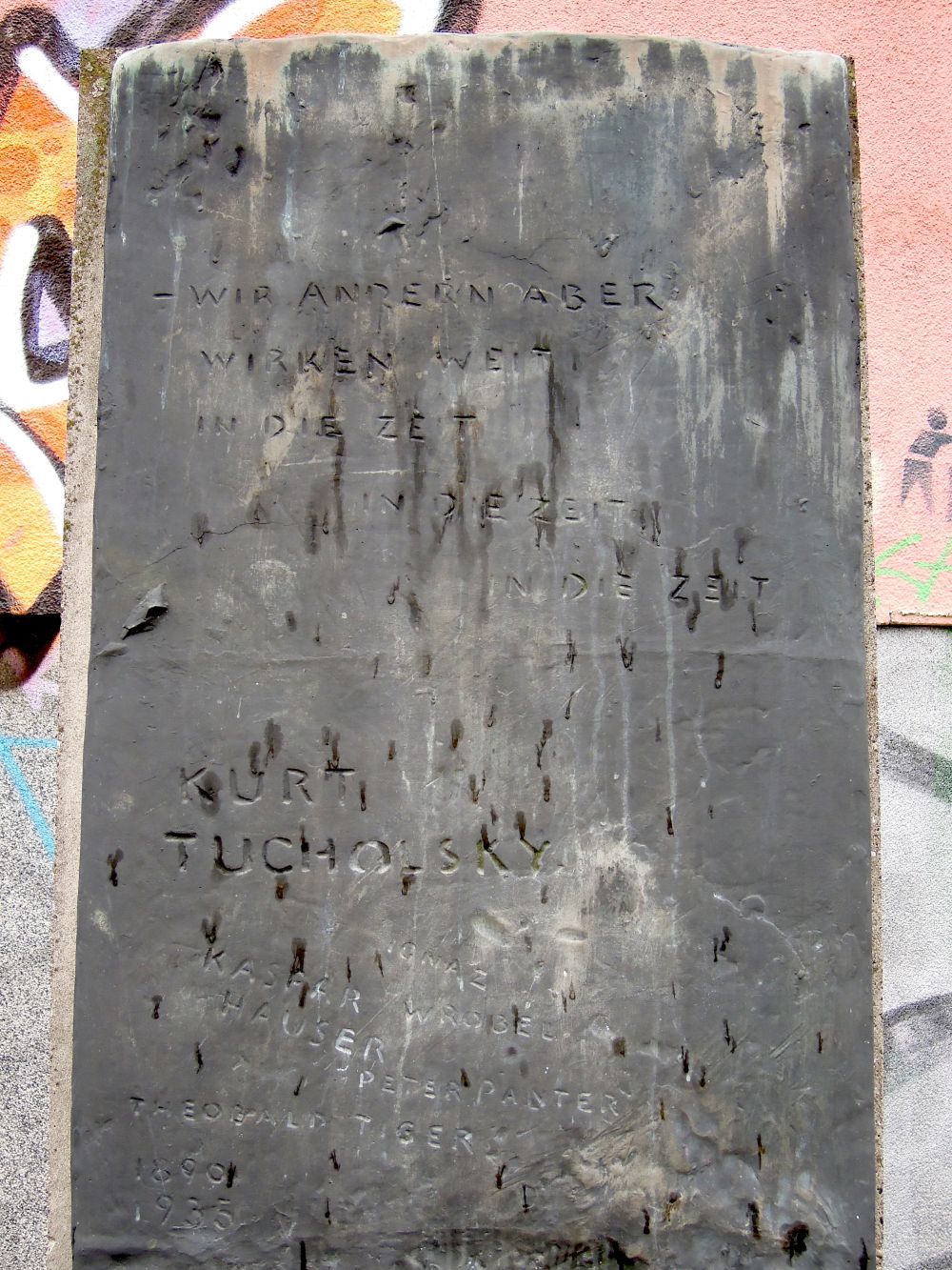 Die neue Installation setzt sich zusammen aus der originalen Bronze-Reliefstele (1987) und neuen Elementen, die aus einem Gemeinschaftsprojekt der Kunstlehrerin Marion Krüger der Kurt-Tucholsky-Oberschule mit ihren Schülern und mit dem Bildhauer Aron Rauschhardt hervorgingen. Die heutige Installation zum Gedenken an den jüdischen Journalisten und Schriftsteller Kurt Tucholsky (1890-1935) am Rande des Schuleinganges der Kurt-Tucholsky-Oberschule ist eine Neufassung des ursprünglichen durch Diebstahl z. T. zerstörten Tucholsky-Denkmals. 1985 und 1987 hatte der Berliner Bildhauer Ulrich Skoddow im Auftrag des Ministeriums für Kultur der DDR eine Denkmalinstallation aus einer Porträtstele und einer Relieftafel für die 25. Polytechnische Oberschule Berlin-Pankow geschaffen. Zunächst entstand anlässlich des 50. Todestages des Dichters 1985 die bronzene Porträtstele – auf einer schlanken Säule sitzt die Porträtbüste – die im Foyer des Schulgebäudes zur Aufstellung kam (vgl.: "Pankower Schüler ehrten Kurt Tucholsky", in: Neues Deutschland vom 21.12.1985; Neue Deutsche Literatur 34 (1986) H. 3, S. 161, 174; "Tucholsky-Porträt und Reliefstele eingeweiht", in: Neues Deutschland vom 2.9.1987). Zwei Jahre später wurde die Stele durch eine bronzene Relieftafel ergänzt. Das zweiteilige Denkmal wurde jetzt außerhalb bei der Oberschule platziert, die seitdem den Namen Tucholskys trägt. 2011 versetzte man das Denkmal auf dem Schulgelände. 2012 wurde die Porträtbüste von Metalldieben gestohlen, zurück blieb die bronzene Reliefstele. 2015 wurde die neue Denkmalinstallation eingeweiht, die aus einem Gemeinschaftsprojekt entstand, an dem Schüler der Oberschule, die Kunstlehrerin Marion Krüger und der Bildhauer Aron Rauschhardt beteiligt waren (vgl.: "Skulptur in Stein statt in Bronze", in: Berliner Woche vom 26.03.2015) (Jürgen Tomisch).