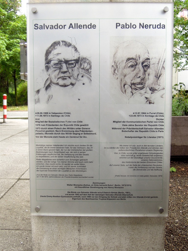 Wenige Wochen nach dem Sturz des chilenischen Präsidenten Salvador Allende im September 1973 und seinem Selbstmord noch am selben Tag wurden in dem in Köpenick neu entstandenen Wohngebiet, als Zeichen der Solidarität der DDR mit Chile, Allende und Neruda durch Umbenennungen von Straßen und Schulen geehrt. Die 25. Polytechnische Oberschule bekam im November 1973 den Namen „Salvador-Allende-Oberschule“, fortan mit der Adresse „Pablo-Neruda-Straße“ – das „Allende-Viertel“ erhielt seinen Namen. Ende des darauf folgenden Jahres wurden 22 Künstler aufgefordert das „Allende-Viertel“ mit Kunstwerken auszugestalten, die dem Gedanken der Solidarität verpflichtet sein sollten. Es entstanden fast 60 Kunstwerke. Die erst 1981 entstandene Bronzebüste Salvador Allendes von Dietrich Rohde ist zu den späteren »Ergänzungen des Kunstkonzeptes im engen räumlichen Kontext der „Salvador-Allende-Schule“ zu zählen. Die Büste wurde im September 1983 während eines Pionier- und FDJ-Appells anlässlich des 10. Todestages Allendes enthüllt. Aufgestellt wurde sie im Hofbereich der „Salvador-Allende-Oberschule“, rechts hinter dem Gebäude auf Achse der Schul-Giebelwand in einem kleinen Grünbereich („Ehrenhain“). Der Platz vor der Büste wurde bis Ende 1989 von der Schule als Appell-Platz für die Pioniere und FDJ-Mitglieder genutzt (nach Aurich: http://www.eaurich.de/Dokumente/Zur Geschichte des Allende-Viertels.pdf). Nach 1990 erhielt die Büste einen neuen Platz neben dem Haupteingang der Schule und vor dem Stelenelement von Werner Nerlich; auch der Sockel wurde erneuert. Nachdem die Schule seit 2006/2007, unter dem Arbeitstitel 09Y11 firmierte, bekam sie 2009 schließlich ihren heutigen Namen, „Emmy-Noether-Oberschule“. Im September 2013 wurde die restaurierte Bronzebüste Salvador Allendes, auf Initiative Eberhard Aurichs, Ulrich Haas, Initiator des Bürgervereins Allende u.a., nach einem Beschluss der Bezirksverordneten-Versammlung Köpenick an ihren heutigen Standort nahe der Schule umgesetzt. Die Büste bekam einen neuen Sockel. Der Platz vor der Schule erschien nicht mehr zeitgemäß – die frühere „Salvador-Allende-Schule“ war vor Jahren schon geschlossen worden und das neu gegründete Gymnasium hatte sich für einen anderen Namen entschieden. Bereits einige Wochen vor der ersten Aufstellung der Allende-Büste in Berlin-Köpenick, war am 26. Juni 1983, ein weiterer Abguss der Salvador-Allende-Büste von Dietrich Rohde in Gransee, Brandenburg vor der dortigen (damals noch) „Salvador-Allende-Schule“ anlässlich des 75. Geburtstages des ehemaligen chilenischen Volkspräsidenten enthüllt worden. Diese Büste steht heute gegenüber dem Haupteingang des Neubaus der Schule, jetzt „Strittmatter-Gymnasium“, Oranienstraße 30A und ist mit einer Namensplakette versehen (Cornelia Glanz, Tomisch/Lutz).