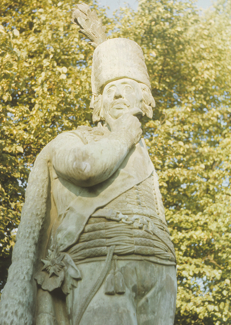 Bronzene Standfigur auf bräunlichem, poliertem Granitsockel mit drei figürlichen Bronzereliefs und bronzener Inschriftentafel mit erhaben gegossenen Lettern.