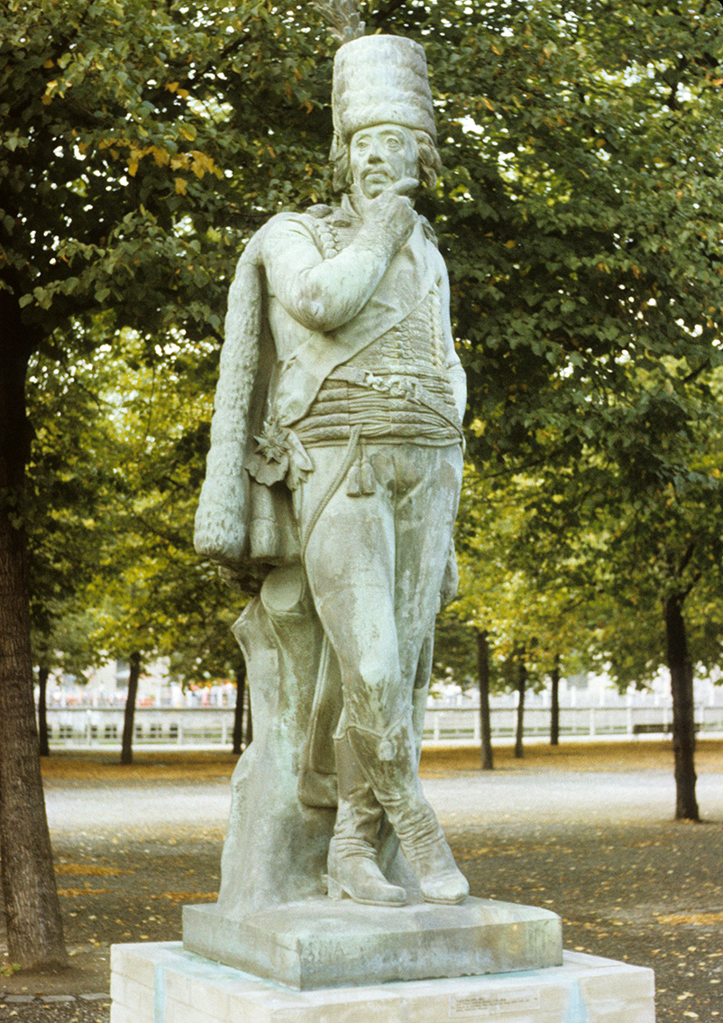 Bronzene Standfigur auf bräunlichem, poliertem Granitsockel mit drei figürlichen Bronzereliefs und bronzener Inschriftentafel mit erhaben gegossenen Lettern.