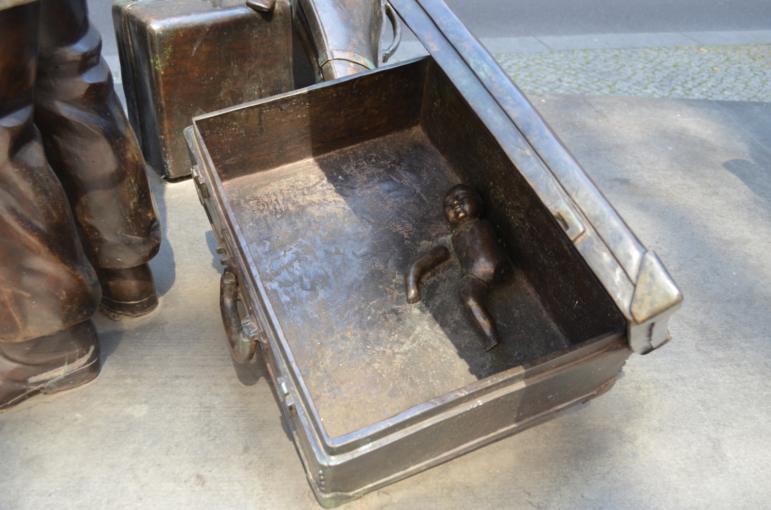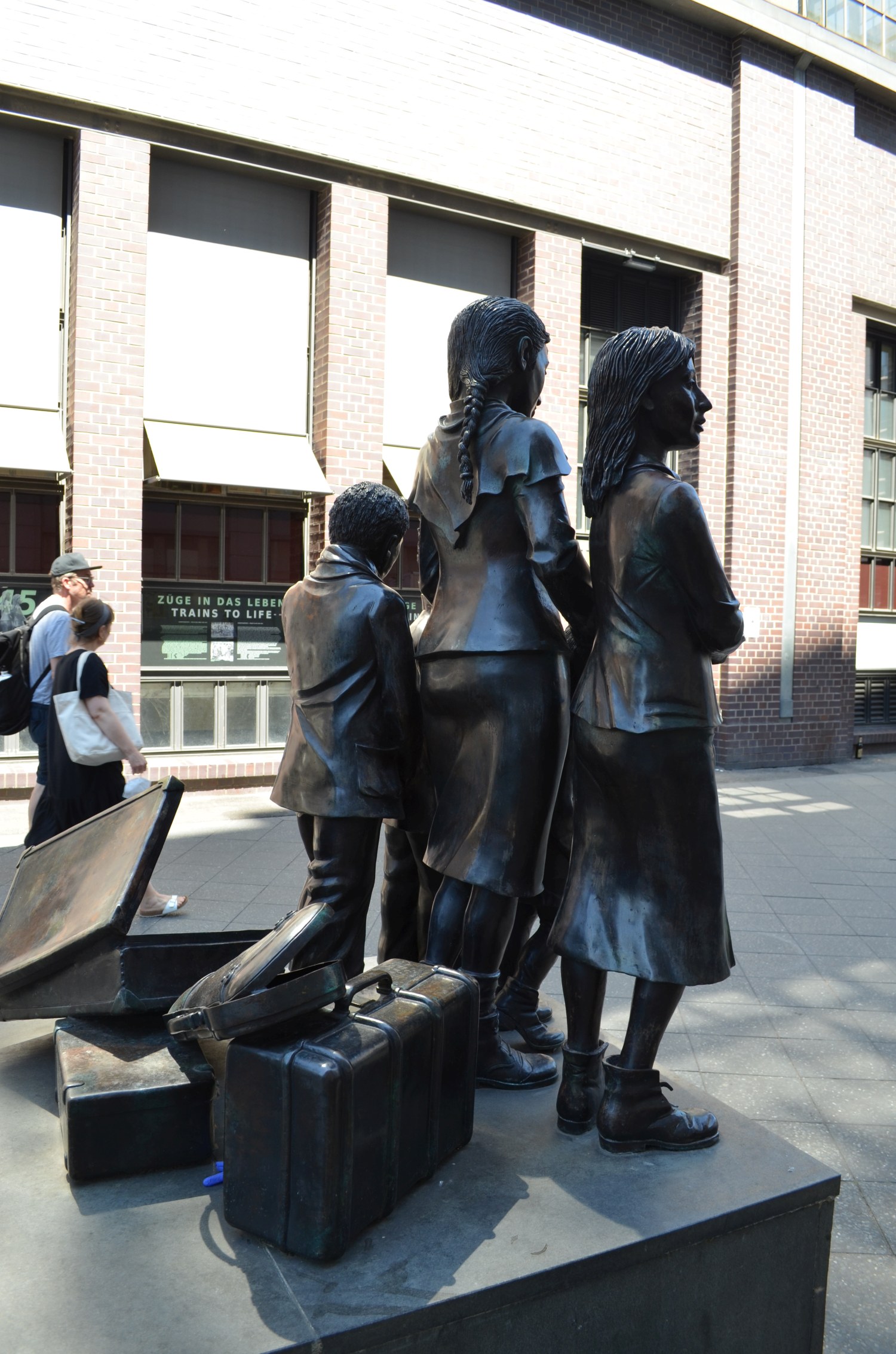 Das Erinnerungsmal besteht aus zwei Personengruppen, die in entgegen gesetzte Richtungen gehen. Fünf Kinderfiguren mit graubrauner Patinierung stehen dabei stellvertretend für alle die, die nicht gerettet, sondern deportiert und ermordet wurden. Zwei Kinder, im satten Rotbraunton gehalten, symbolisieren die geretteten Mädchen und Jungen der „Kindertransporte“. Zu Seiten der auf längsrechteckiger Standfläche stehenden Kindergruppen verlaufen auf niederigeren Sockelbereiches realistisch formulierte Schienenstrangstücke. An der Stirnseite des mit Granitplatten eingefassten Sockels ist eine Erläutertungstafel angebracht. Stapel von Koffern und Gepäckstücken zwischen den Überlebenden und den in die Vernichtung Verschleppten unterstreichen den Versuch einer realistischen Darstellung der der Plastik zugrunde liegenden historischen Ereignisse (Jörg Kuhn).