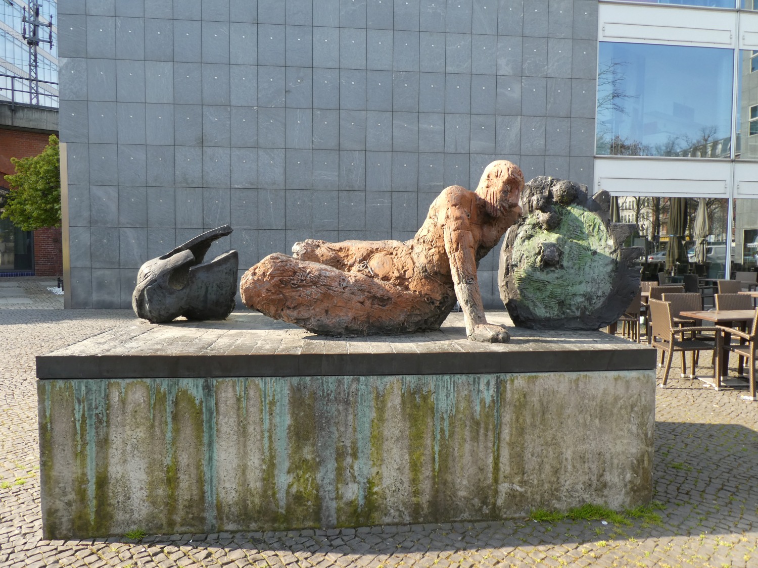 Halb liegende Figur aus Bronze auf rechteckigen Sockel aus Beton. Diese liegt nicht direkt auf dem Sockel, sondern auf einer Betonplatte, die sich auf dem Sockel befindet.