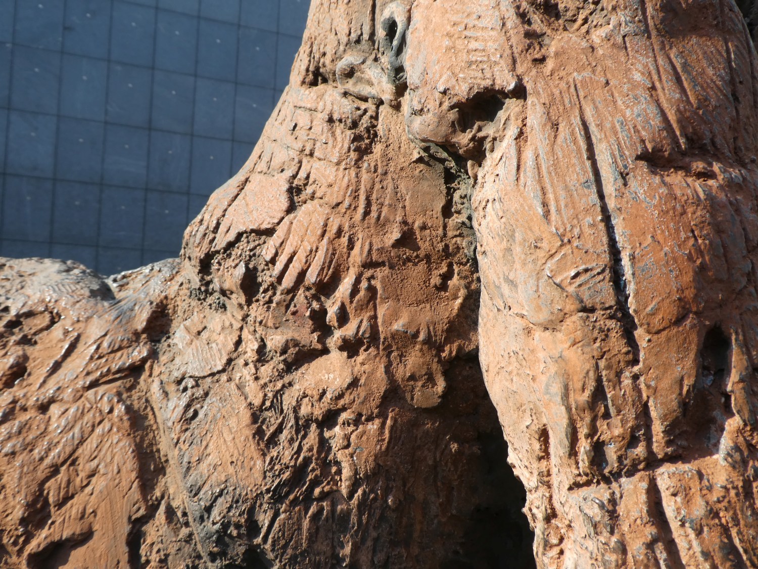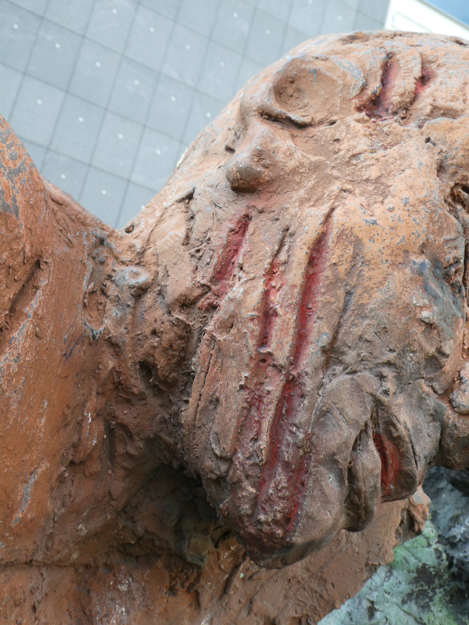 Die Struktur des Kriegers ist bossiert belassen, da sich Linien und Einkerbungen durch die gesamte Plastik ziehen, ebenso beim Schild und Helm (Sastra Hanstein).