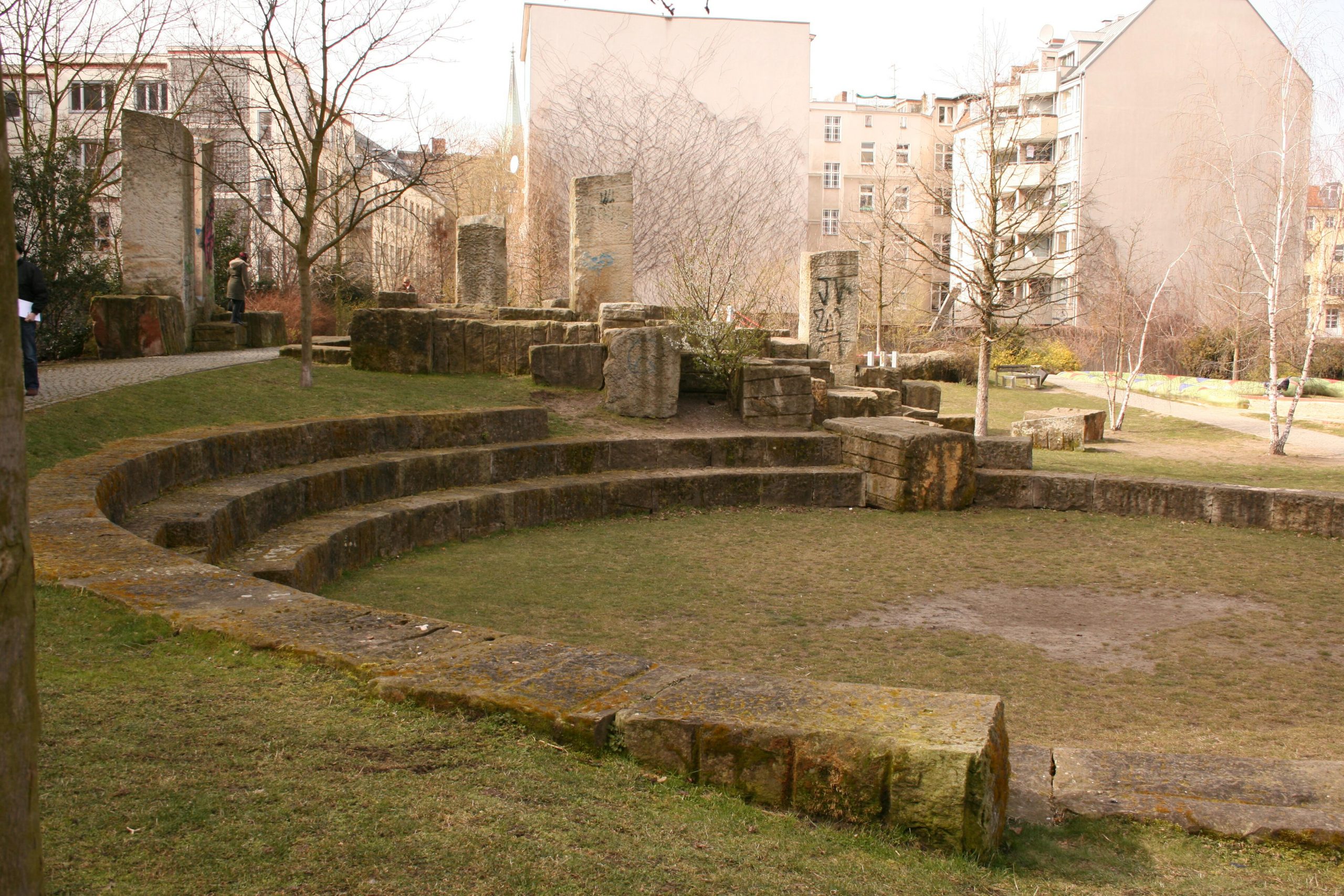 Die Anlage entstand nach einem Entwurf des Bildhauers Ajit Kai Dräger. Sie wurde in Zusammenarbeit mit dem Architekturbüro Willnecker & Siegmann ausgeführt. Die Kosten betrugen 600.000,- DM (Auskunft des Bildhauers). Das Areal an der Ecke Grunewaldstraße/Potsdamer Straße wurde auf Initiative des Lesben- und Schwulenverbands Berlin-Brandenburg mit Unterstützung der SPD-Ortsgruppe Schöneberg sowie den Lesben und Schwulen in der SPD und den schwulen Jungsozialisten Ende 2000 in Kurt-Hiller-Park umbenannt. Damit erfolgte eine Würdigung des Schriftstellers Kurt Hiller (1885-1972) als Pazifist, Sozialist und „Mitbegründer der homosexuellen Bürgerrechtsbewegung“, wie es auf einer Tafel am Platz erläutert wird. Auch das Ensemble aus Sandsteinquadern ist als Würdigung von Hillers Werk zu verstehen. Der Bildhauer Ajit Kai Dräger gibt dazu folgende Erläuterung: "Der Erinnerung an einen Menschen gewidmet, der Mut, Courage, Menschenliebe, Freiheit jeglichen menschlichen Individuums gelebt, verteidigt und dafür mit den Mitteln des Wortes gefochten hat. Jeder Schlag auf dem Stein ein Wort, jeder Splitter ein Zeugnis des Schmerzes, der abgeschlagen wurde auf unzähligen menschlichen Seelen, jeder gefügte Block ein Zeichen des Ganzen, kraftvoll, standhaft, unverrückbar und doch irgendwann dem Vergessen gewidmet." (Portfolio des Künstlers, artwork since 1989) (Susanne Kähler).