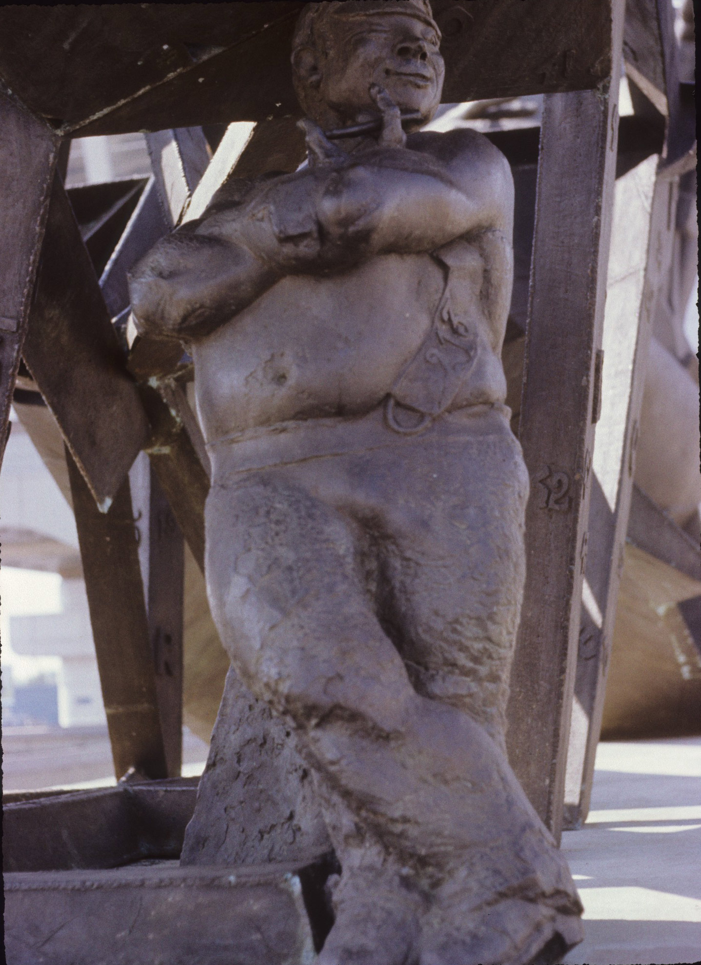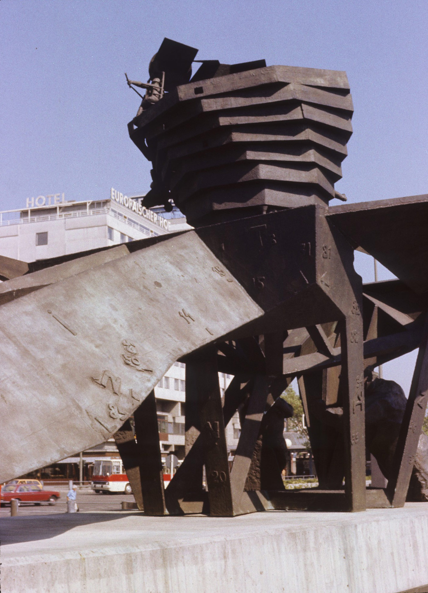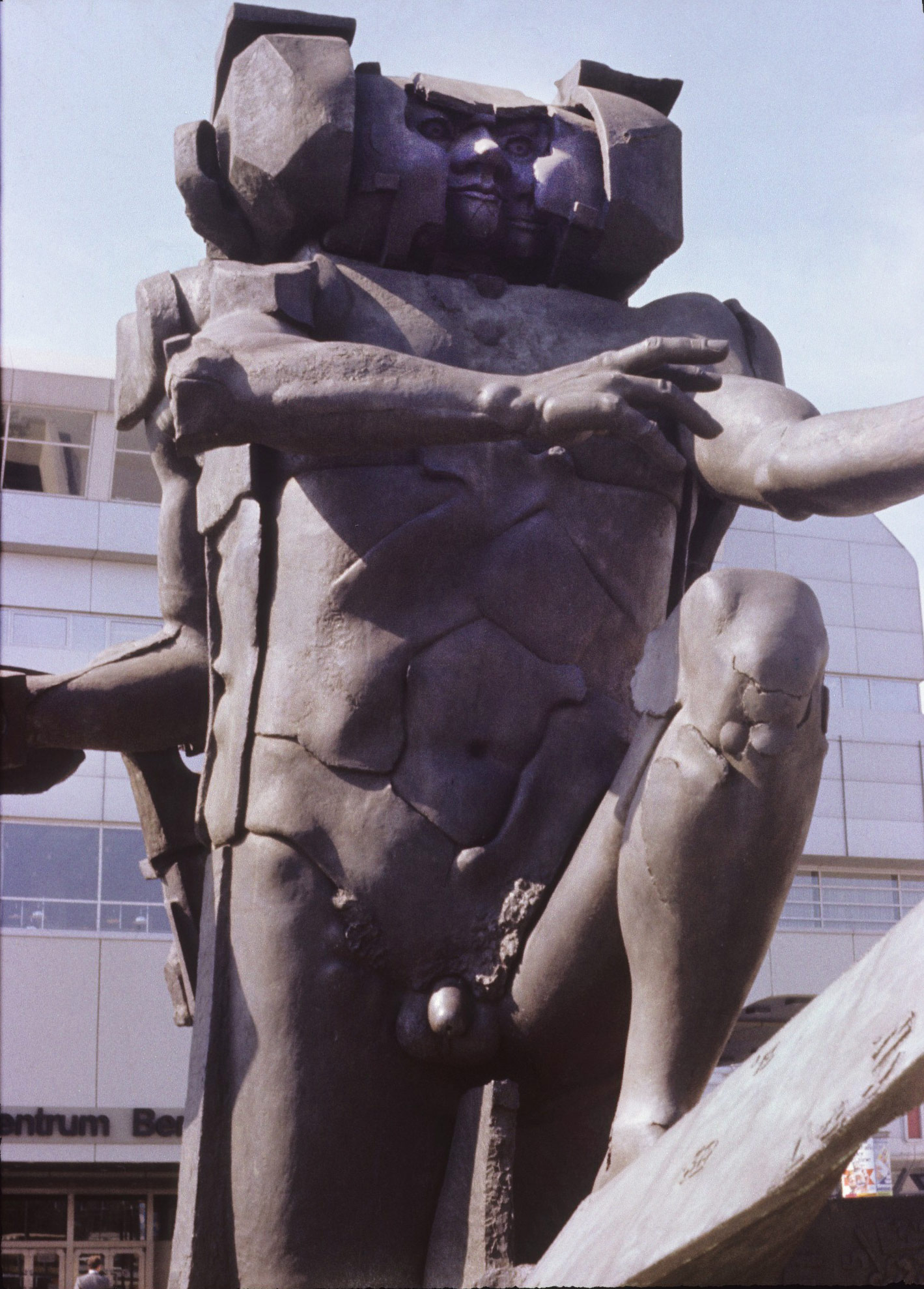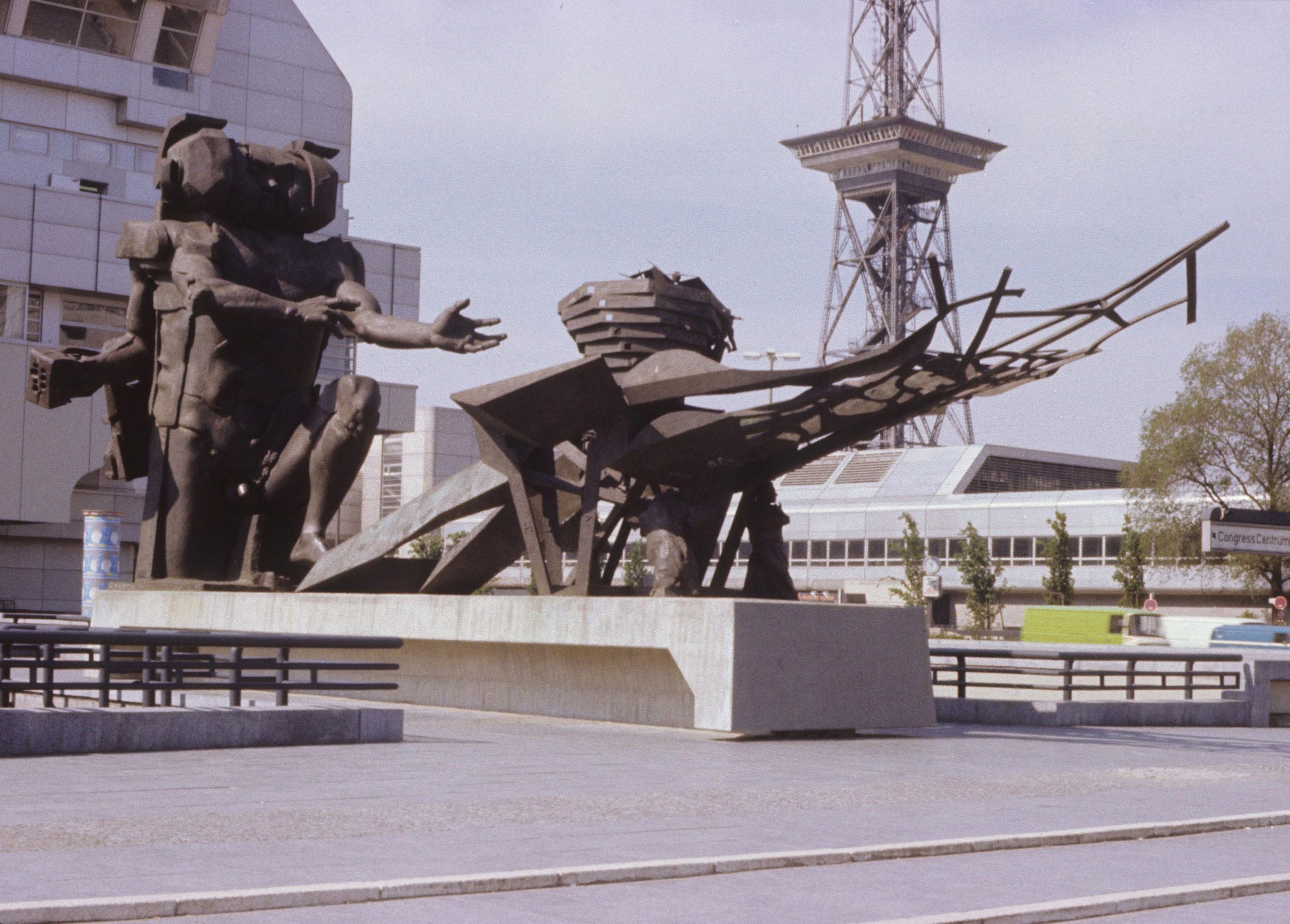 Monumentale Stahlplastik eines roboterhaft gestalteten Riesen (Alexander der Große) vor einem monströsen, stalinorgelhaften Katapult. Dem angeblich zum Aufbau einer Stadt – realistisch gedeutet jedoch zur Zerstörung von (Stadt-)Mauern gedachtem – Gerät beigestellt sind populäre Figuren, so genannte „Berliner Typen“ oder heraldisch zu deutende Figuren: „Berliner Bär“ und „Eckensteher Nante“ (eine erfolgreiche Erfindung des Schriftstellers Adolf Glassbrenner aus der ersten Hälfte des 19. Jahrhunderts), insgesamt ein Kunstwerk, dessen Wirkung eher auf Fernsicht angelegt ist (Jörg Kuhn).