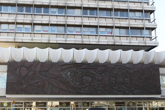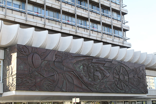 Das Kupferelief Walter Womackas, einem Vertreter des sozialistischen Realismus, verläuft an der Ostfassade des Haus des Reisens. Es entstand im Zuge eines Magistratsbeschlusses von 1964. Dieser bewirkte, dass der Alexanderplatz in den Folgejahren zu einem bedeutenden Forum für Fußgänger*innen umgestaltet wurde. Die dort neu entstehenden Gebäude sollten den Platz auf ausdrucksstarke Weise umgeben. Zwischen 1969 und 1971wurde das 17-geschossige Haus des Reisens, mit vorgelagertem, zweigeschossigen Flachbau fertiggestellt (vgl. https://www.museum-der-1000-orte.de/kunstwerke/kunstwerk/der-mensch-uberwindet-zeit-und-raum). Zu DDR-Zeiten wurde es von dem noch leuchtenden, getriebenen Kupferrelief des Kollektivs Womacka geschmückt. Womacka hatte aus der Sowjetunion doppelt so viel Kupfer geliefert bekommen, als er für die Herstellung bestellt hatte. Daraufhin bat Erich Honecker ihn, öffentlich zu erklären, dass es sich lediglich um Kunststoff handele. Der Glanz des "Kunststoffes" ist mittlerweile verblichen (Maleschka, 2019, S.71 ff.).