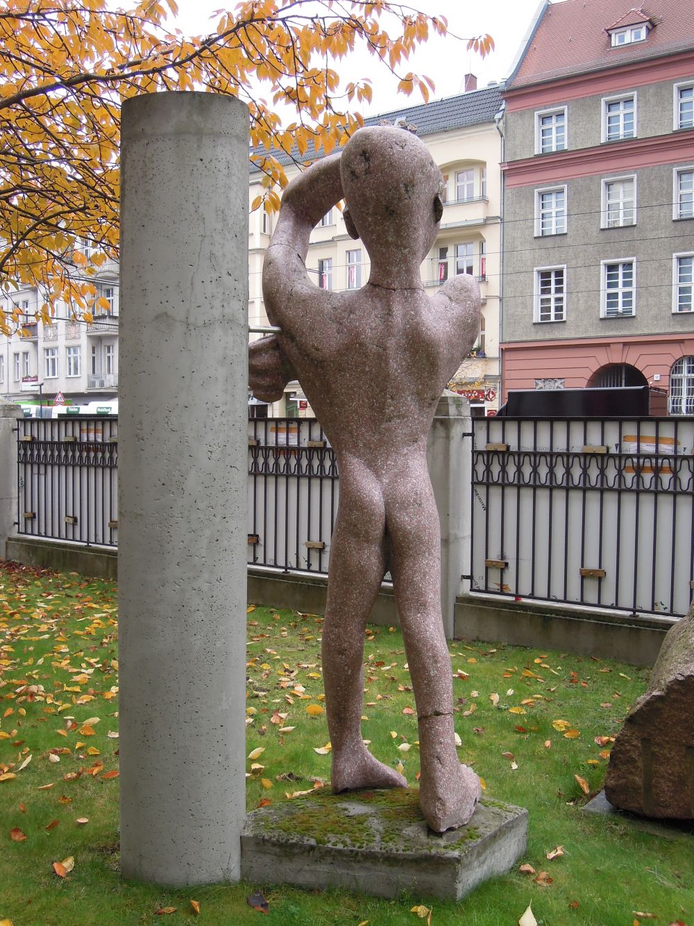 »Alexander Polzin / DER STEINHÄNDLER / 1997 in Herzliya - Israel - aus Sinai-Granit gearbeitet / dort von unbekannter Hand beschädigt. / Aufgestellt im Jahre 2001 / anläßlich der Wiederherstellung des einstigen II. Weisenhauses / der jüdischen Gemeinde zu Berlin.«