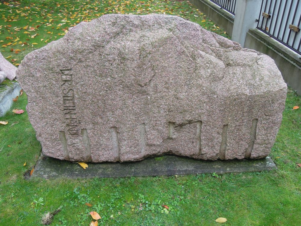»Alexander Polzin / DER STEINHÄNDLER / 1997 in Herzliya - Israel - aus Sinai-Granit gearbeitet / dort von unbekannter Hand beschädigt. / Aufgestellt im Jahre 2001 / anläßlich der Wiederherstellung des einstigen II. Weisenhauses / der jüdischen Gemeinde zu Berlin.«