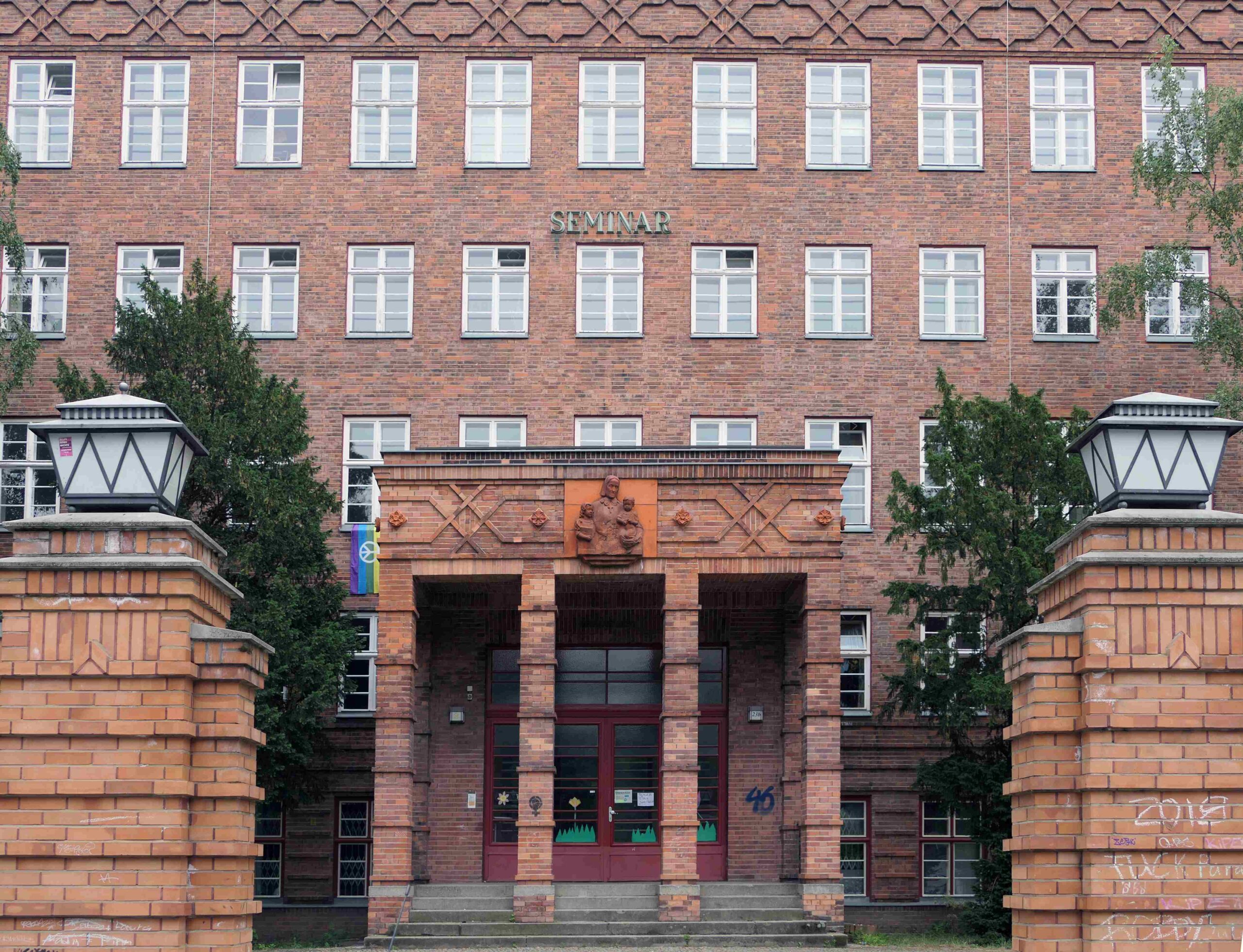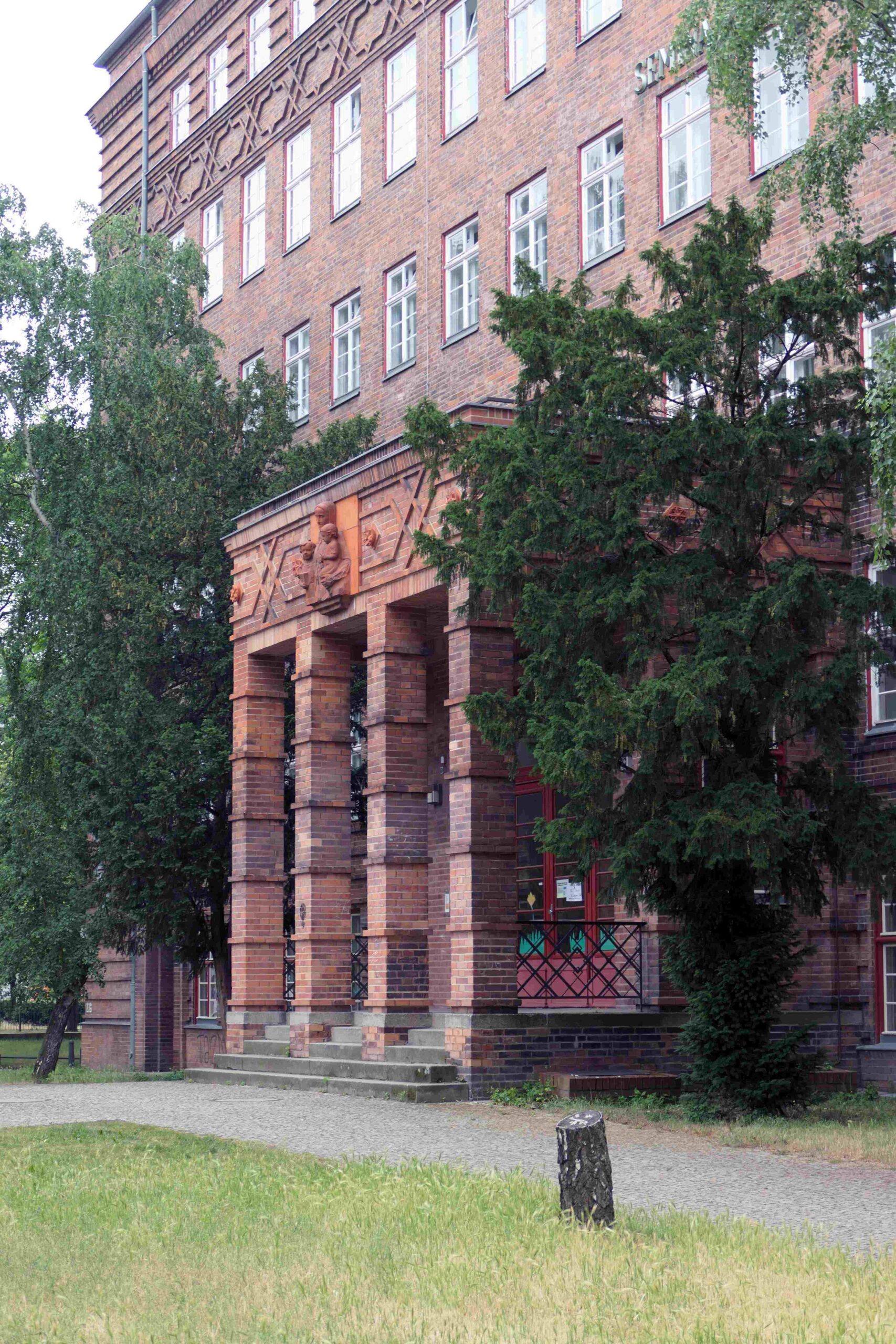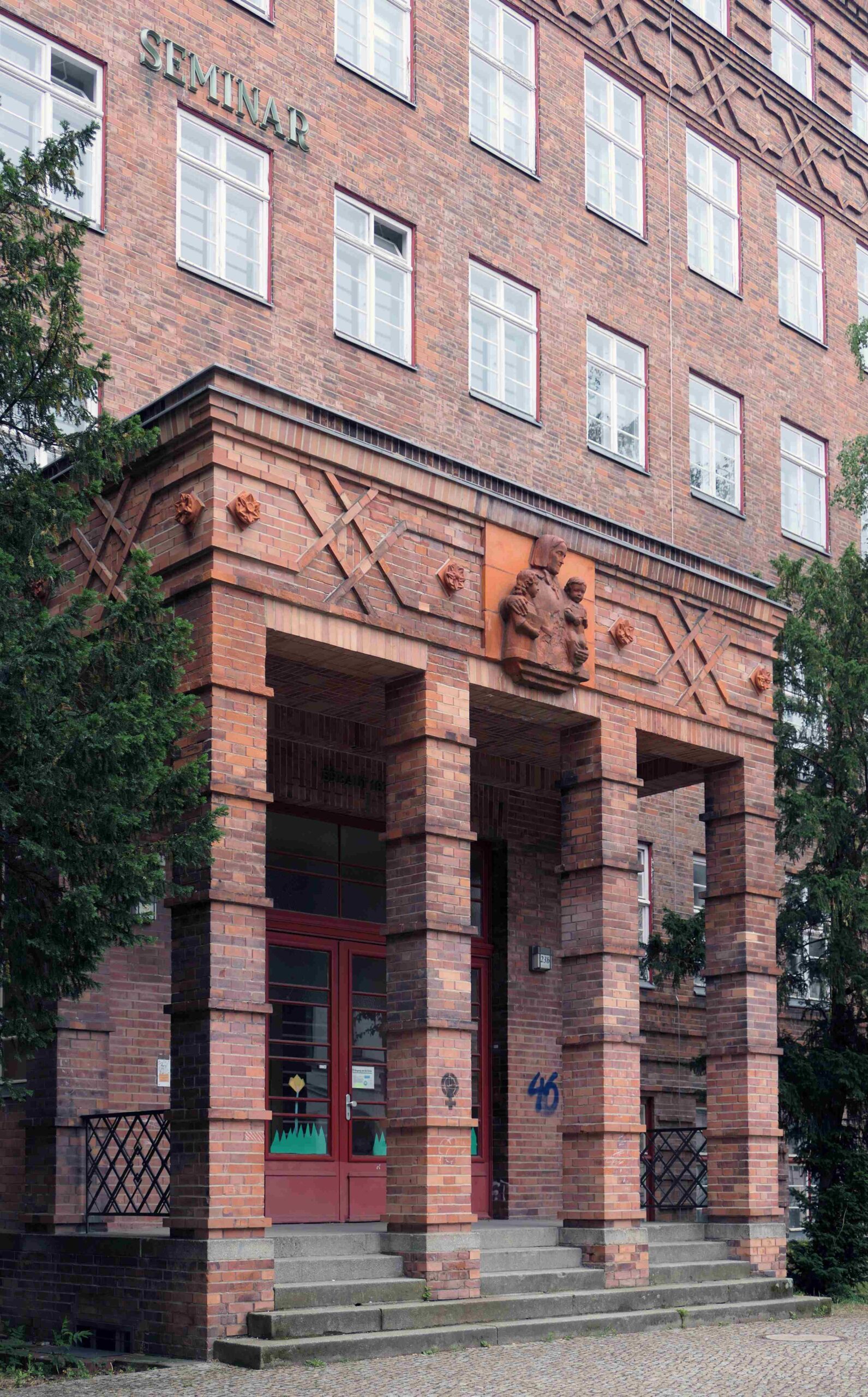Über dem Eingangsportal des Seminarhauses befindet sich ein Tonrelief, das eine Diakonisse mit zwei Kindern im Arm darstellt (Nicola Vösgen).