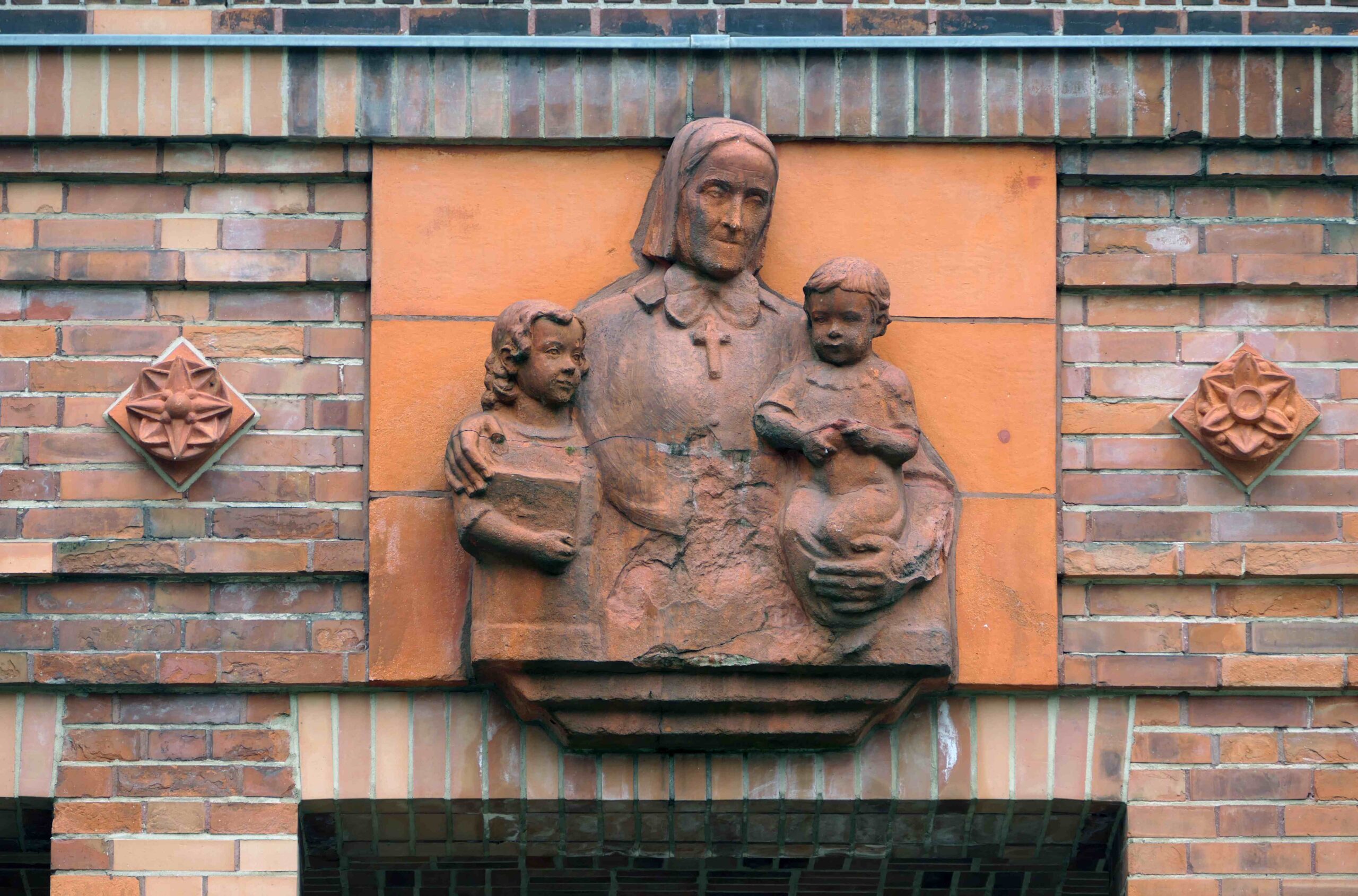 Über dem Eingangsportal des Seminarhauses befindet sich ein Tonrelief, das eine Diakonisse mit zwei Kindern im Arm darstellt (Nicola Vösgen).