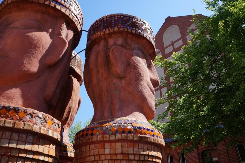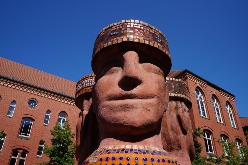 Drei große erdfarbene, mit Mosaiksteinen besetzte und bemalte Sandsteinsäulen (Blau-, Rot-, Braun-, Gelbtöne) stehen aneinander in einem Sandkasten vor dem Schulgebäude. Ihnen sind überlebensgroße Köpfe mit lächelnden Gesichtern aufgesetzt. Diese sind aus naturbelassenem Sandstein gefertigt. Zu den Füßen der Säulen, stehen in den Lücken angeordnet, drei kleinere, ebenfalls mit farbigen, überwiegend blauen, Mosaiksteinen besetzte, zylindrisch geformte Säulen.