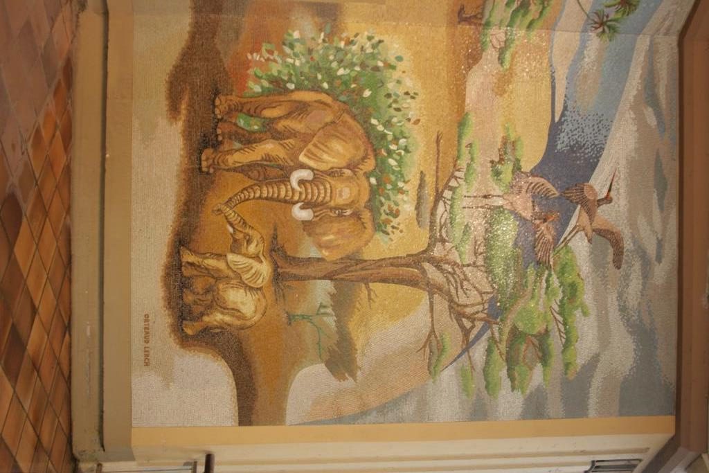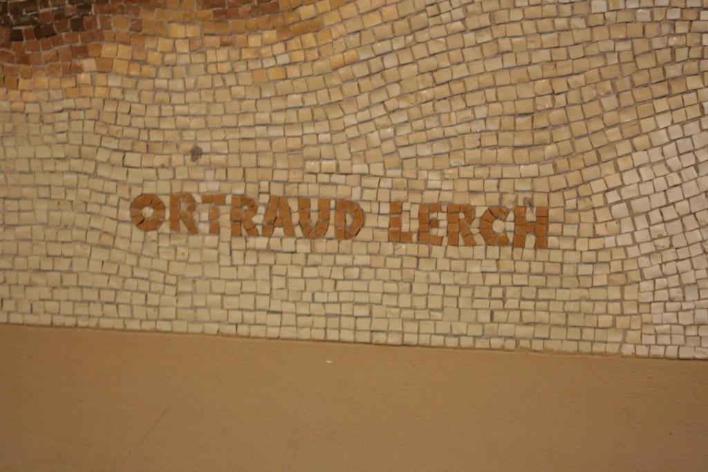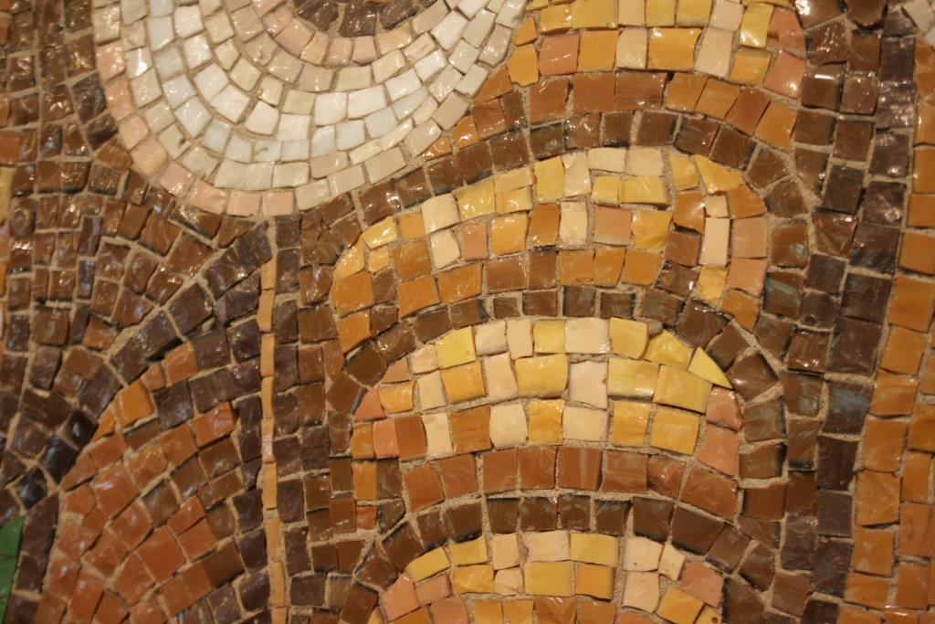 Bezeichnung (mit bernsteinfarbenen Mosaiksteinen vor hellen Grund gesetzt)