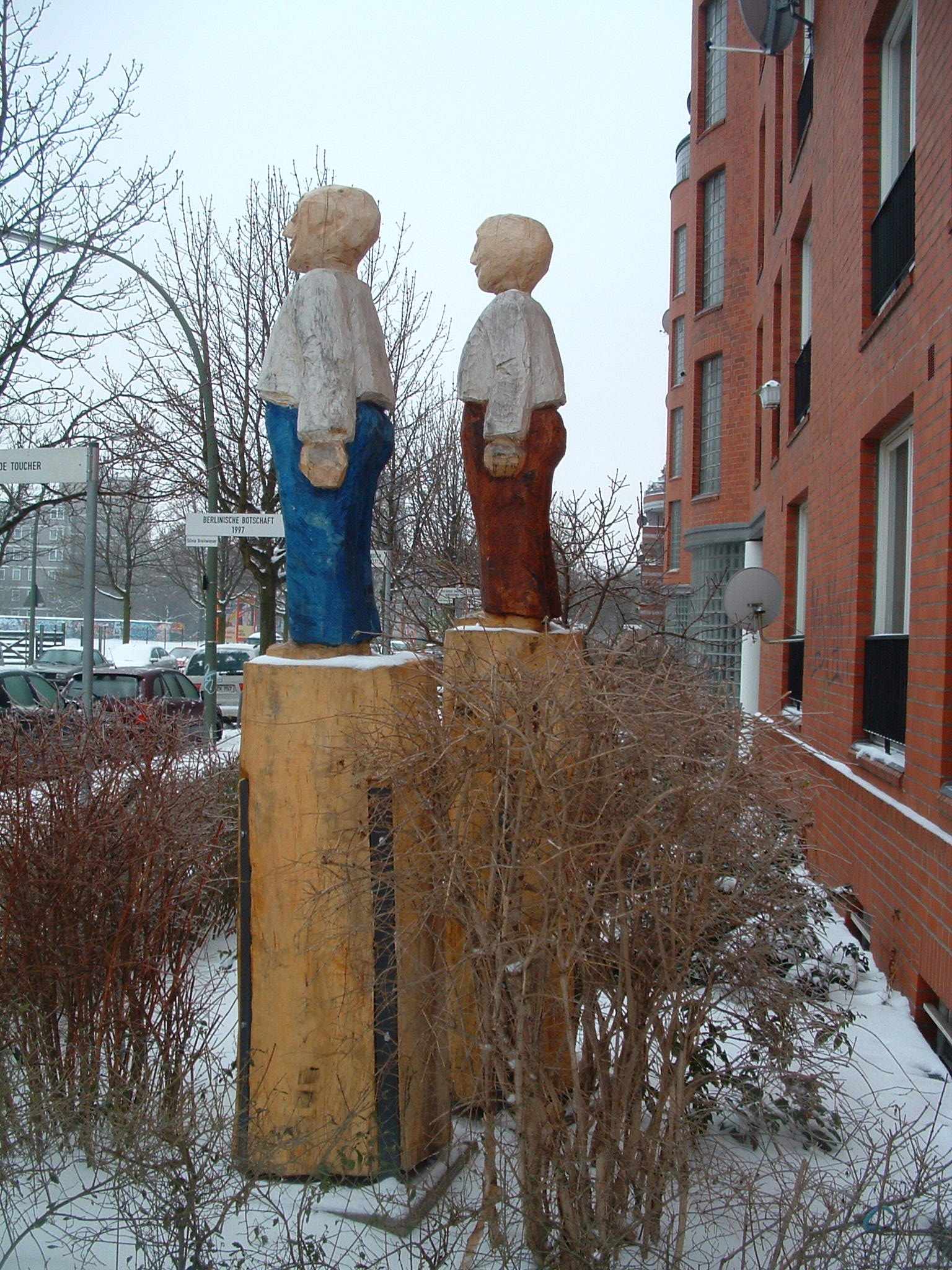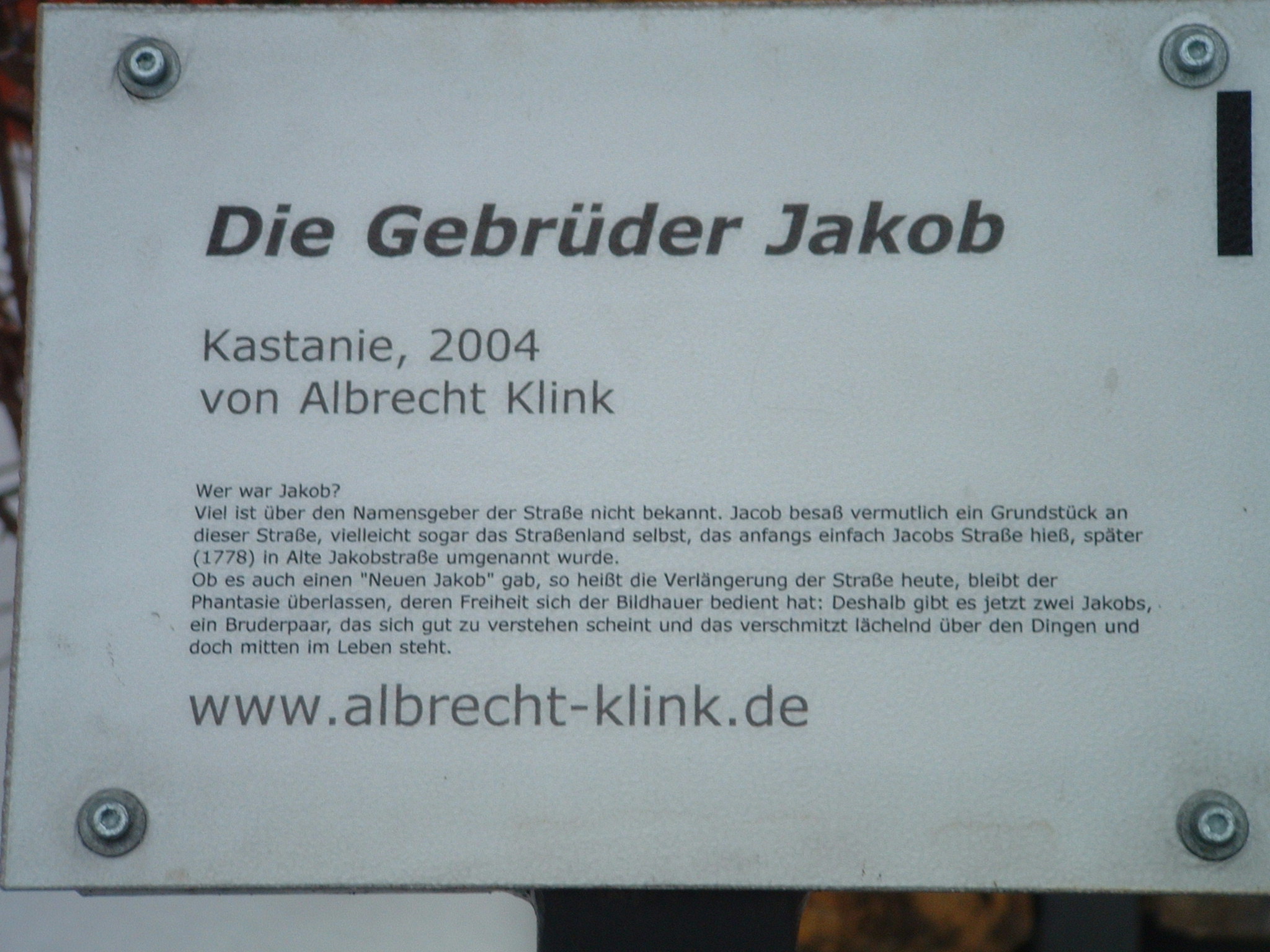 »Die Gebrüder Jakob / Kastanien, 2004 / von Albrecht Klink / Wer war Jakob? / Viel ist über den Namensgeber der Straße nicht bekannt. Jacob besaß vermutlich ein Grundstück an / dieser Straße, vielleicht sogar das Straßenland selbst, das anfangs einfach Jacobs Straße hieß, später / (1778) in Alte Jakobstraße umgenannt wurde. / Ob ob es auch einen "Neuen Jakob" gab, so heißt die Verlängerung der Straße heute, bleibt der / Fantasie überlassen, deren Freiheit sich der Bildhauer bediemnt hat: Deshalb gibt es jetzt zwei Jakobs, / ein Brüderpaar, das sich gut zu verstehen scheint und das verschmitzt lächelnd über den Dingen und / doch mitten im Leben steht. / www.albrecht-klink.de«