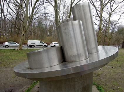 Die Stahlplastik befindet sich auf einer Grünfläche Ecke Wesendorfer Straße und Senftenberger Ring. Das Kunstwerk „Die Gemeinschaft“ ist eine vollständig mit Edelstahl verkleidete abstrakte Plastik. Auf zwei unterschiedlich großen, schräg gestellten Zylinderscheiben sind, wie auf einem Tisch, zehn Zylinder unterschiedlicher Größe montiert, wobei zwei flache Scheibenkörper vor der Kulisse von acht röhrenhaften Zylindern stehen. Die Plastik sitzt auf einem breiten Säulenschaft, der ebenfalls mit Edelstahl verkleidet ist. Dieser ist auf einer flachen Betonscheibe montiert, die in der Rasenfläche eingelassen ist. Der Titel der Plastik „Die Gemeinschaft“ erweckt unterschiedliche Assoziationen. Zu einem sollte sie wohl das soziale Gemeinschaftsgefühl der Einwohnerschaft des Märkischen Viertels symbolisieren, bzw. anregen, zum anderen ist sie auch ein Abbild der umgebenden Bebauung, die mit Wohnhochhäusern und flachen sozialen Einrichtungen wie Schulen und Kindertagesstätten gekennzeichnet ist (Jürgen Tomisch, Barbara Anna Lutz).
