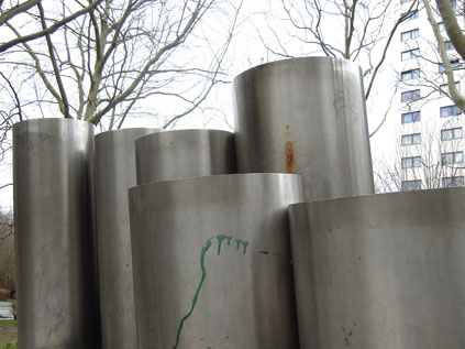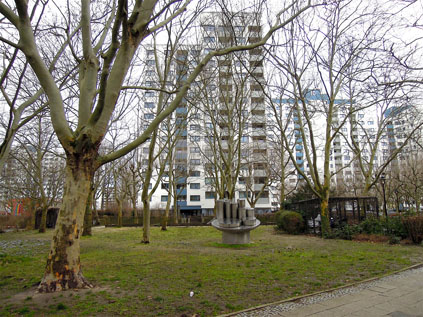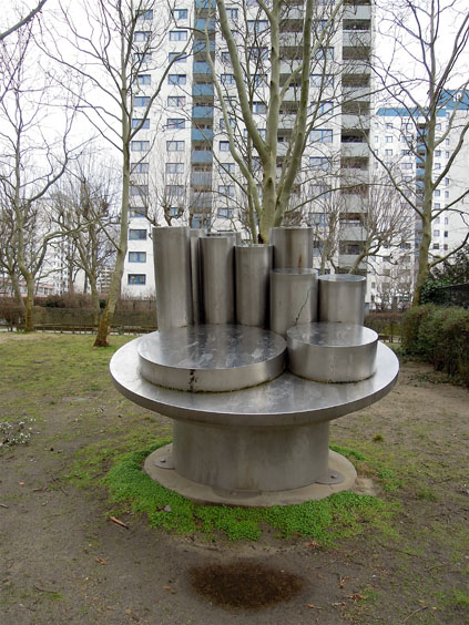 Die Stahlplastik befindet sich auf einer Grünfläche Ecke Wesendorfer Straße und Senftenberger Ring. Das Kunstwerk „Die Gemeinschaft“ ist eine vollständig mit Edelstahl verkleidete abstrakte Plastik. Auf zwei unterschiedlich großen, schräg gestellten Zylinderscheiben sind, wie auf einem Tisch, zehn Zylinder unterschiedlicher Größe montiert, wobei zwei flache Scheibenkörper vor der Kulisse von acht röhrenhaften Zylindern stehen. Die Plastik sitzt auf einem breiten Säulenschaft, der ebenfalls mit Edelstahl verkleidet ist. Dieser ist auf einer flachen Betonscheibe montiert, die in der Rasenfläche eingelassen ist. Der Titel der Plastik „Die Gemeinschaft“ erweckt unterschiedliche Assoziationen. Zu einem sollte sie wohl das soziale Gemeinschaftsgefühl der Einwohnerschaft des Märkischen Viertels symbolisieren, bzw. anregen, zum anderen ist sie auch ein Abbild der umgebenden Bebauung, die mit Wohnhochhäusern und flachen sozialen Einrichtungen wie Schulen und Kindertagesstätten gekennzeichnet ist (Jürgen Tomisch, Barbara Anna Lutz).