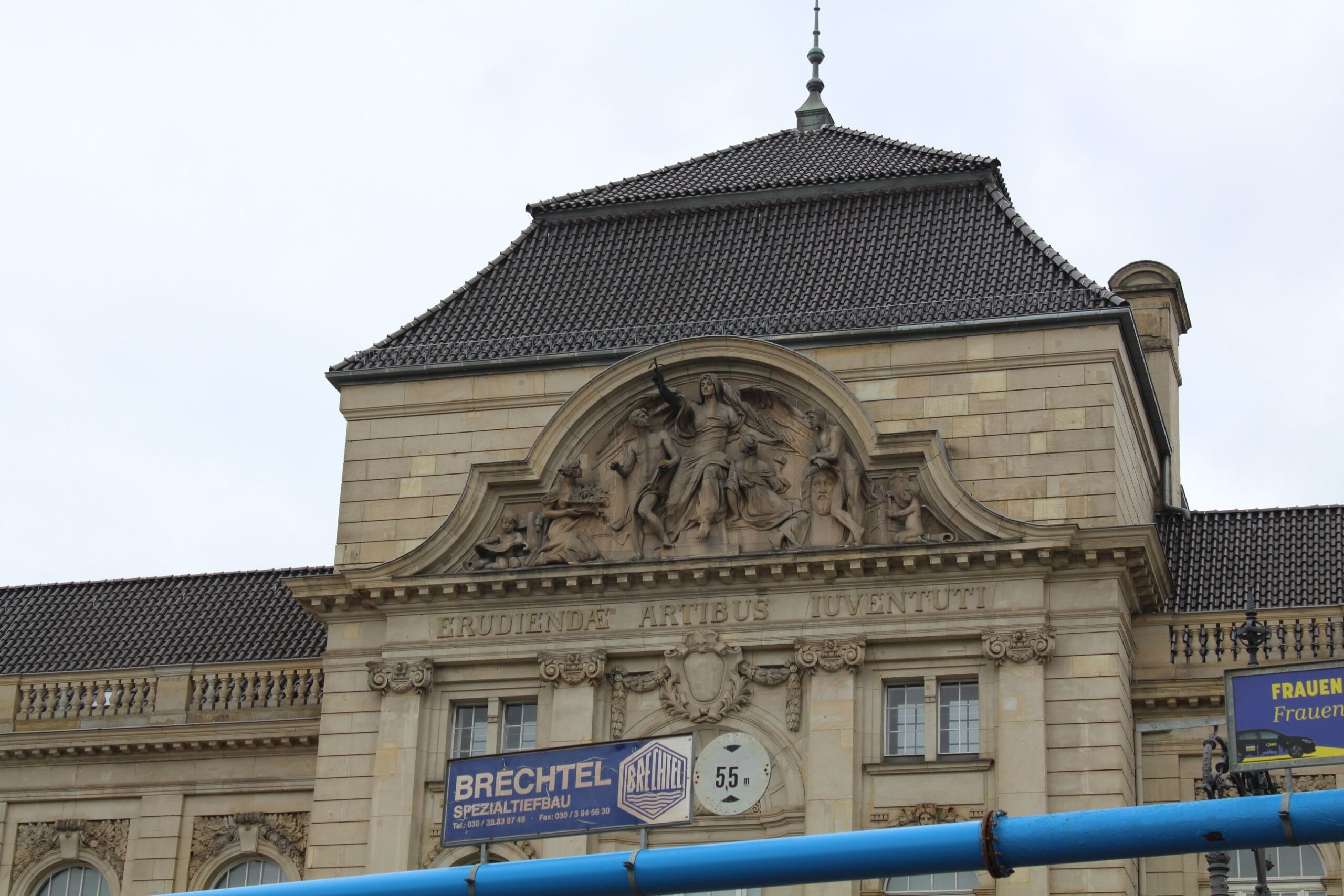 Das Giebelfeld ehemaligen Hochschule für die Bildenden Künste zeigt in der Mitte eine weibliche Gestalt mit weit ausgebreiteten Flügeln, die in der vorgestreckten linken Hand einen Lorbeerkranz oder Lorbeerzweig hielt (Lorbeer verloren) und in der rechten Hand einen Palmenzweig. Zu ihrer Linken eine Frau in Rückenansicht, die zu der geflügelten Frauengestalt aufblickt, und ein über einer Zeusbüste lehnender unbekleideter Mann. Das Giebeleck füllt ein Putto, der sich mit einem Kirchenmodell beschäftigt. In der linken Giebelhälfte ein ebenfalls unbekleideter junger Mann mit Tafel und Zeichengerät in den Händen, vor ihm eine kniende Frau, die einen Blumenkorb in den Händen hält. Die Ecke ist mit einem weiteren Putto gefüllt, der sich mit verschiedenen Gerätschaften beschäftigt (Nicola Vösgen).