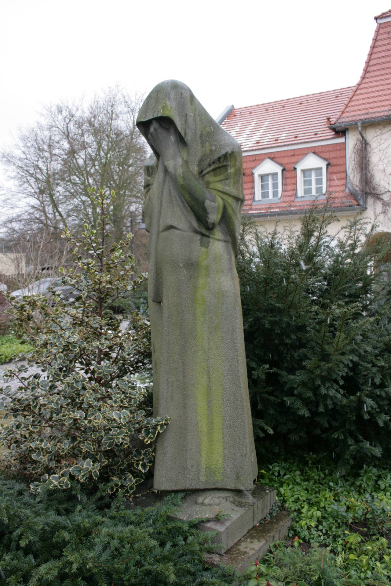 Auf einem niedrigen, quadratischen Standsockel aus Sandstein steht auf quadratischer Plinthe die überlebensgroße Figur einer barfüßigen, ansonsten durch Gewand und Kopfumschlag völlig verhüllten weiblichen Gestalt. Nur wenig zeichnet sich der Körper unter dem Gewand ab, genug jedoch, um zu erkennen, dass es sich um eine ältere, von körperlicher Arbeit gezeichnete Frau handelt. Die Hände hält sie trauernd und verzweifelt vor das Gesicht geschlagen. Das Gesicht selbst ist nicht zu erkennen (Jörg Kuhn).