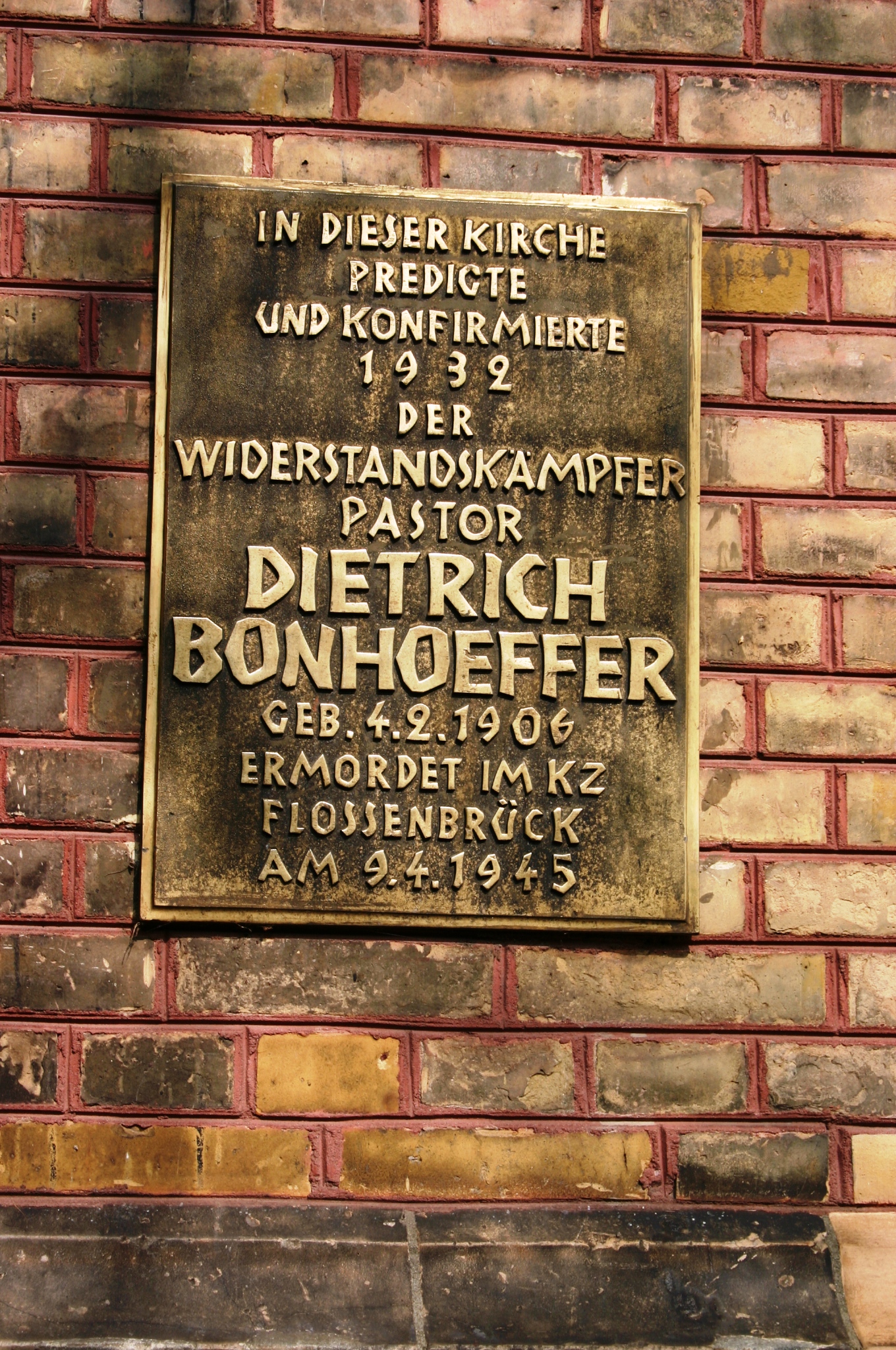 Rechteckige Granitplatte, darauf eine Bronzeplastik in Gestalt eines knienden männlichen Torsos in abstrakter Form. Zugehörig eine Gedenktafel. Auf der Granitplatte vorne vertieft die Inschrift DIETRICH BONHOEFFER.