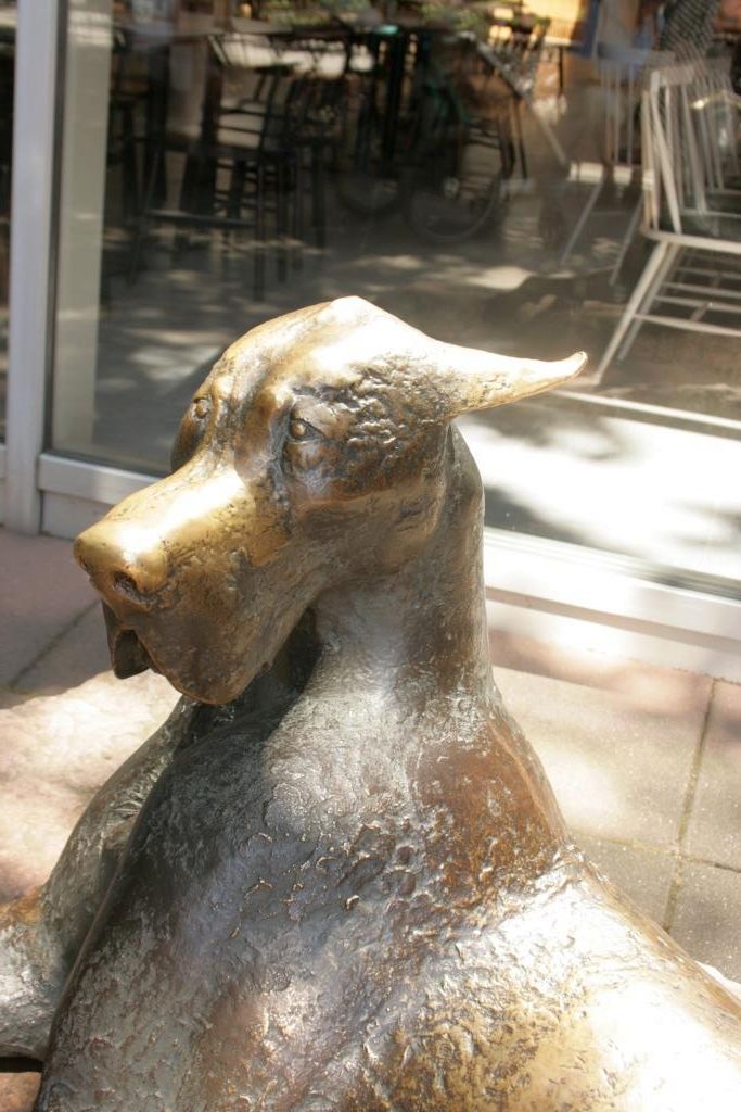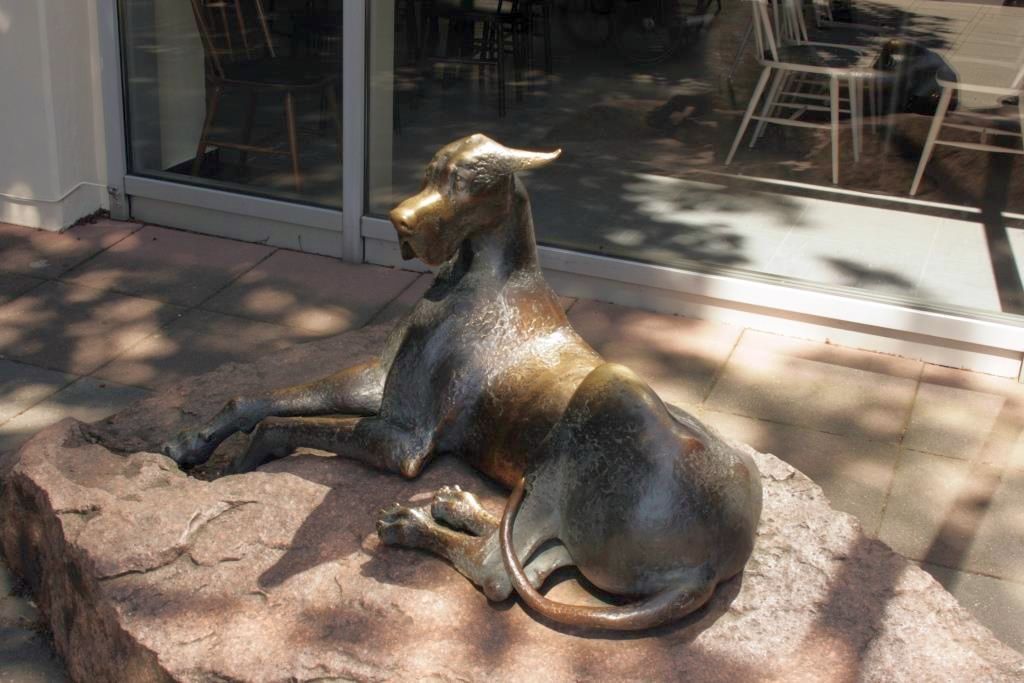 Auf einer fast matrazzenhaft wirkenden Steinplatte von annähernd rechteckigem Zuschnitt und grober Oberflächenglättung ruht, die Vorderläufe nach vorne weggestreckt und dabei eine natürliche Vertiefung im Steinmaterial ausnutzend, um die Pfoten naturgerecht in Überschneidung anzuordnen, eine in nur leichter Übergröße dargestellte Dogge. Ihr Blick ist aufmerksam auf einen imaginären Betrachter oder Gegenüber gerichtet. Trotz ruhiger Haltung entsteht so ein leichtes Moment der Anspannung, was die Darstellung recht lebendig erscheinen lässt (Jörg Kuhn).
