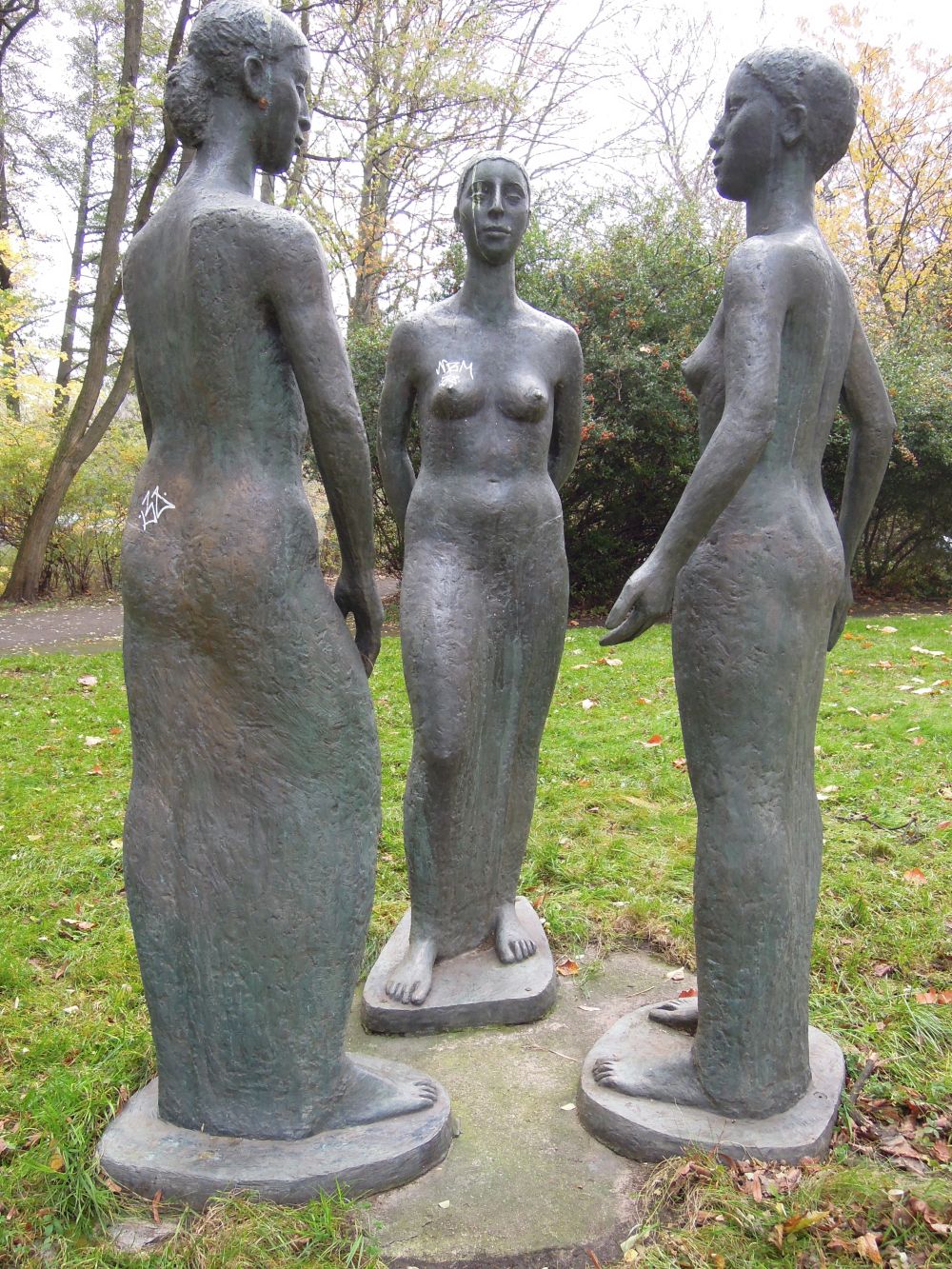 Die lebensgroße Figurengruppe von Carin Kreuzberg besteht aus drei gleichartig gestalteten, ganzfigürlichen Frauenplastiken, die zueinander gekehrt einen Kreis bilden und so das künstlerische Thema der „Drei Grazien“ evozieren. Jede Figur hat ihre eigene Plinthe. Diese unterschiedlich geformten Plinthen sind auf einer gemeinsamen, in den Rasen eingelassenen Betonplatte befestigt. Die schlanken, hochgewachsenen Frauengestalten zeigen eine „knappe, (…) überstraffe Form“ mit fließenden Konturen und haben einen „stark verinnerlichten Ausdruck“ (s. Hammer, Klaus: Plastisches Leben zeigt dezente Gefühle, in: Der Tagesspiegel vom 03.03.2000). Ihre im Oberkörperbereich nackten Körper sind statisch und wie gefroren formuliert (Jürgen Tomisch).
