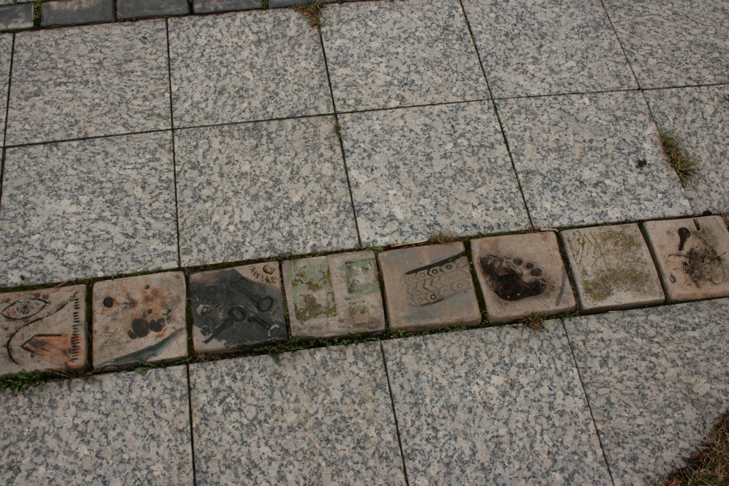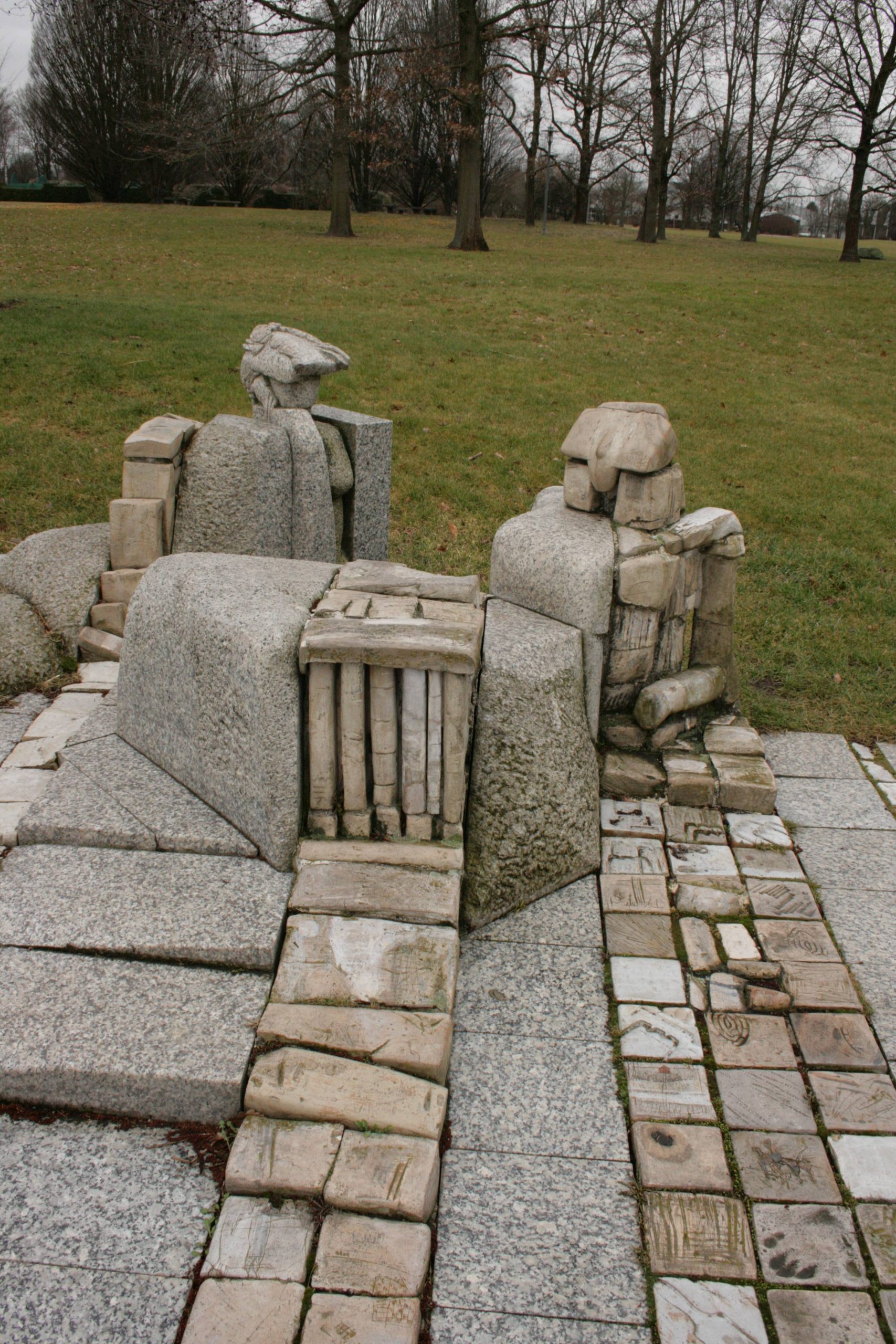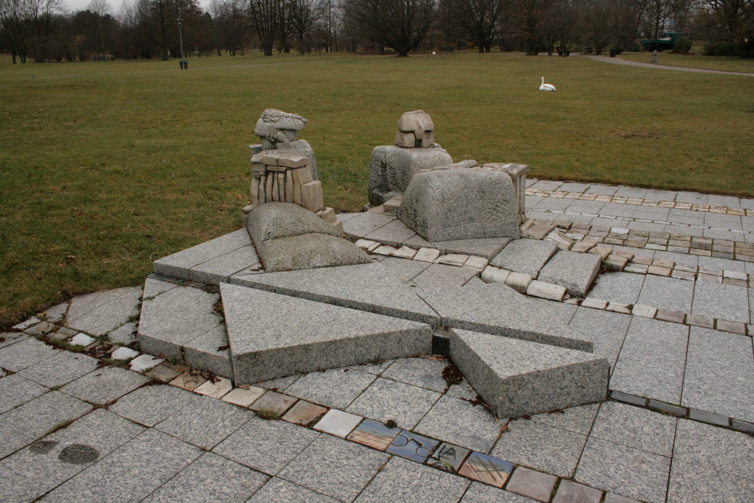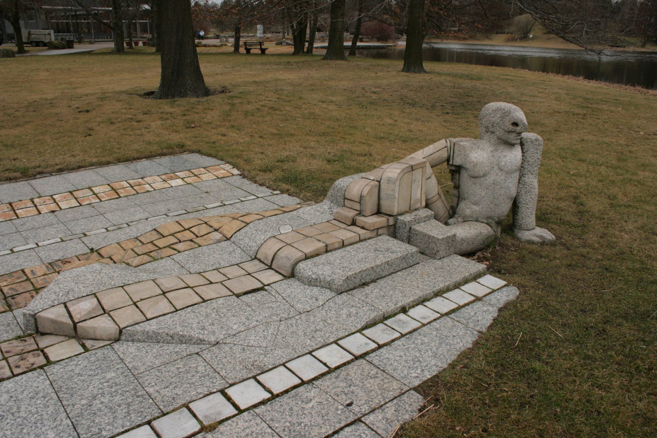 Durch den Granitplattenweg zum Seepavillon geteilt ist das Ensemble der „Drei Liegenden“. Wie auf einem Teppich aus Granitplatten und gestalteten und ungestalteten, teils glasierten quadratischen Terracottaplatten „liegen“ aus vielen Steinen und Terracotten zusammengesetzte abstrakt aufgefasste, menschliche Figuren. Zum See hin liegt ein einzelner Mann mit muskulösem Oberkörper, den linken Arm auf die flach auf dem Boden aufliegende Hand gestützt in selbstbewusster Pose, das Gesicht ist maskenhaft ausgebildet. Die beiden Liegenden auf der gegenüberliegenden Hälfte jenseits des Weges scheinen weiblich zu sein. Sie wirken verschleiert und hinter einer Barriere aus Steinen verschanzt. Über den „Teppich“ zwischen den Figuren sind auf den Terracottaplatten „Fußabdrücke“ verteilt. Inhaltlich haben die drei Künstler offensichtlich das Verhältnis zwischen Mann und Frauen, männliche Dominanz gegenüber unterdrückten Frauen thematisiert. Zwischen den beiden Geschlechtern befinden sich die Barriere des Weges und eine weitläufige Fläche, die nur auf den zweiten Blick erkennbar durch die keine Elemente und Fußabdrücke in den Terracottaplatten überwunden wird. Der Kontrast zwischen harten Granitgestein und dem „weichen“ Material Terrakotta ist inhaltlich miteinbezogen (Susanne Kähler).