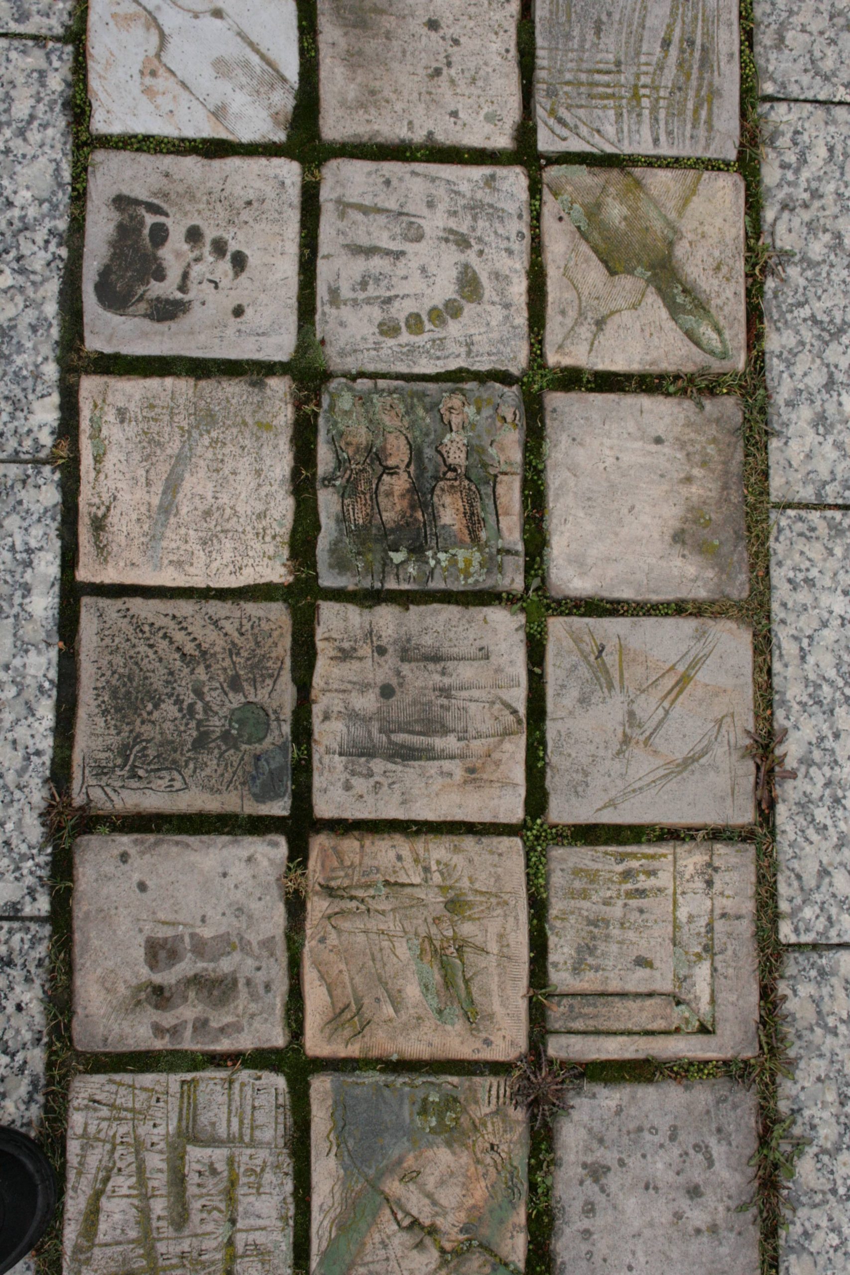 Durch den Granitplattenweg zum Seepavillon geteilt ist das Ensemble der „Drei Liegenden“. Wie auf einem Teppich aus Granitplatten und gestalteten und ungestalteten, teils glasierten quadratischen Terracottaplatten „liegen“ aus vielen Steinen und Terracotten zusammengesetzte abstrakt aufgefasste, menschliche Figuren. Zum See hin liegt ein einzelner Mann mit muskulösem Oberkörper, den linken Arm auf die flach auf dem Boden aufliegende Hand gestützt in selbstbewusster Pose, das Gesicht ist maskenhaft ausgebildet. Die beiden Liegenden auf der gegenüberliegenden Hälfte jenseits des Weges scheinen weiblich zu sein. Sie wirken verschleiert und hinter einer Barriere aus Steinen verschanzt. Über den „Teppich“ zwischen den Figuren sind auf den Terracottaplatten „Fußabdrücke“ verteilt. Inhaltlich haben die drei Künstler offensichtlich das Verhältnis zwischen Mann und Frauen, männliche Dominanz gegenüber unterdrückten Frauen thematisiert. Zwischen den beiden Geschlechtern befinden sich die Barriere des Weges und eine weitläufige Fläche, die nur auf den zweiten Blick erkennbar durch die keine Elemente und Fußabdrücke in den Terracottaplatten überwunden wird. Der Kontrast zwischen harten Granitgestein und dem „weichen“ Material Terrakotta ist inhaltlich miteinbezogen (Susanne Kähler).