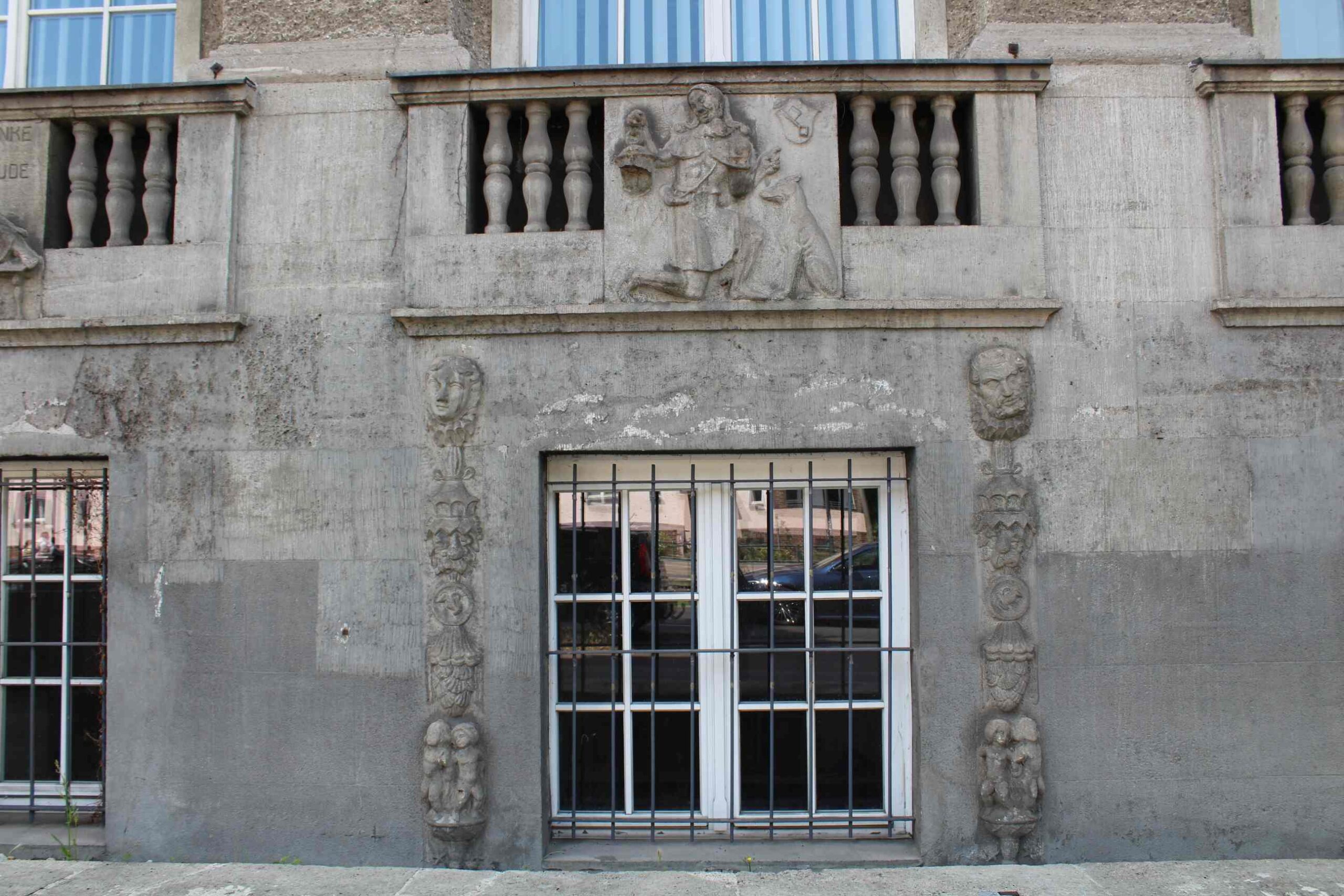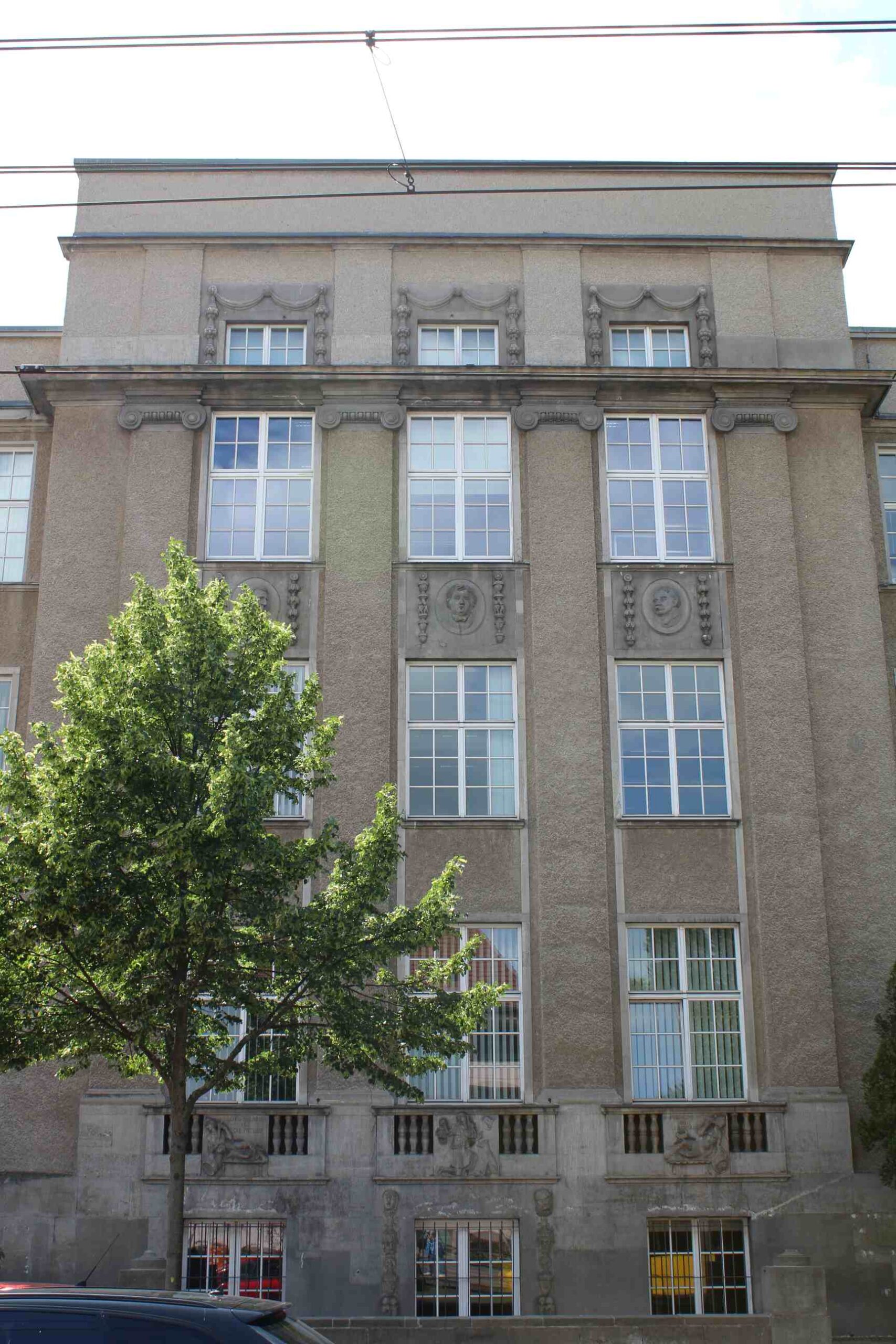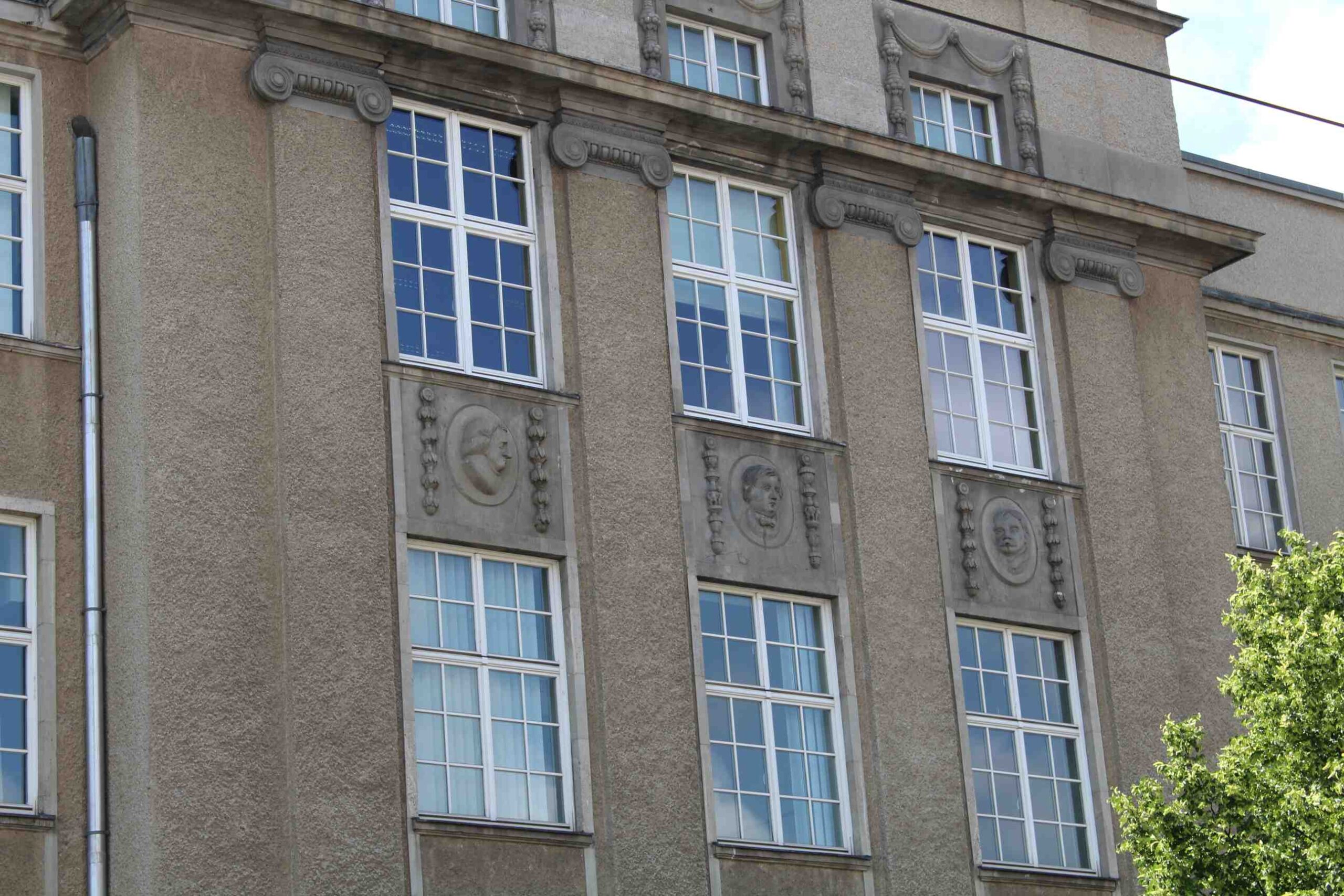 Die Brüstungsfelder unterhalb der Fenster im dritten Geschoss sind mit drei hochovalen Portraitmedaillons verziert, die – im Gegensatz zu denen am älteren Gebäude des Gymnasiums – keine Inschriften aufweisen. Die männlichen Köpfe sind weitaus gröber gearbeitet als die Medaillons an dem wenige Jahre zuvor errichteten Bauteil. Es ist unklar, um wen es sich bei den dargestellten Personen handelt (Nicola Vösgen).