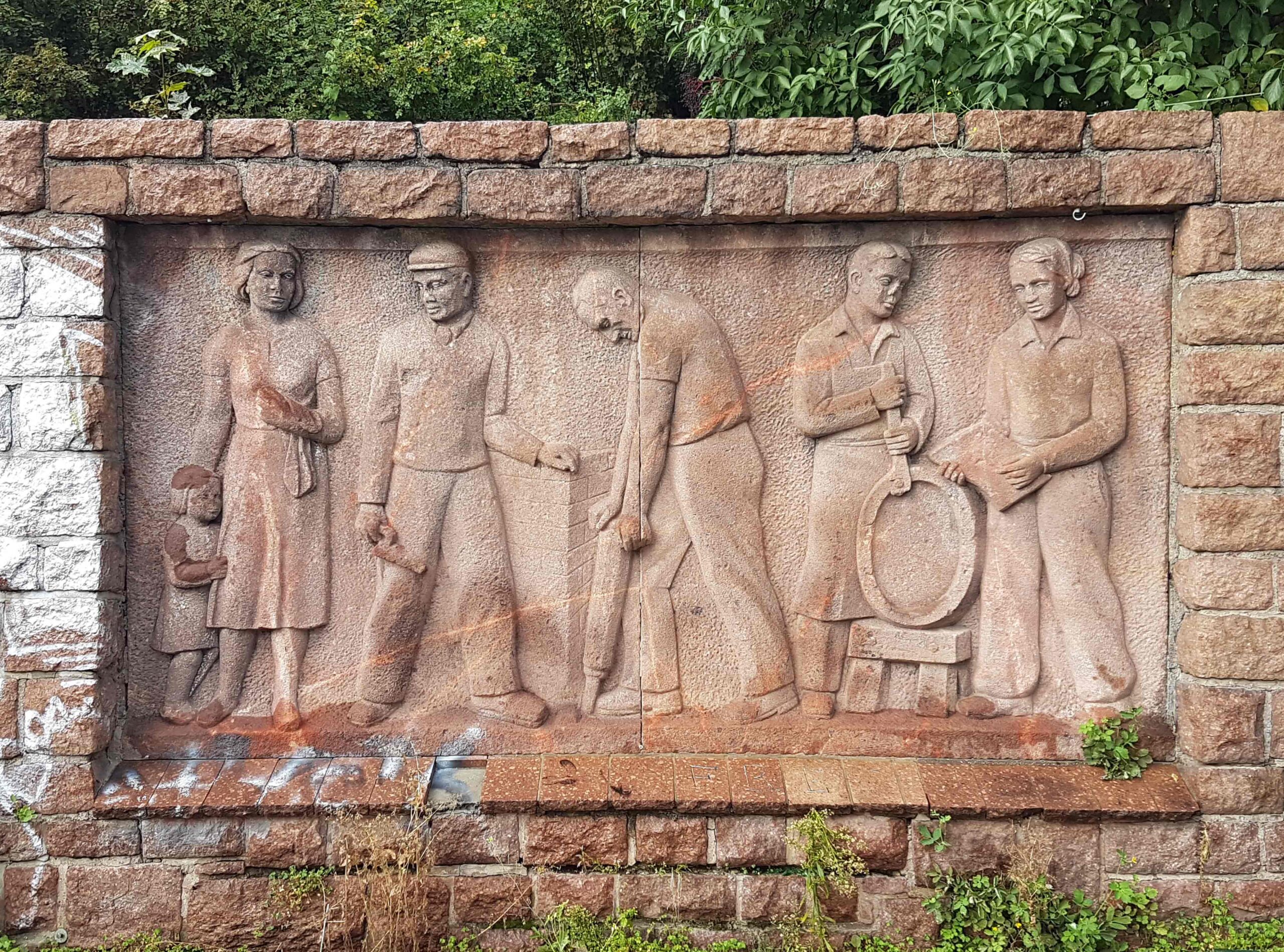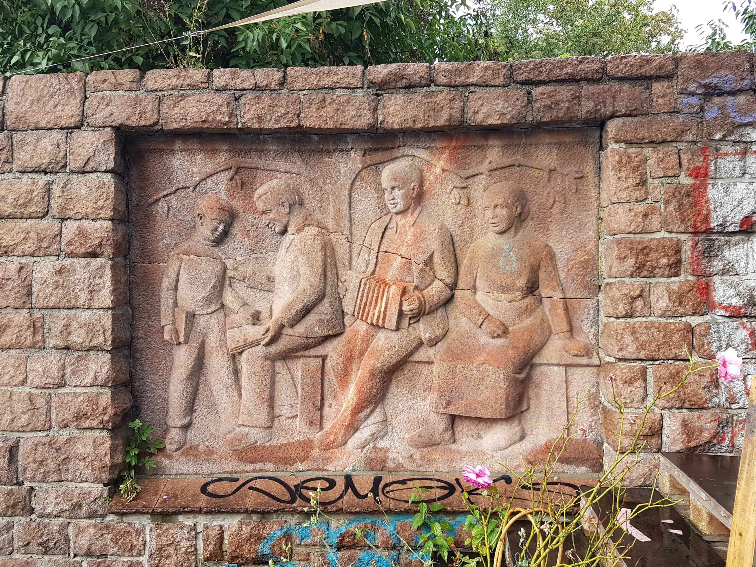 An der Nordseite der aus grob behauenen Porphyrsteinplatten gemauerten „Weinbergsmauer“ sind drei mehrfigurige, rechteckige Reliefs eingelassen. Das mittlere der Reliefs ist etwas breiter, als die beiden flankierenden. Alle drei Reliefs zeigen thematisch aufeinander bezogene Genreszenen. Das mittlere, große Relief zeigt von links ein Kind mit seiner Mutter, rechts davon zwei Männer und zwei Frauen mit ihren Arbeitsgeräten. Das Relief links zeigt einen Jungen und drei Mädchen unter einem Baum im Park beim Ballspiel. Das rechte Relief zeigt im mittleren Hintergrund einen Baum. Links vom Stamm sitzt ein Mann, einem Knaben ein Buch zeigend. Rechts des Baumes, auf einer Bank, sitzen ein Mann mit Ziehharmonika und eine ältere Frau, die ihm ruhig lauscht. Während das mittlere Relief die Arbeit (Anlage und Aufbau des Parks) thematisiert, scheint auf den beiden anderen Reliefs die alltägliche Freizeitnutzung des Parks dargestellt zu sein. Die Darstellung ist genrehaft und betont einfach (Jörg Kuhn).