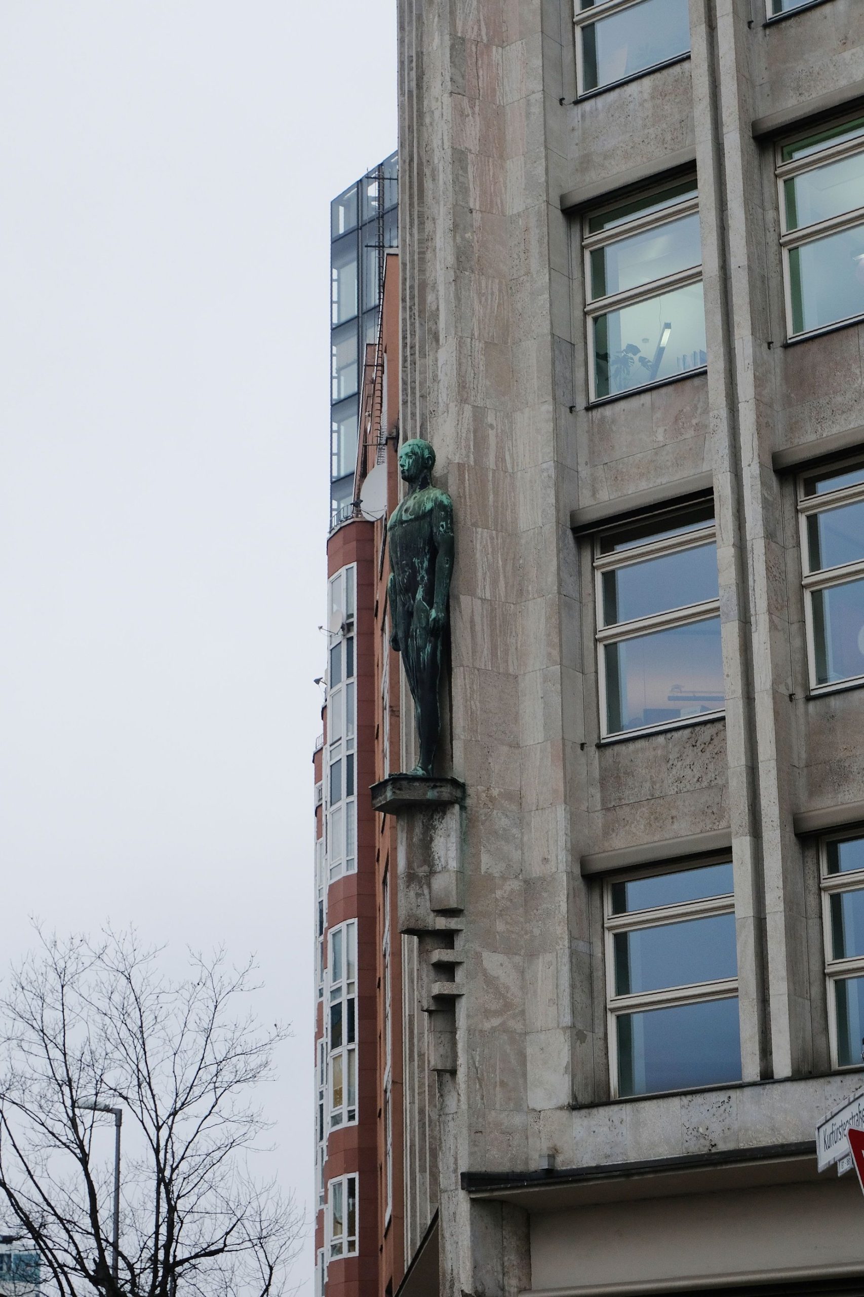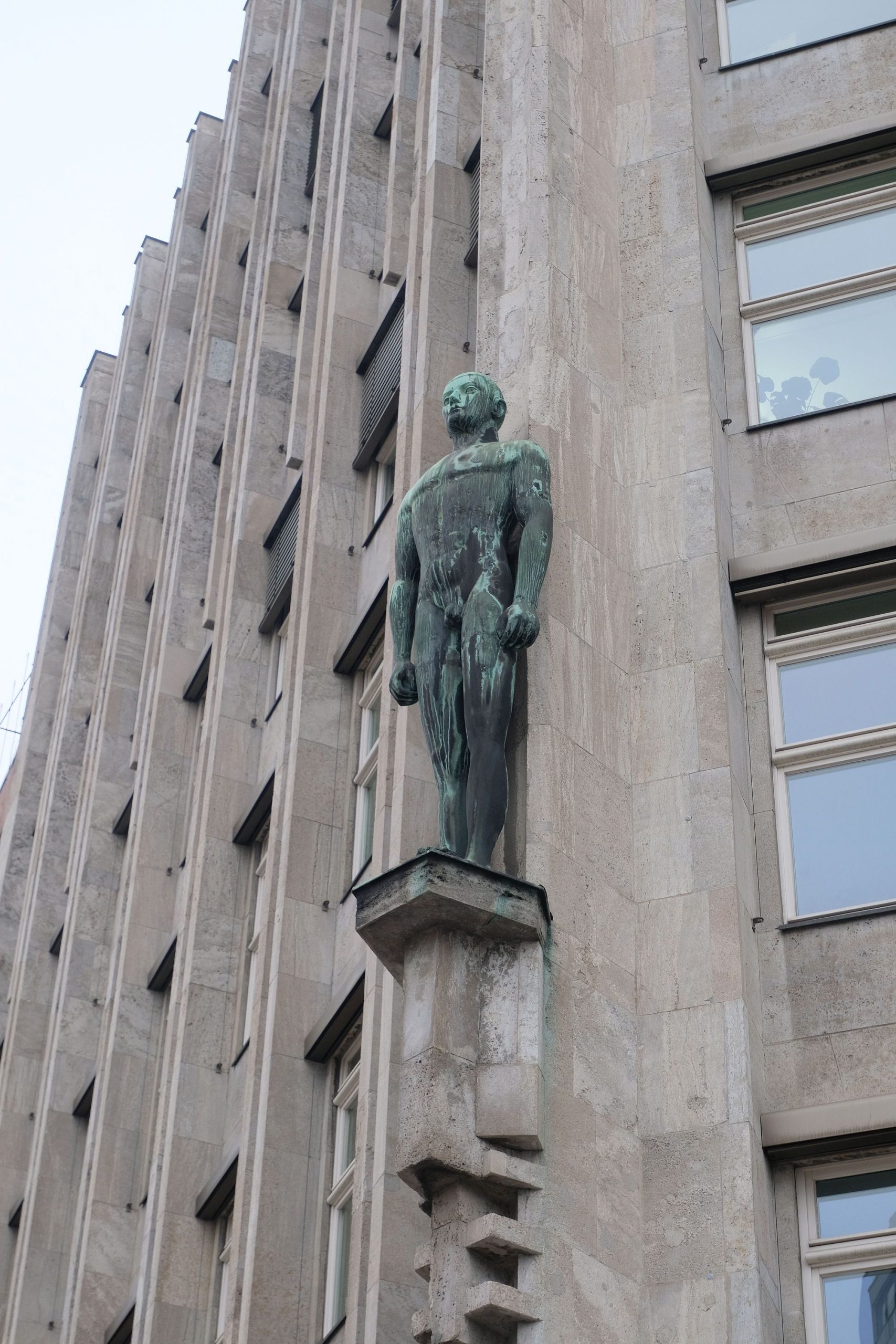 An einer Eckstrebe des Lenz-Hauses an der Kurfürstenstraße 87 ist eine vollplastische, überlebensgroße männliche Plastik angbracht. Sie ist unbekleidet und recht starr in der Körperhaltung. Die Figur steht auf einer schmalen Plinthe und einem aus der Fassade ragenden Travertinsockel (Pauline Ahrens).