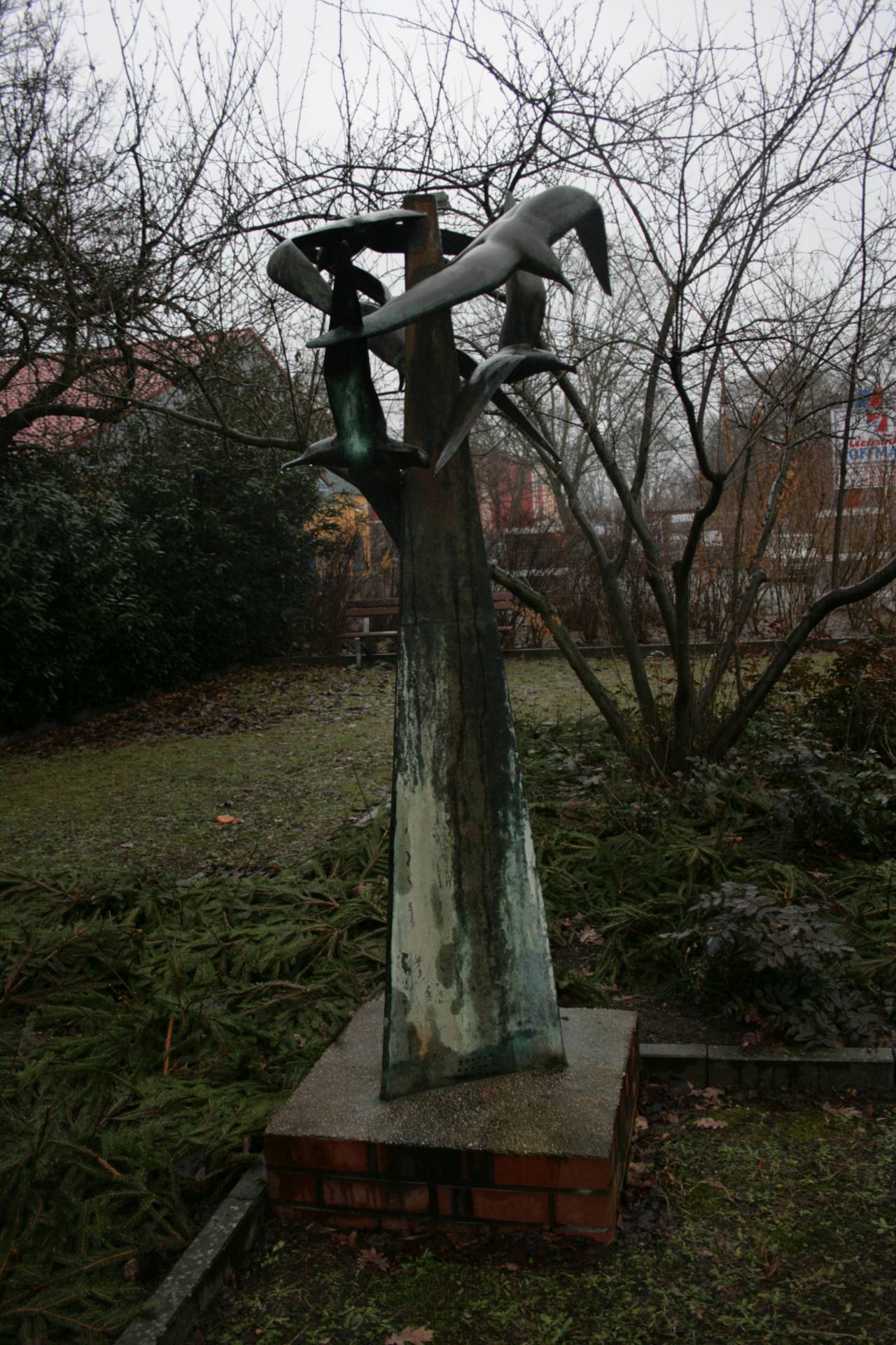 Im Zentrum zweier hier über Eck aneinanderstoßender, rechteckiger, eingefasster Pflanzbeete steht auf niedrigem Klinkersockel (Beton mit Verblendklinker?) mit Betonabdeckung eine Plastik aus Bronze, Bronzeblech und Eisen. Die Stele mit dreieckigem Grundriss verjüngt sich jäh nach oben hin. Im oberen Bereich sind fünf in abstrahierend-summarischer Formulierung dargestellte fliegende Möwen in variationsreicher Anordnung angeschweißt. In unterschiedlicher Höhe scheinen sie die Stele zu umkreisen. Sie sind mit der Stele und auch untereinander verbunden. Am Stelenfuß sind verschiedene Öffnungen zu finden. Es sind die Reste der ehemaligen Brunnenfunktion (Jörg Kuhn, Susanne Kähler).