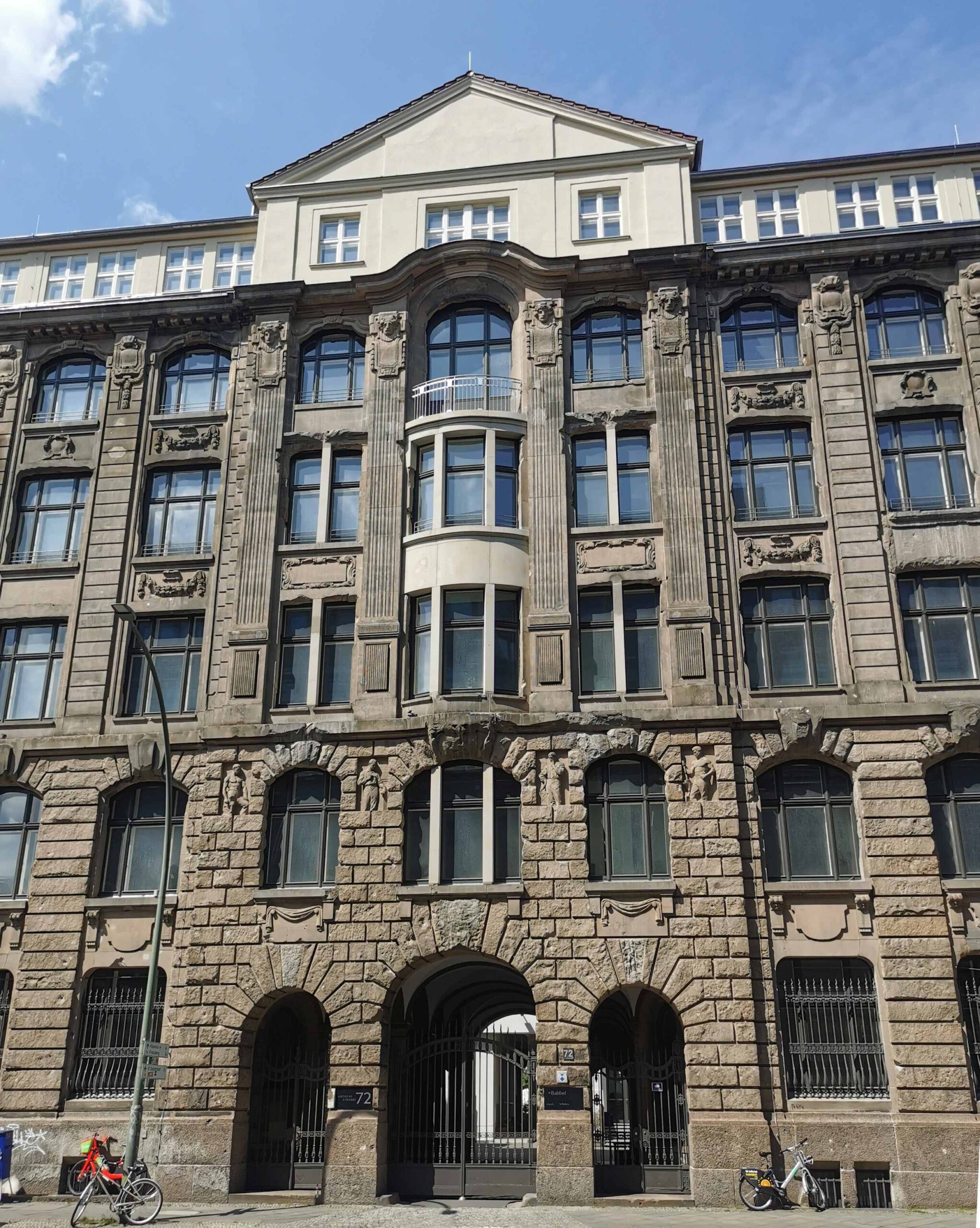 Die Fassade ist in einer neobarocken Kolossalordnung gehalten. Über dem zweigeschossigen Rustikasockel erheben sich, getrennt durch ein Gurtgesims, die drei Obergeschosse. Oberhalb des Hauptgesims schließt ein Dreiecksgiebel das Attikageschoss ab. Ein dreiachsiges Mittelrisalit betont die große Toreinfahrt mit den beiden Personeneingängen (Nicola Vösgen).