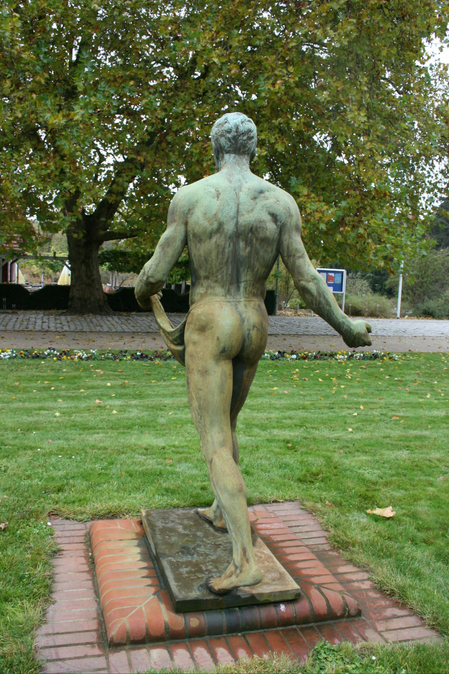 Auf einem gemauerten rechteckigen Sockel aus rotem, hartgebrannten Klinker steht über längsrechteckiger Plinthe in Schrittstellung die weitgehend unbekleidete, muskulöse Figur eines Sämannes, der das Tuch mit dem Saatgut um die Hüfte geschlugen trägt und dieses mit der linken Hand aufgespannt hält. Mit der rechten Hand bringt er in weitem Bogen das Saatgut aus. Der Blick ist konzentriert nach vorne ausgerichtet, der Kopf kaum geneigt. Die Bronze ist grünlich patiniert (Jörg Kuhn, Susanne Kähler).