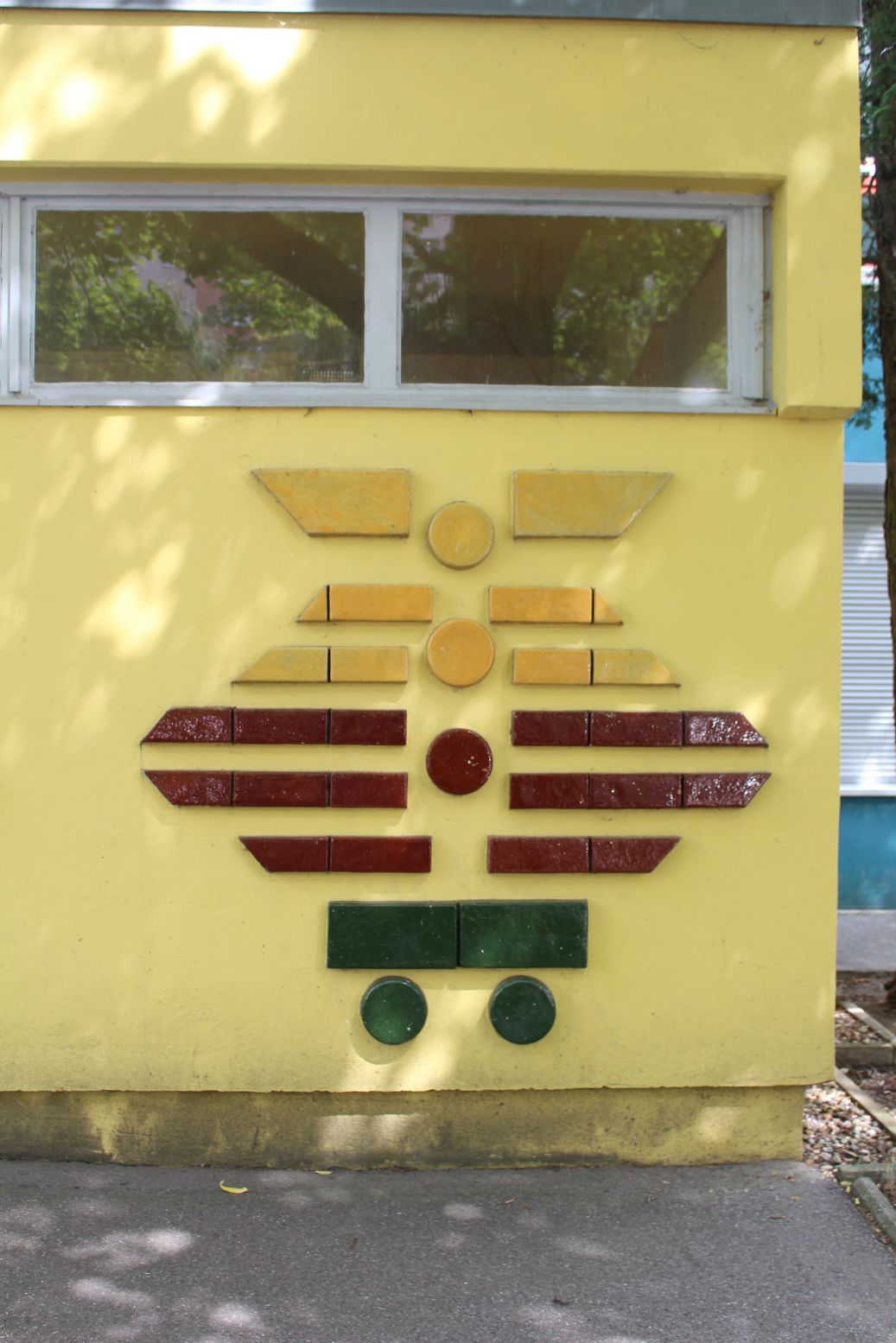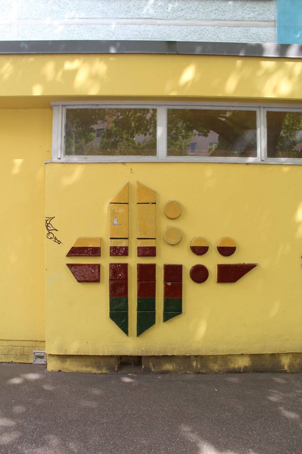 Zwei Keramikreliefs. die an einem Eingangsvorbau angebracht sind. Sie bestehen aus einzelnen geometrischen Keramikelementen, welche in abstrahierter Form Tiere (Hahn und ein weiterer Vogel) darstellen. Die Keramikelemente sind farbig gelb, rot und grün glasiert. (vgl. „Kunst in der Großsiedlung“, 2008, S. 71)