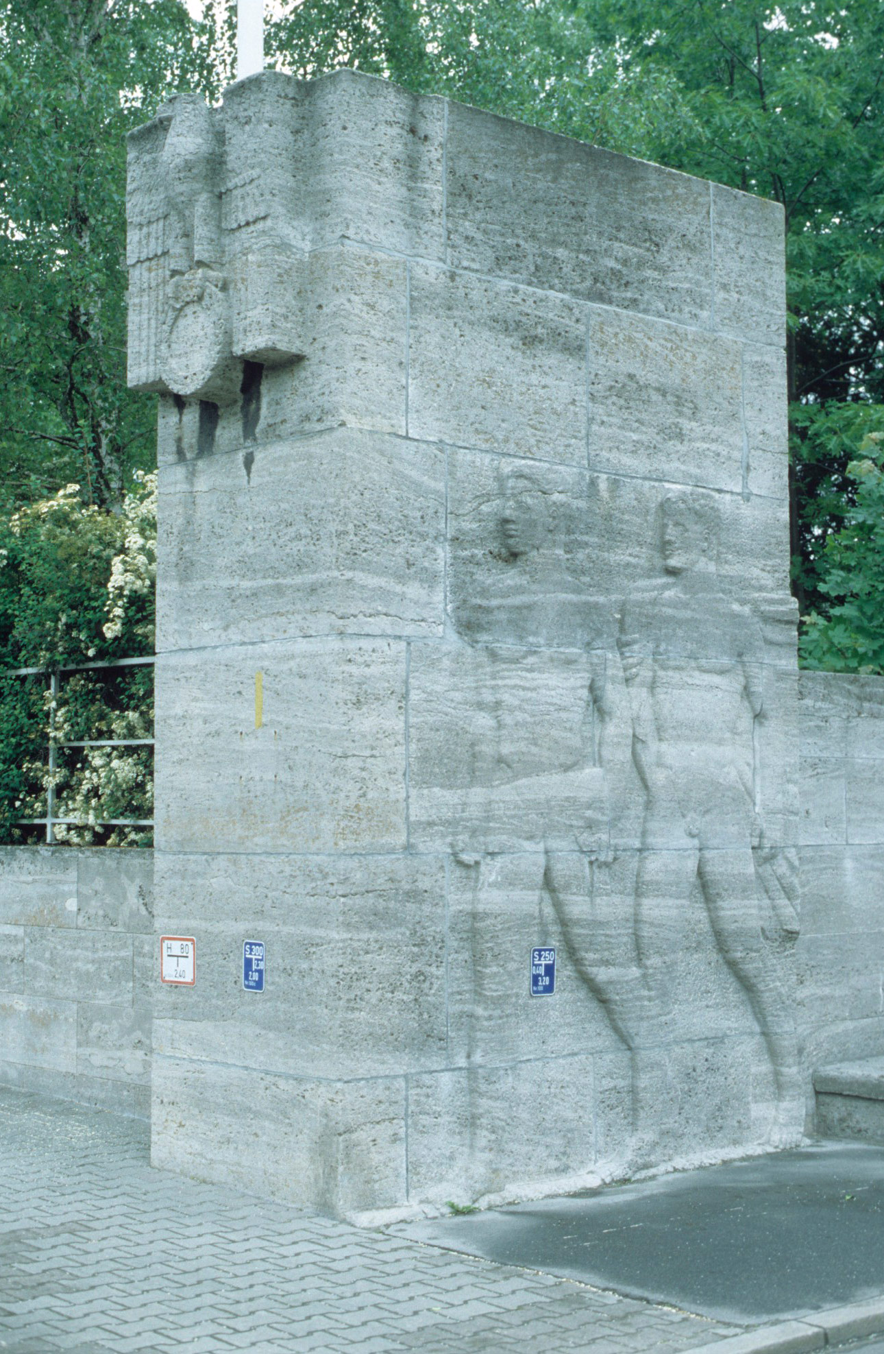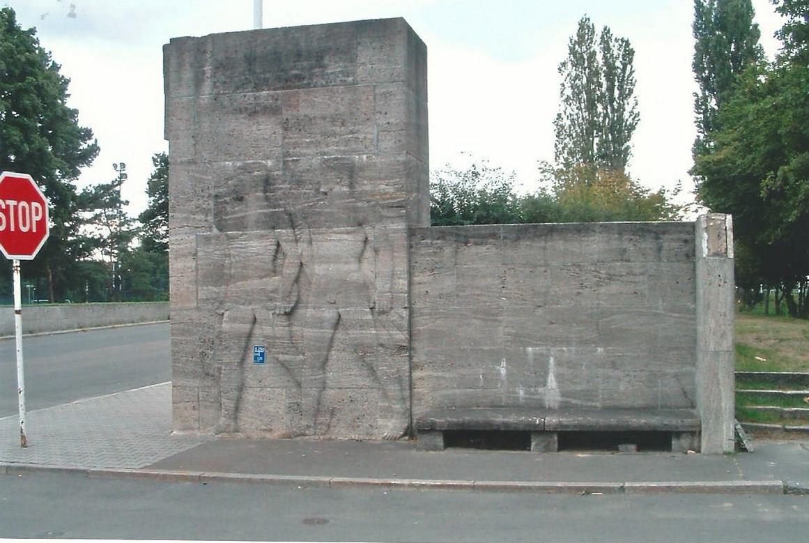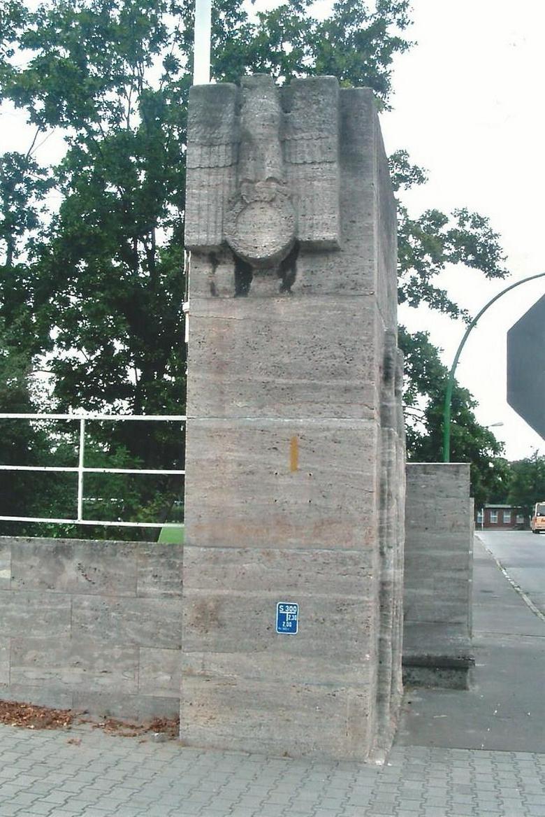 An der südöstlichen Ecke des Hindenburgplatzes, in der Nähe des südlichen Zugangs zum Jahnplatz, steht als Mauerabschluss ein aus Werksteinquadern zusammengesetzter Eckpfeiler mit einer stilisierten Darstellung zweier männlicher Athleten im Relief. Die Schmalseite trägt an der Oberkante das Relief eines Adlers, lorbeerumkränzt und auf einem Hakenkreuz sitzend als Hoheitszeichen der NSDAP (Symbol entfernt, war vermutlich aus Bronze). Das flache Relief mit den beiden Männern nimmt die unteren beiden Drittel der nach Osten weisenden Seite des Pfeilers ein. Der vordere der beiden heroisch wirkenden Männer trägt in seiner linken Hand eine Diskusscheibe, der hintere hält ein wehendes Tuch über seiner rechten Schulter (Susanne Kähler).
