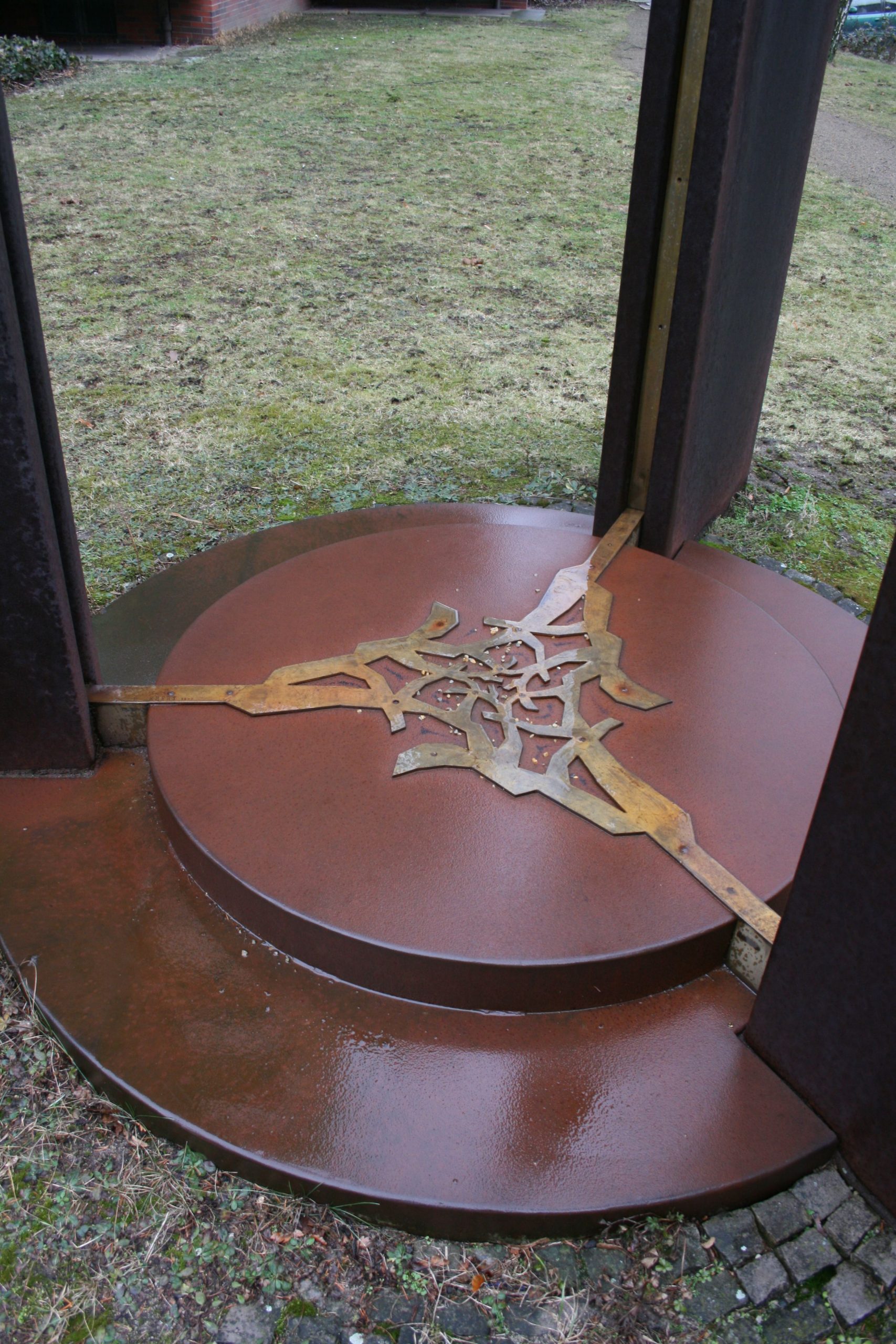 Abstrakte Eisenplastik mit künstlicher Korrosion und Messingapplikationen. Um einen Mittelpunkt, der gestalterisch als zweistufige Basis aus Eisen mit Messingornament gestaltet ist, umgeben und durchdringen drei sehr hohe Stelen aus je zwei rechteckigen Eisenplatten, die je eine Messingplatte sandwichartig einschließen, das Zentrum. Ein filigranes Messingornament verbindet als Krönung abschließend die Stelenelemente (Jörg Kuhn).