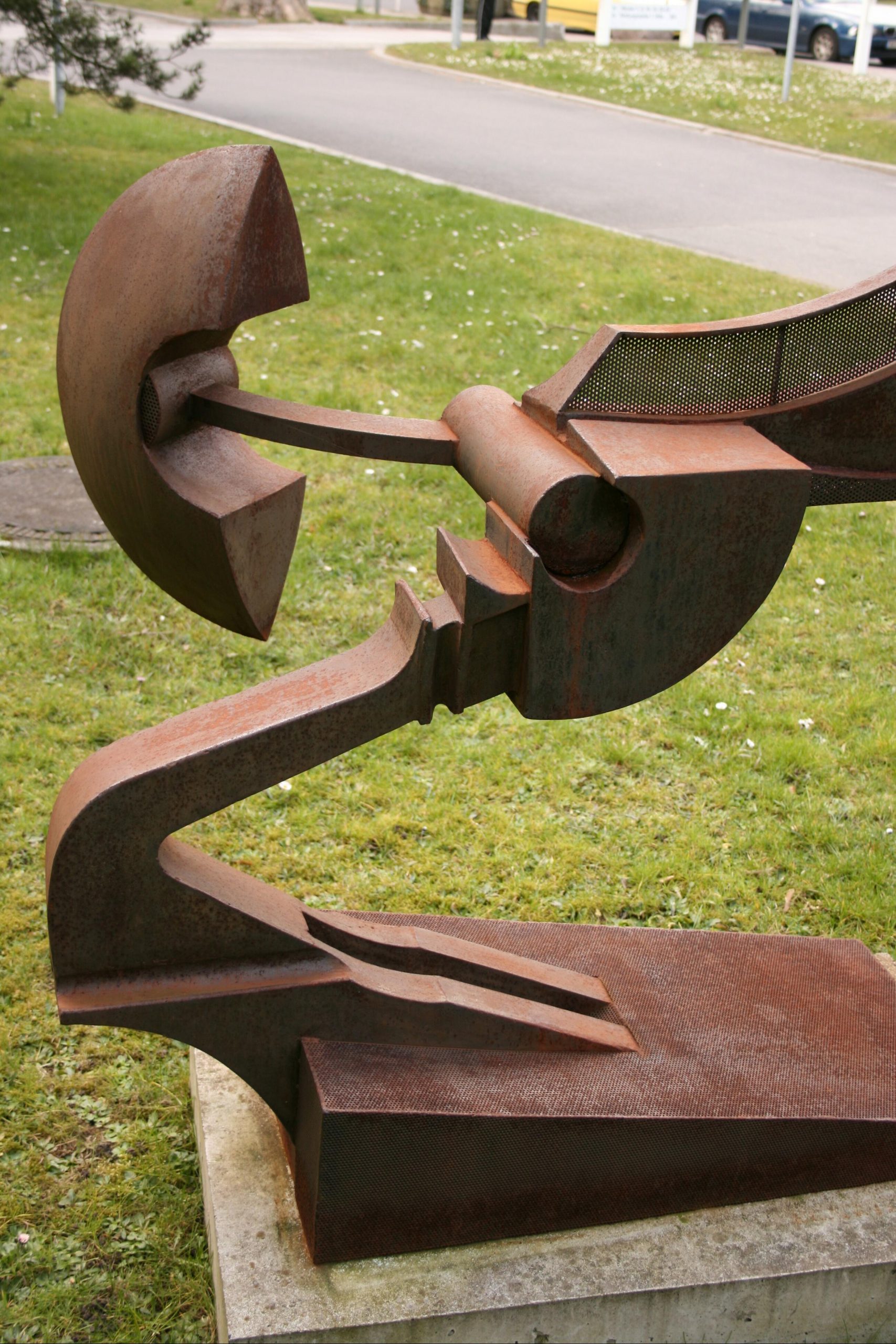 Der Künstler, Klaus Duschat, geboren in Südafrika, hat in zwischen 1975 und 1984 Bildhauerei studiert, u. a. bei Bernhard Heiliger. In Berlin war er Mitglied der Gruppe ODIOUS. 1986 gewann er ein Arbeitsstipendium des Senators für kulturelle Angelegenheiten Berlin (vgl.: http://www.klausduschat.de; Zugriff: 5.7.2008, 18:37). Bei der abstrakten Stahlplastik von Duschat handelt es um ein Objekt, das als Leihgabe aus dem Besitz der Berlinischen Galerie im Skulpturengarten des Auguste-Viktoria-Krankenhauses Aufstellung fand. Das Werk steht an relativ prominenter Stelle auf der Rasenfläche rechts vom Hauptzugang vor dem Altbau. Das Konzept zu einem Skulpturengarten auf dem Gelände des Auguste-Viktoria-Krankenhauses wurde bereits Ende der 1980er Jahre entwickelt und geht u. a. auf die Initiative des dort tätigen Chefarztes Professor Dr. med. Manfred L’age zurück. Maßgebliche Gedanken waren die Fragen um Trost und Genesungshilfe für Kranke und Besucher. Zeitgenössische Kunst sollte Denkanstöße während der Grenzerfahrung einer Krankheit geben. Beteilig an der Ausarbeitung waren neben L’age die Kunsthistoriker Jörn Merkert und und Eberhard Roters (Berlinische Galerie) sowie der Architekt Thomas Baumann und der Gartenarchitekt Elmar Knippschild. Finanzielle Förderung erfuhr das Projekt ab 1990 vom Senator für Bauen, Wohnen und Verkehr als „baubegleitendes gestrecktes Verfahren“. Im Mai 1999 wurde der Skulpturengarten des Auguste-Viktoria-Krankenhauses eröffnet, damals stellten hier 21 Künstler aus (einige Plastiken befanden und befinden sich zusätzlich im Innenraum). Die Ausstellung wurde 2000 erweitert und hat sich seitdem vielfach verändert, einige der ursprünglichen Objekte stehen heute nicht mehr vor Ort, zahlreiche andere, hauptsächlich Leihgaben der Berlinischen Galerie und Leihgaben und Schenkungen einzelner Künstler sind hinzugekommen (Jörg Kuhn, Susanne Kähler).