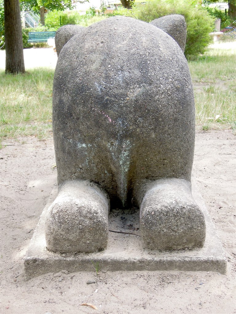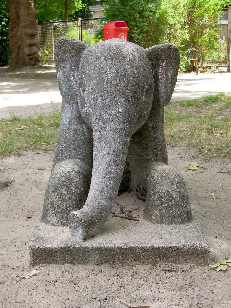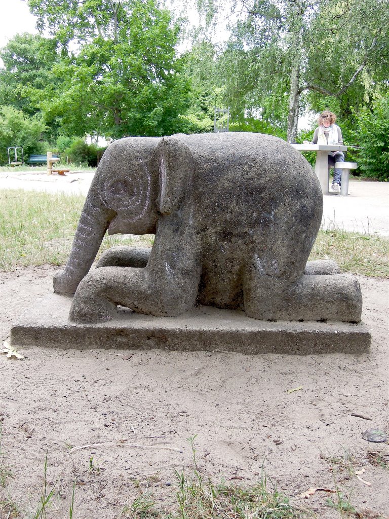 Auf dem Spielplatz steht auf einer flachen Betonplinthe ebenerdig die Betonplastik eines Elefanten. Die 56cm hohe Spielplastik steht so in angemessener Höhe für die Kinder. Der Elefant ist in einer typischen auf den Kniegelenken gestützten Ruheposition dargestellt. Seine charakteristischen Attribute sind aufs Wesentliche reduziert: Rüssel, große Ohren, dickleibig und ein runder Rücken, der zum Hinaufklettern einlädt (Jürgen Tomisch/Barbara Anna Lutz).
