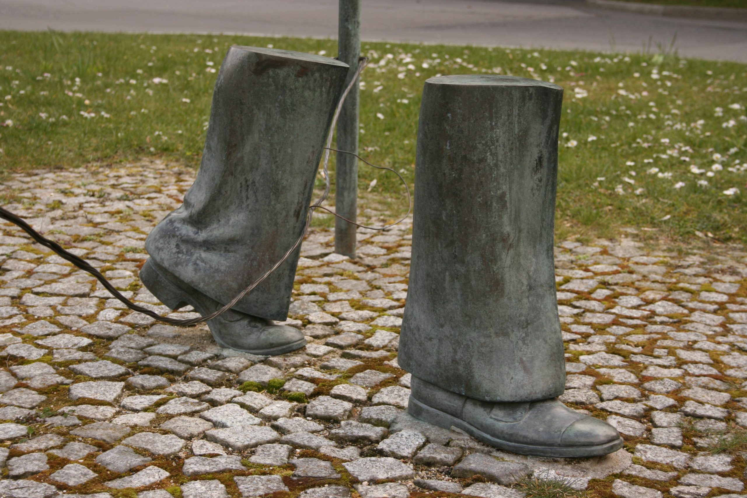 In die Rasenfläche wurde ein rechteckiges mit kleinen Granitquadern gepflastertes Feld eingefügt, über das sich ein an zwei Bronzepfählen befestigter Draht spannt. An der einen Seite der so gebildeten Grenze stehen zwei realistisch gebildete, mit Straßenschuhen und langer Anzughose bekleideten Unterschenkel, die unterhalb der Knie mit gerader Fläche abgeschnitten sind: eine imaginäre Person steht mit geschlossenen Beinen. Eine weitere imaginäre Person, von der ebenfalls nur die Unterschenkel dargestellt sind, schreitet über den Draht auf die andere Person zu, droht möglicherweise sogar über den Draht zu stolpern (Jörg Kuhn, Susanne Kähler).