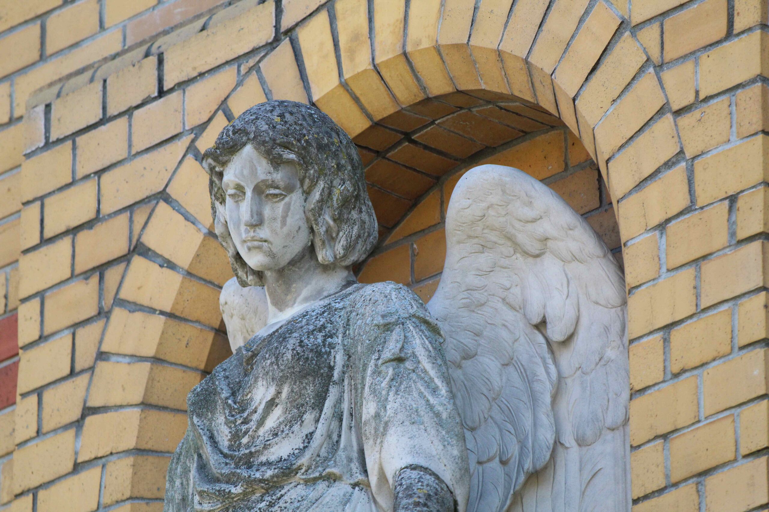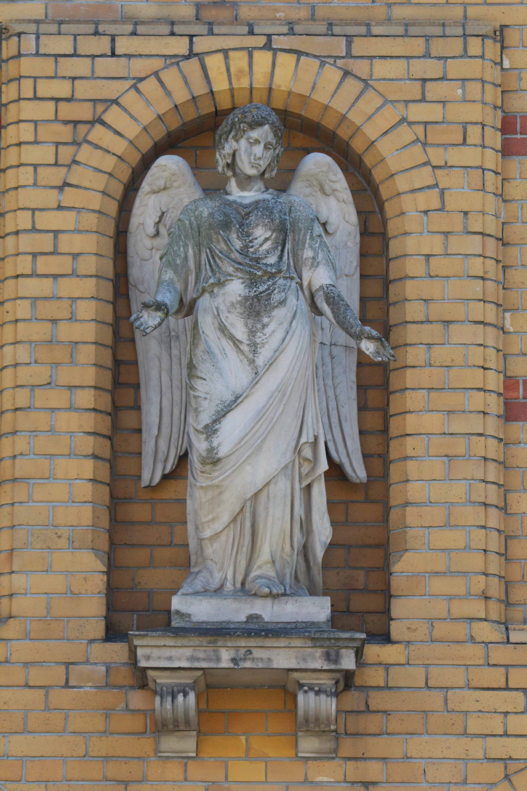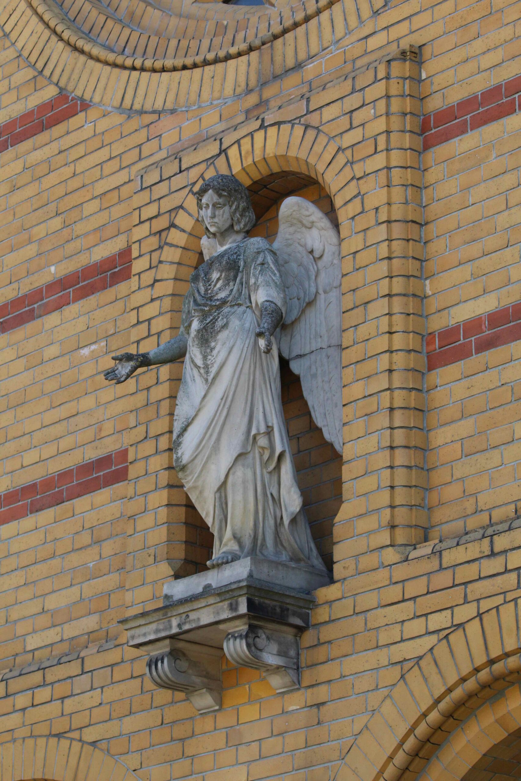 Oberhalb des Doppelportals der ehem. Städtischen Heil- und Pflegeanstalt für Epileptische in Wuhlgarten steht auf einem von zwei Konsolen getragenen Podest die Figur eines Engels mit gesenkten Flügeln. Er hat den Kopf nach links geneigt und blickt auf die Kirchenbesucher herab, denen er zudem die Hände entgegen streckt (Nicola Vösgen).