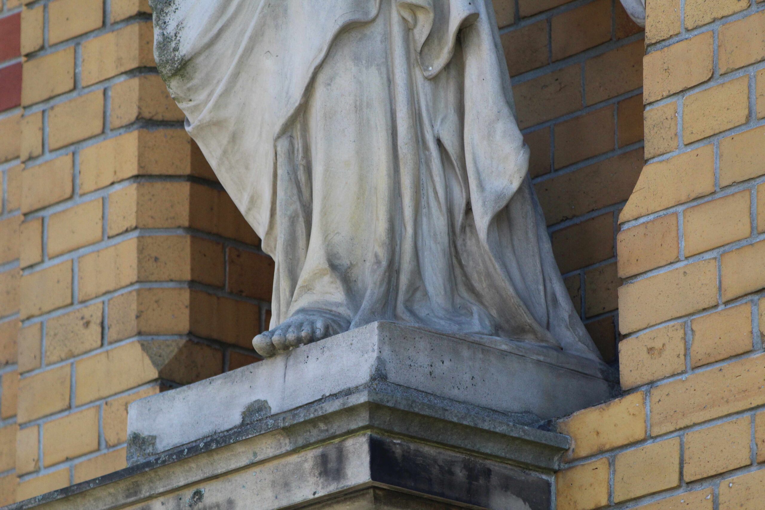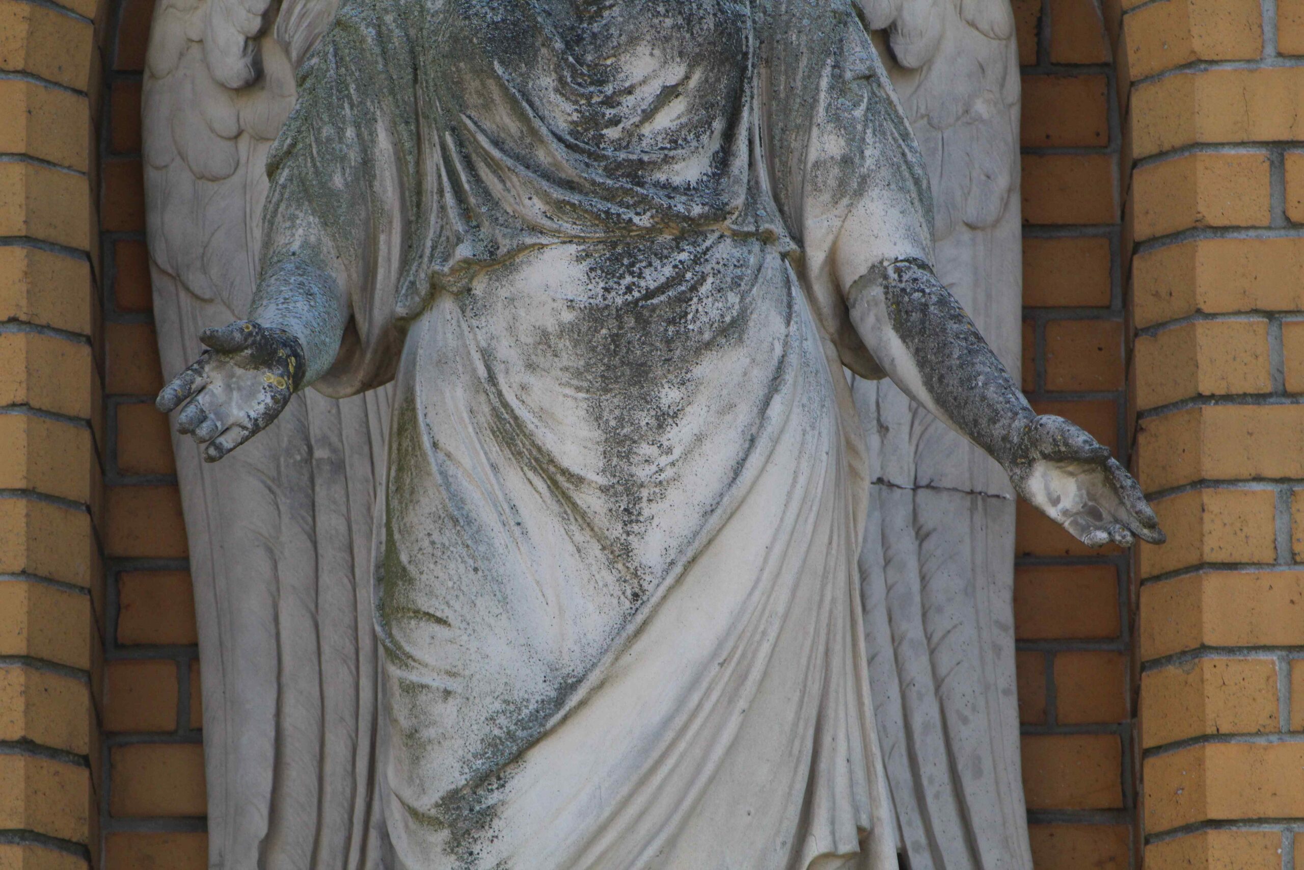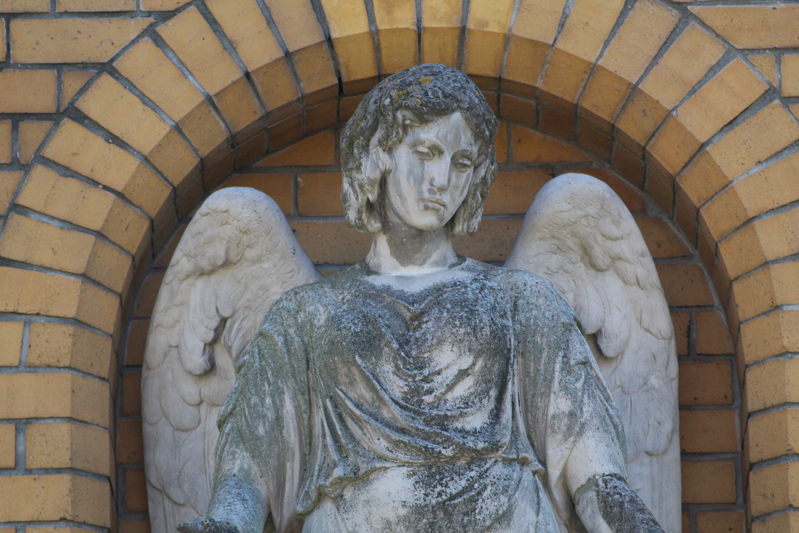 Oberhalb des Doppelportals der ehem. Städtischen Heil- und Pflegeanstalt für Epileptische in Wuhlgarten steht auf einem von zwei Konsolen getragenen Podest die Figur eines Engels mit gesenkten Flügeln. Er hat den Kopf nach links geneigt und blickt auf die Kirchenbesucher herab, denen er zudem die Hände entgegen streckt (Nicola Vösgen).