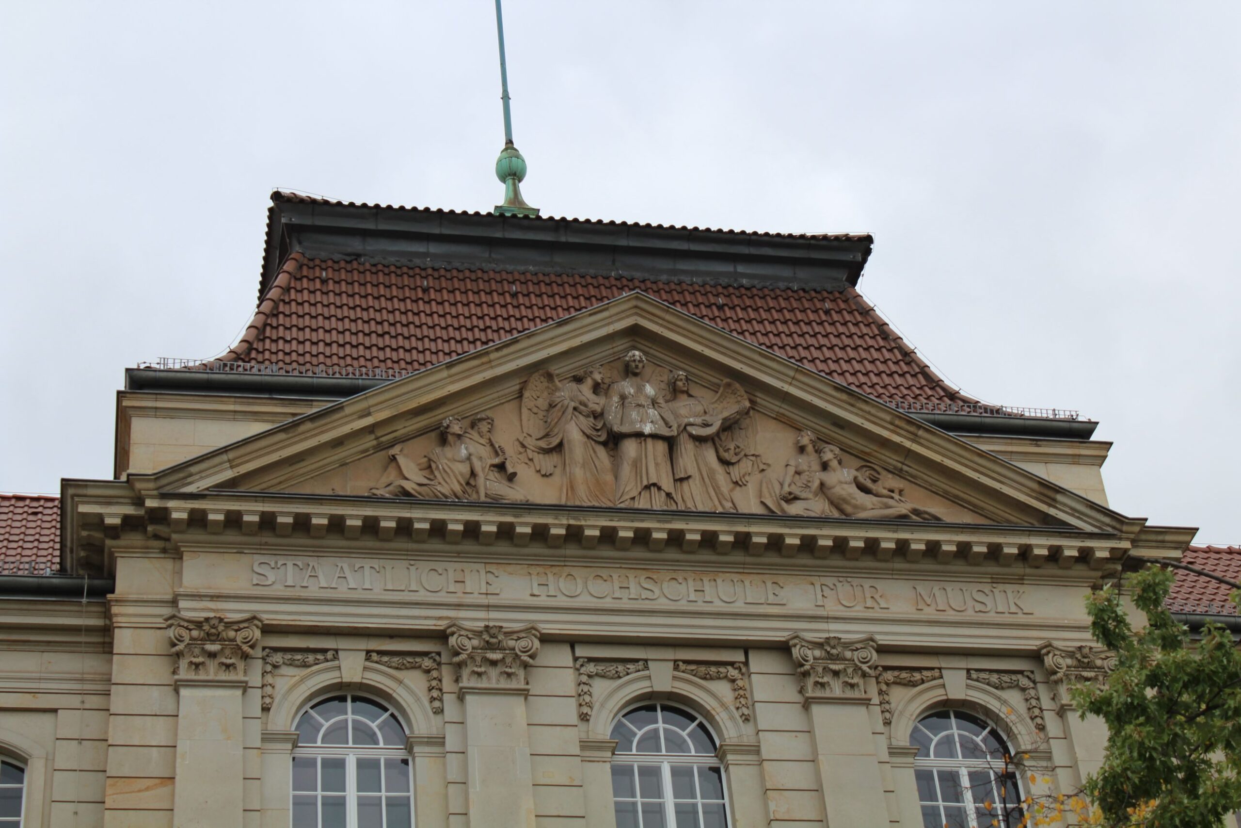 In der Mitte des Giebelfeldes der Hochschule für Musik stehen drei musizierende Engel, von denen der Mittlere ein Notenheft und sein Begleiter rechts eine Mandoline hält. Der links stehende Engel ist singend dargestellt. In der linken Giebelschräge sitzt ein Komponist mit Notenblatt und Schreibfeder in der Hand, neben ihm kniet ein Flötenspieler. In der rechten Giebelschräge kauert ein Hirtenpaar, das der Musik gespannt lauscht (Nicola Vösgen).